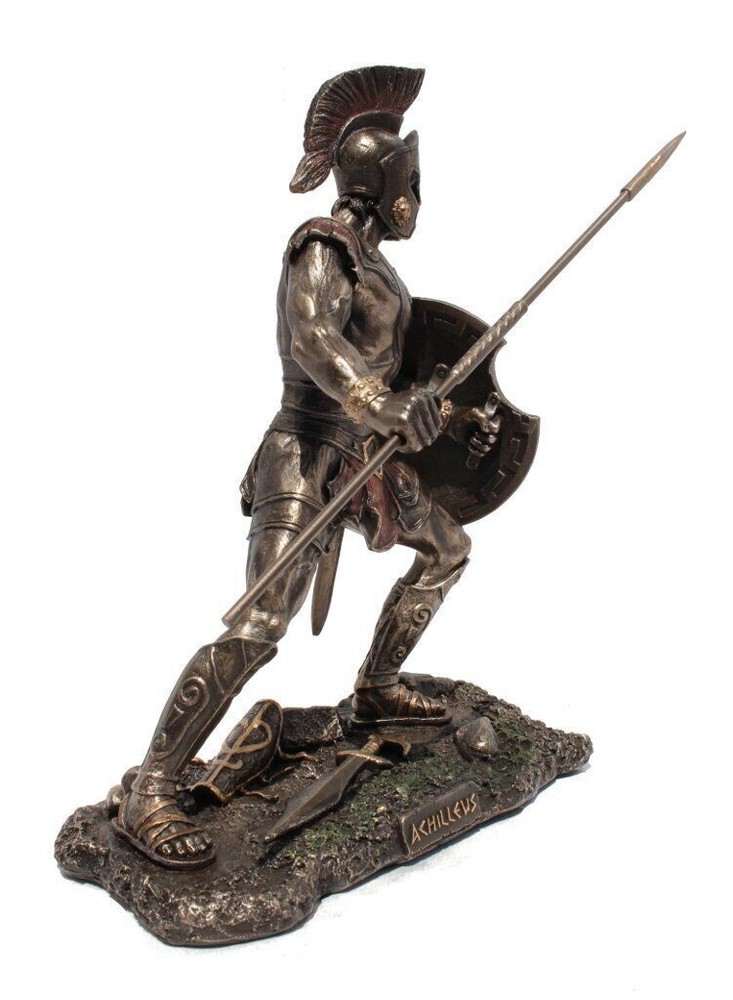 The product is a bronze cold cast 9-inch tall Achilles statue sculpture, depicting the Greek hero of the Trojan War. This detailed sculpture serves as a striking piece of home decor, adding a touch of historical and artistic flair to any space. The statue captures the essence of Achilles, a legendary warrior known for his strength and bravery, making it a compelling addition to any art collection or display.