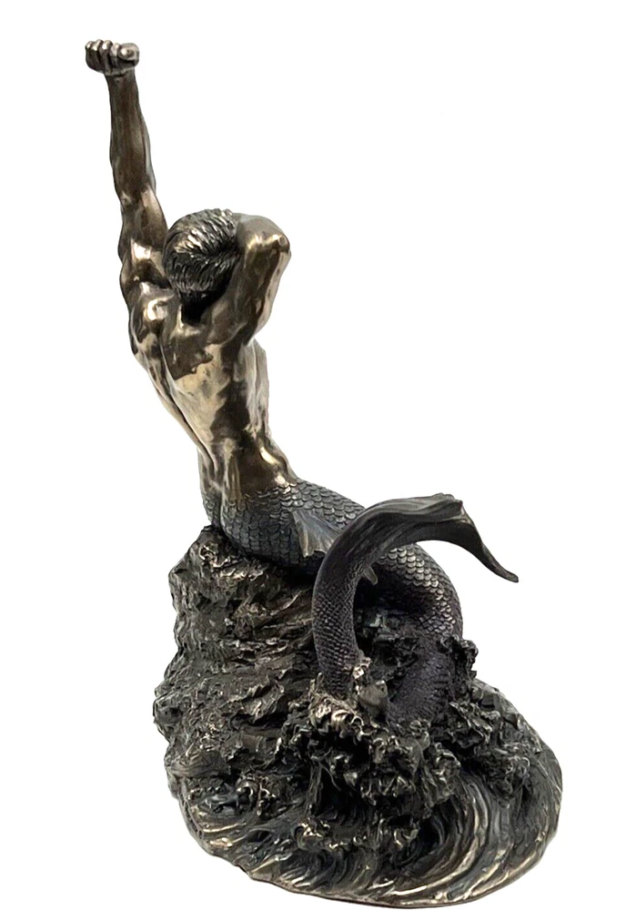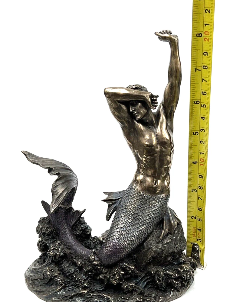 The Veronese Design Merman sculpture is a 7 7/8" tall piece made of bronze and resin, featuring a merman stretching on a rock. It has an antique bronze finish and an eclectic style, perfect for home decoration. The tabletop sculpture has dimensions of 4.25"D x 5.5"W x 7.5"H and weighs 1.4 pounds. Ideal for Mothers or Father's Day, it adds an architectural theme to any space. I will pack with care and get it to you ASAP /thanks for looking !