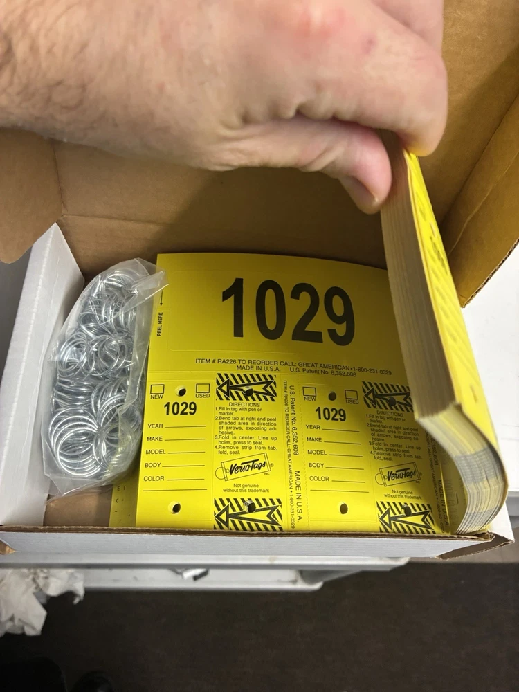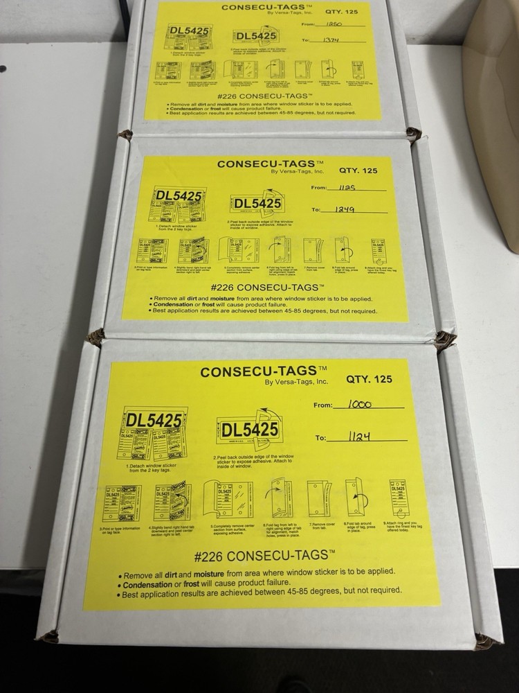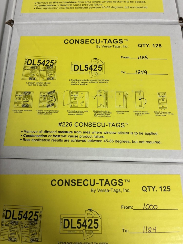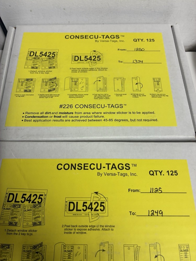 The Versa-Tags Consecu-Tags 125 Sets Auto Dealer Key Tags with Rings are high-quality car tags designed specifically for auto dealerships. Made by the reputable brand Versa Tags, these tags come in a convenient set of 125 with rings for easy identification and organization. The manufacturer part number 226 ensures that you are getting genuine Versa Tags products. Perfect for keeping track of keys and ensuring a secure automotive experience.
