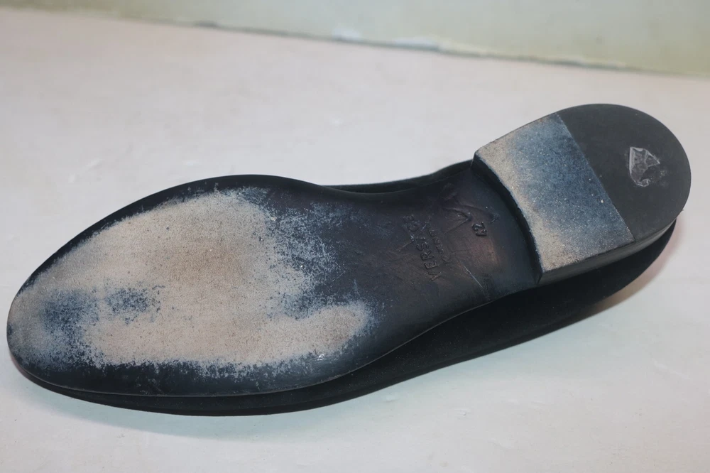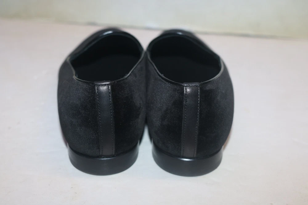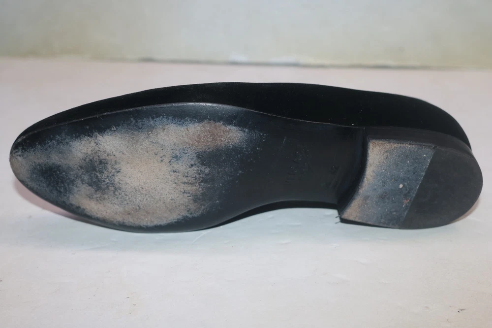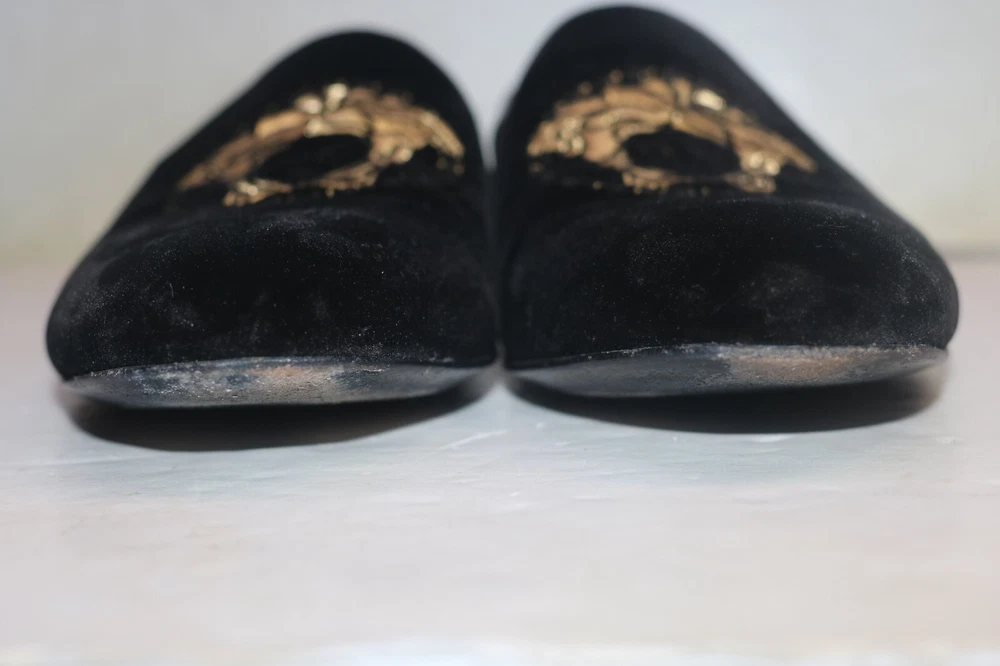Versace Men's Black Velvet Medusa Head Gold Logo Loafers Size 42 Black velvet Smooth leather trims and interior Golden embroidered Medusa logo Slip on Flat stacked heel Made in Italy Size 42 (according to Versace shoe size chart is 9 US Men's size) A10