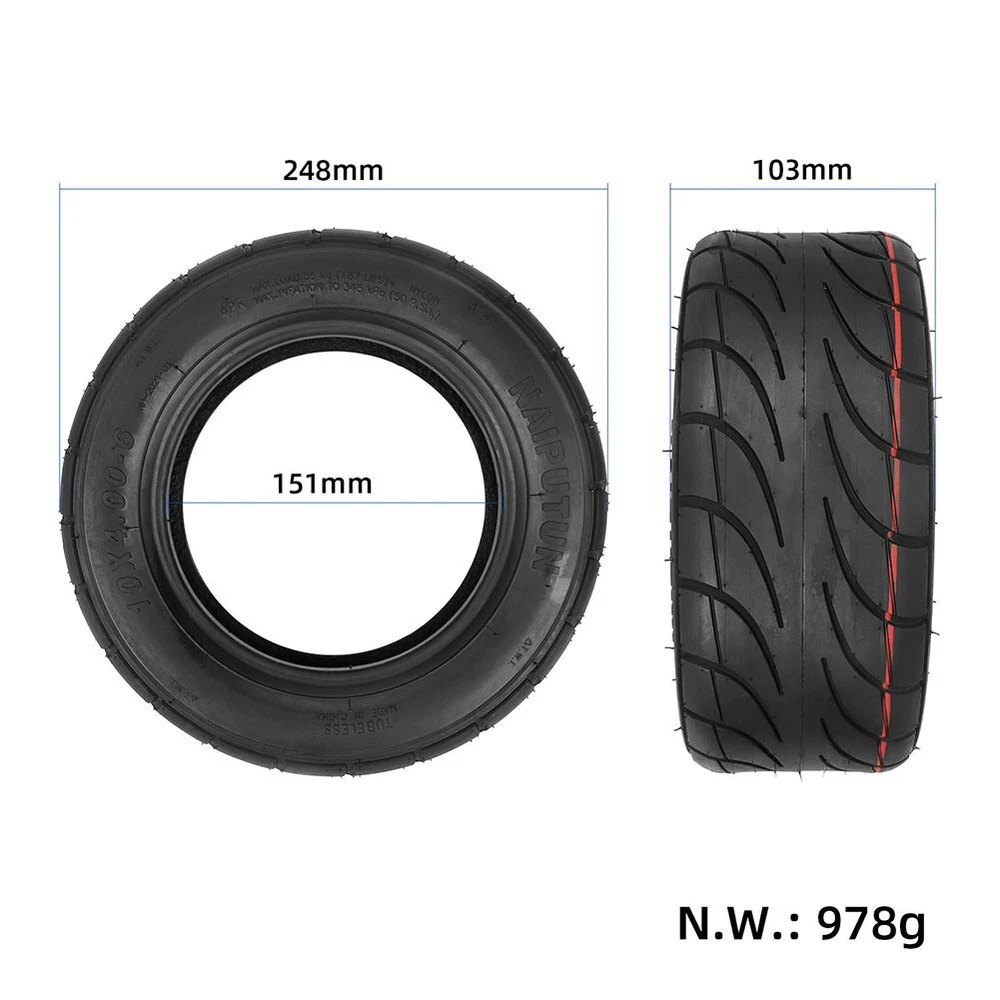 Versatile 10 Inch Tubeless Tire for Mini Motorcycle Electric Scooter Go karts DESCRIPTION : It is illegal to ride electric scooters on public roads, pavements, or cycle paths. They are intended only for use on private land with the owner's permission Description: *Brand new and high quality *Made of high quality material, and practical to use *10 inch 10x4.00-6 Road Tubeless tire, excellent replacement applications Go karts for ATV Quad bike Mercane MX60 Electric Scooter-Mini Motorcycle Specification: *Material: Rubber *Color: Black *Weight: 978g *Model: 10x4.00-6 Package Includes: x Tubeless tire Note: . The real color of the item may be slightly different from the pictures shown on website caused by many factors such as brightness of your monitor and light brightness. 2. Please allow slight manual measurement deviation for the data. POLICES Shipping Payment WARRANTY We only ship to confirmed ebay Order addresses. Please comfirm that your Order address is in line with your shipping address. Please kindly note that the c ombined shipping is not provided because the shipping fee is calculated by weight. Also, the each additional item means exactly the the same color and size. It takes about 7 -15 working days to US; about 10-30 working days to other countries. Transit time may be a little delayed because of the bad weather and customs inspection . If you do not receive your item within 30 working days since payment finished, please contact us immediately for further assistance. Payment must be completed within 5 days. If you have any problems about payment, please contact us via ebay message. We strive for 100% customer satisfaction! Positive Feedback is very important to us. If you have any questions, p lease feel free to contact us via "Ask seller a question" . We will reply your email within 24 working hours. On Jan 2, 2025 at 09:32:10 PST, seller added the following information: