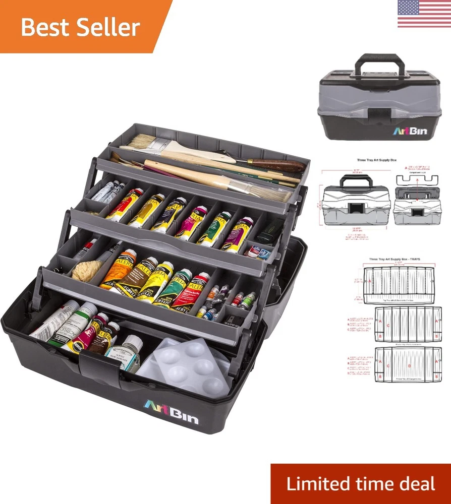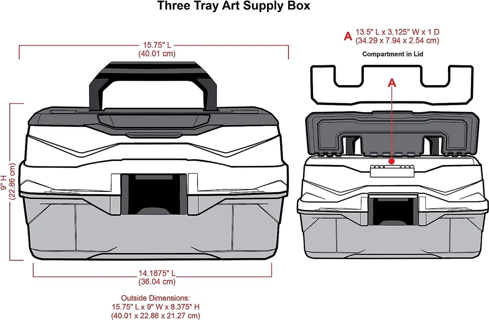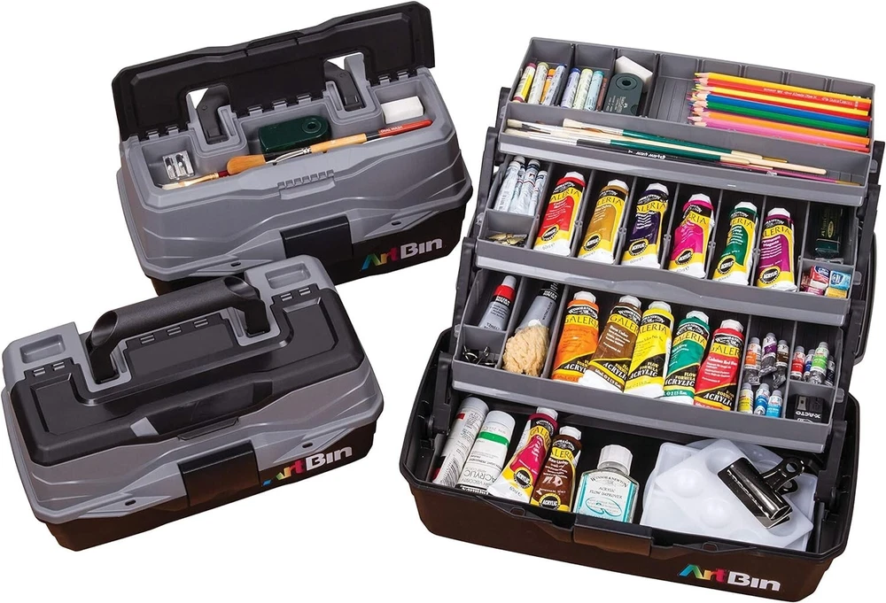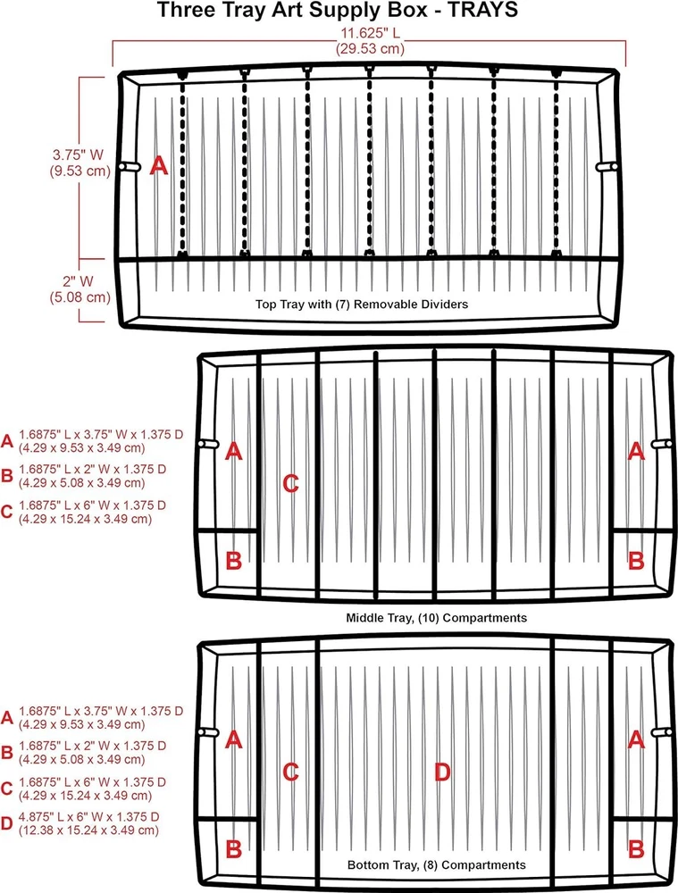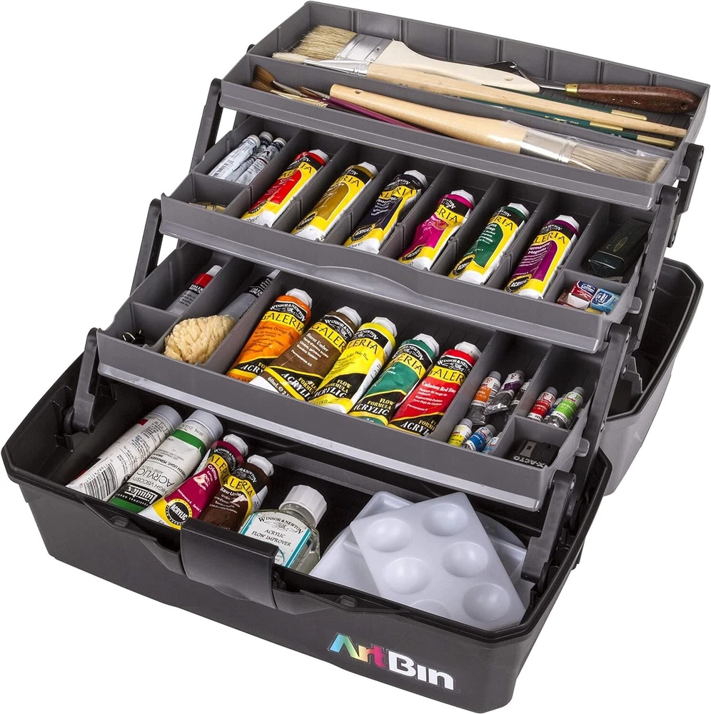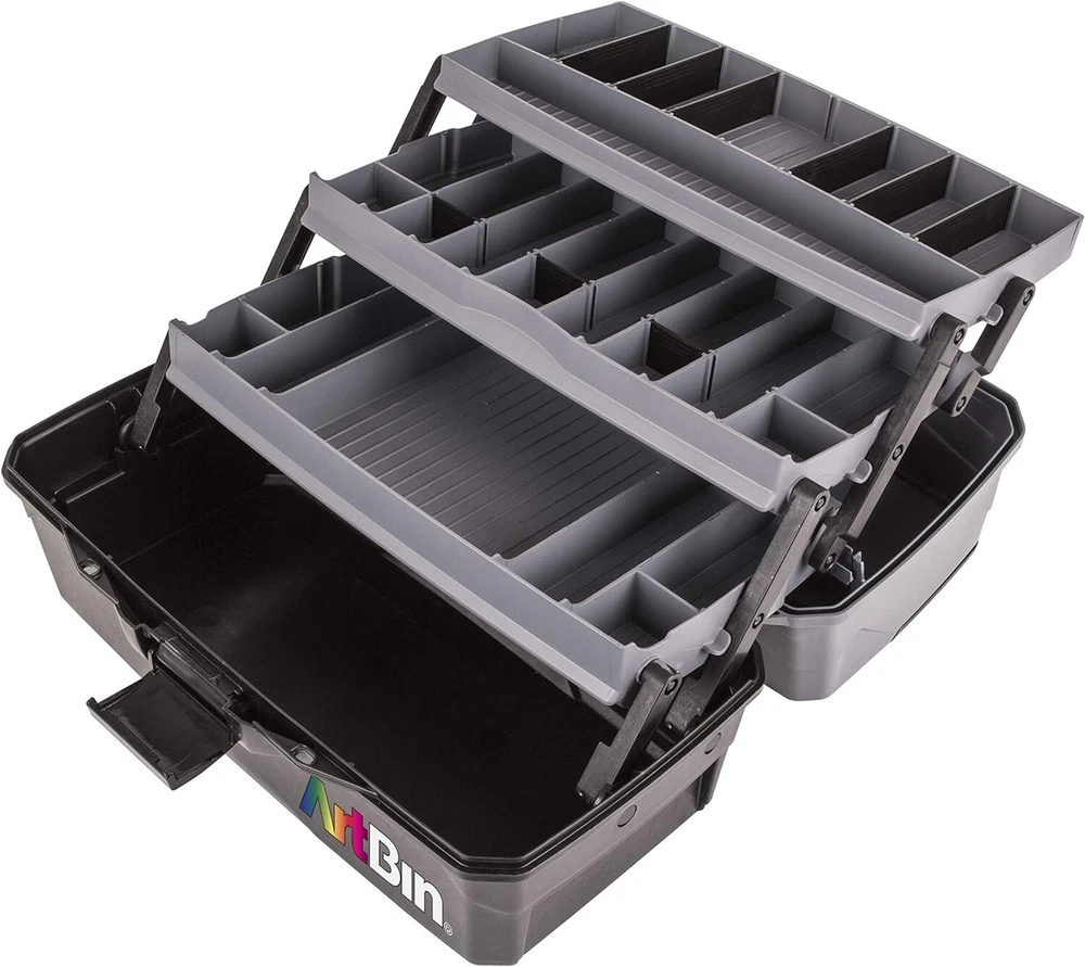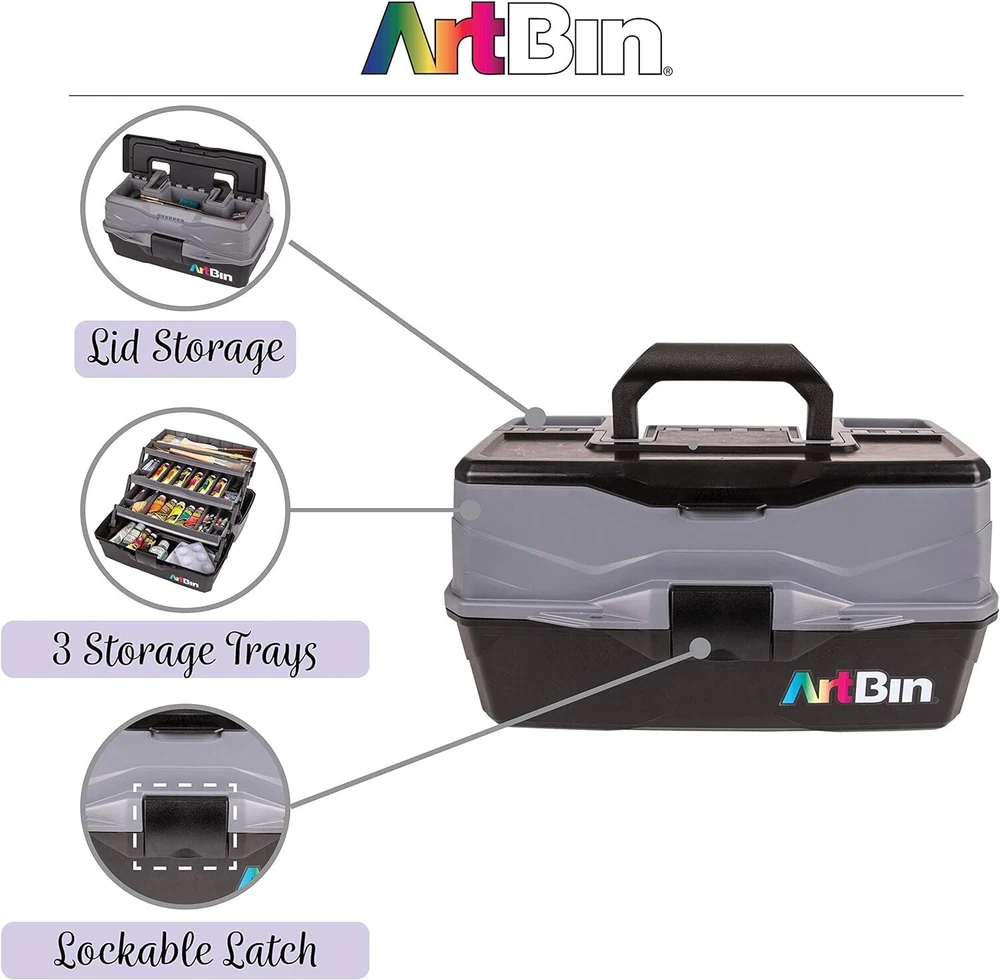Versatile Organizer for Brushes, Paints, Stamps, and More - Durable Hard Plastic, Secure Closure, Portable with Top Trays and Dividers Art Supply Storage Solution: 3 tray supply box for organizing various arts and crafts supplies, including paint brushes, markers, paints, stamps, glues, and more. Versatile and Accessible Design: Quick access in-lid storage for smaller items, spacious open area at the bottom for bulkier supplies like paint bottles, stamp pads, scissors, glues, and vinyl rolls. Durable Construction: Made from tough, wear-resistant hard plastic. Tip guard trays prevent liquid spills from art and craft supplies. Secure Closure and Convenient Transport: with lockable latch for secure content storage. Sturdy plastic handle for easy and convenient transport. Wide-opening lid for effortless access to all your supplies. Product Specifications: 3 Tray Art Supply Box dimensions - x 8 x 7 inches. Features 3 top trays with removable dividers. Introducing the 3 Tray Art Supply Box, an essential storage solution designed for art enthusiasts, students, and professionals alike. This functional supply box is tailored to organize and protect your valuable art tools, including paint brushes, pencils, and for both seasoned artists and aspiring students, this art tool storage box boasts a cantilever tray with removable dividers, providing customizable compartments to accommodate various supplies. The spacious open area at the bottom of the box allows for convenient storage of bulkier art materials, ensuring you have everything you need at your fingertips.Efficiency meets accessibility with the in-lid storage area, offering quick and easy access to your essential tools. Crafted with durability in mind, this organizer is wear and tear-resistant, promising longevity even with frequent use. The tip grip tray with dividers ensures versatile storage, allowing you to tailor the space to your specific lockable latch adds an extra layer of security, keeping your art supplies safe and organized. Transporting your creative essentials is a breeze, thanks to the sturdy plastic handle that makes carrying the box up your art organization game with the NEW improved Three Tray Box. Featuring three cantilevered trays with removable dividers, this box provides enhanced storage options. The top tray is specifically designed for longer items such as paint brushes, pencils, and markers. The large open area at the bottom of the box remains perfect for storing bulkier supplies, catering to the diverse needs of both professional artists and art students alike.Elevate your artistic experience with the Tray Art Supply Box – the epitome of functionality, durability, and organization. Secure your creative essentials with this thoughtfully designed storage solution and enjoy the convenience of having everything you need right at your fingertips. Experience the perfect blend of practicality and versatility with the Tray Art Supply Box.