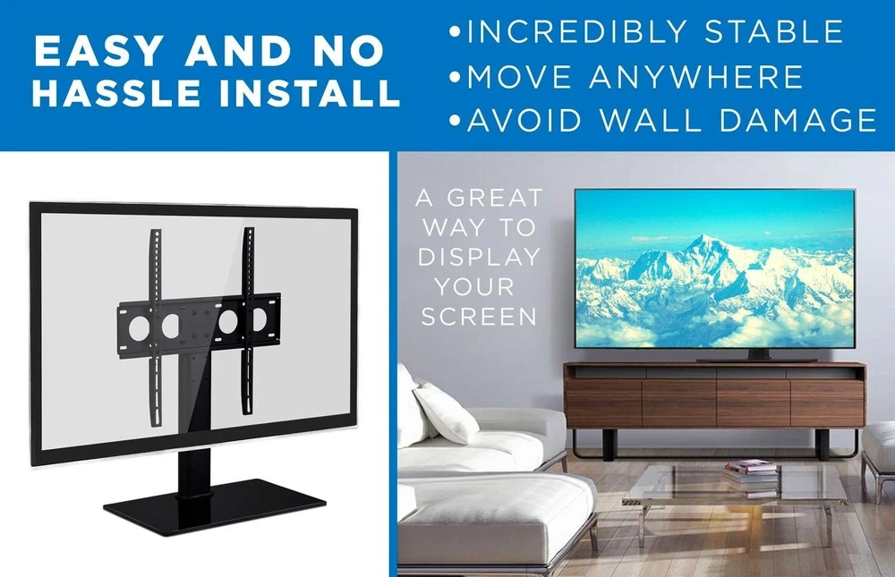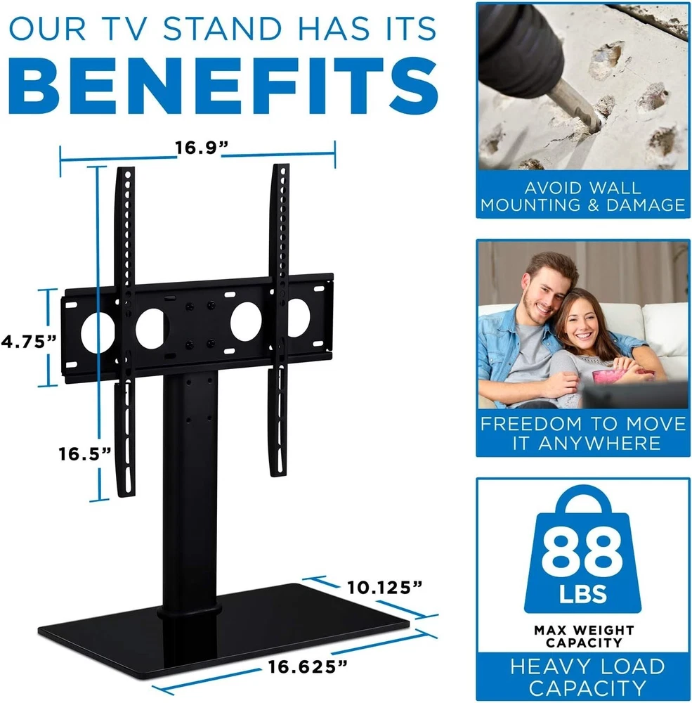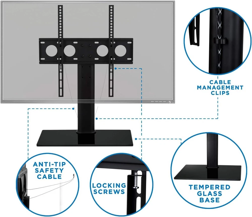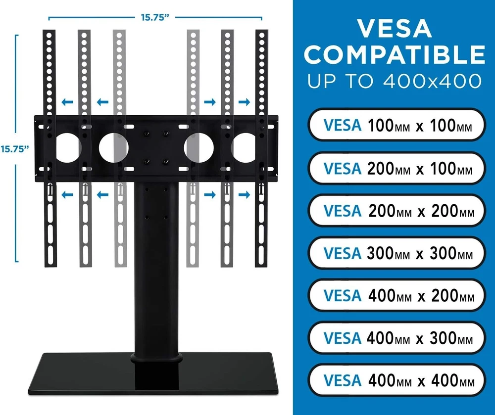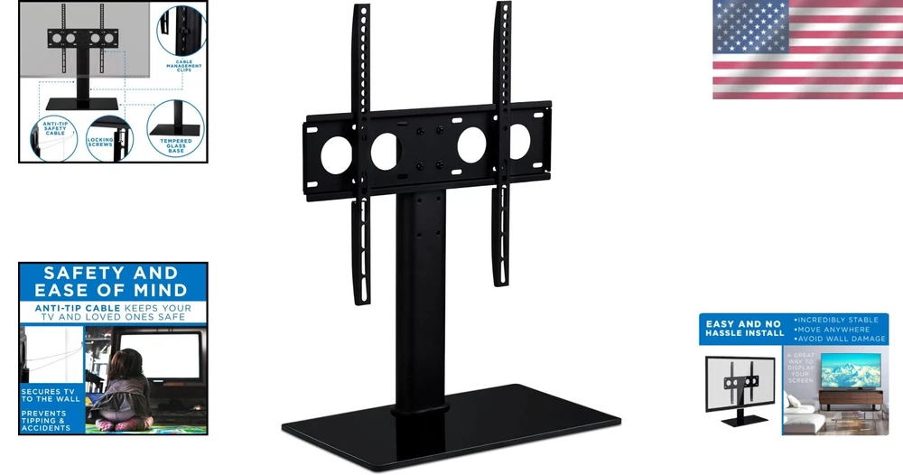 Versatile Universal VESA Mount TV Stand for 27-60 Inches - Safety Strap Included ‹ › ‹ › ‹ › ‹ › ‹ › ‹ › ‹ › ‹ › ‹ › ‹ › ‹ › Versatile Universal VESA Mount TV Stand For 27-60 Inches TVs - Safety Strap Included Product Overview: This Universal TV Stand is the perfect solution for displaying your TV comfortably on an entertainment center or desk. Crafted with a sleek design, it features an 8 mm thick tempered glass shelf that elegantly stores your cable TV box, gaming consoles, and other AV components. Key Features: Height Adjustable: The TV bracket offers three adjustable heights to suit different applications or accommodate various TV sizes. VESA Compatible: Designed to fit most LCD, LED, and Plasma TVs ranging from 27” to 55”, up to VESA 400x400, and weighing up to 88 lbs. Safe and Stable: Features a generous glass base measuring 16.6” wide x 10.125” deep, providing a sturdy foundation that supports up to 88 lbs. Included is a safety strap for added security, ensuring your TV is firmly secured to the wall or the stand. Universal Fit: Compatible with various brands including Samsung, Sony, LG, Sharp, and many more, this stand offers versatility, accommodating TVs from 27 to 60 inches. Why You Should Choose Our TV Stand: If you are searching for the ultimate combination of functionality, elegance, and safety, our Versatile Universal VESA Mount TV Stand is your perfect choice. The sleek tempered glass and adjustable height options not only enhance your viewing experience but also elevate your living space aesthetics. Plus, with its universal compatibility, you can rest assured that it will pair beautifully with your modern home entertainment setup. Transform your living room and secure your TV with confidence - elevate your home experience by ordering your TV Stand today! Shipping Free & Fast Shipping - We offer free shipping to most of the USA with a normal delivery time of 3-7 days. However, due to the current situation, additional delivery time (up to 3 weeks) may be required for some items. Alternative Carriers - We may use alternative carriers (e.g. USPS, FedEx, UPS, etc.) to ensure your package arrives safely and on time. Due to the use of multiple carriers, we are unable to provide a tracking number automatically. Handling Time - Orders are processed and shipped within 1-2 business days of receiving cleared payment. Shipping Restrictions - Shipping to Alaska, Hawaii, Puerto Rico, Guam, and other US territories may incur shipping charges or delivery restrictions. Please contact us before ordering, or your order can be refunded/cancelled. State Restrictions - There may be restrictions based on your state of purchase. For example, certain items may not be shipped to California due to state regulations. Contact for Tracking Updates - If you require tracking updates or have any concerns about the delivery of your order, please feel free to contact us, and we will be happy to assist you. Return 30-Day Hassle-Free Returns - We want you to be completely satisfied with your purchase. If you are not, you can return the item within 30 days of receiving it for a full refund or exchange. Easy Return Process - To start a return, simply contact us and we will provide you with a prepaid return shipping label and detailed instructions. Restocking Fee - There are no restocking fees for returns. However, the buyer is responsible for return shipping costs if the return is not due to a seller's error. Refund Processing Time - Refunds will be processed within 5 business days of receiving the returned item in its original condition. Payment We accept all major credit cards, PayPal, and Apple Pay for your convenience. Your payment information is secure and encrypted to ensure a safe and seamless transaction. Please complete your payment within 3 days of purchase to avoid any delays in shipping. Feedback Your feedback is extremely important to us. We strive to provide the best products and customer service possible. If you are satisfied with your purchase, please take a moment to leave us a positive review. If you have any concerns or issues with your order, please contact us before leaving negative feedback. We are committed to resolving any problems and ensuring your satisfaction. Contact Us If you have any questions or concerns, please feel free to reach out to our customer support team. You can contact us through the eBay messaging system. We are available Monday to Friday, 9:00 am to 5:00 pm EST, and we will do our best to respond to your inquiry within 24 hours. Buy it now and enjoy a pleasant shopping experience! UPC: Not Set Maximum Weight Fitment: 88 lb Unit Quantity: 1 Year Manufactured: Not Set VESA Hole Pattern: Not Set Features: Height Adjustable Brand: Unbranded Type: Table Top Maximum Screen Size Fitment: 60 in MPN: Not Set Unit Type: Unit Color: Black Country/Region of Manufacture: Not Set Manufacturer Warranty: Not Set