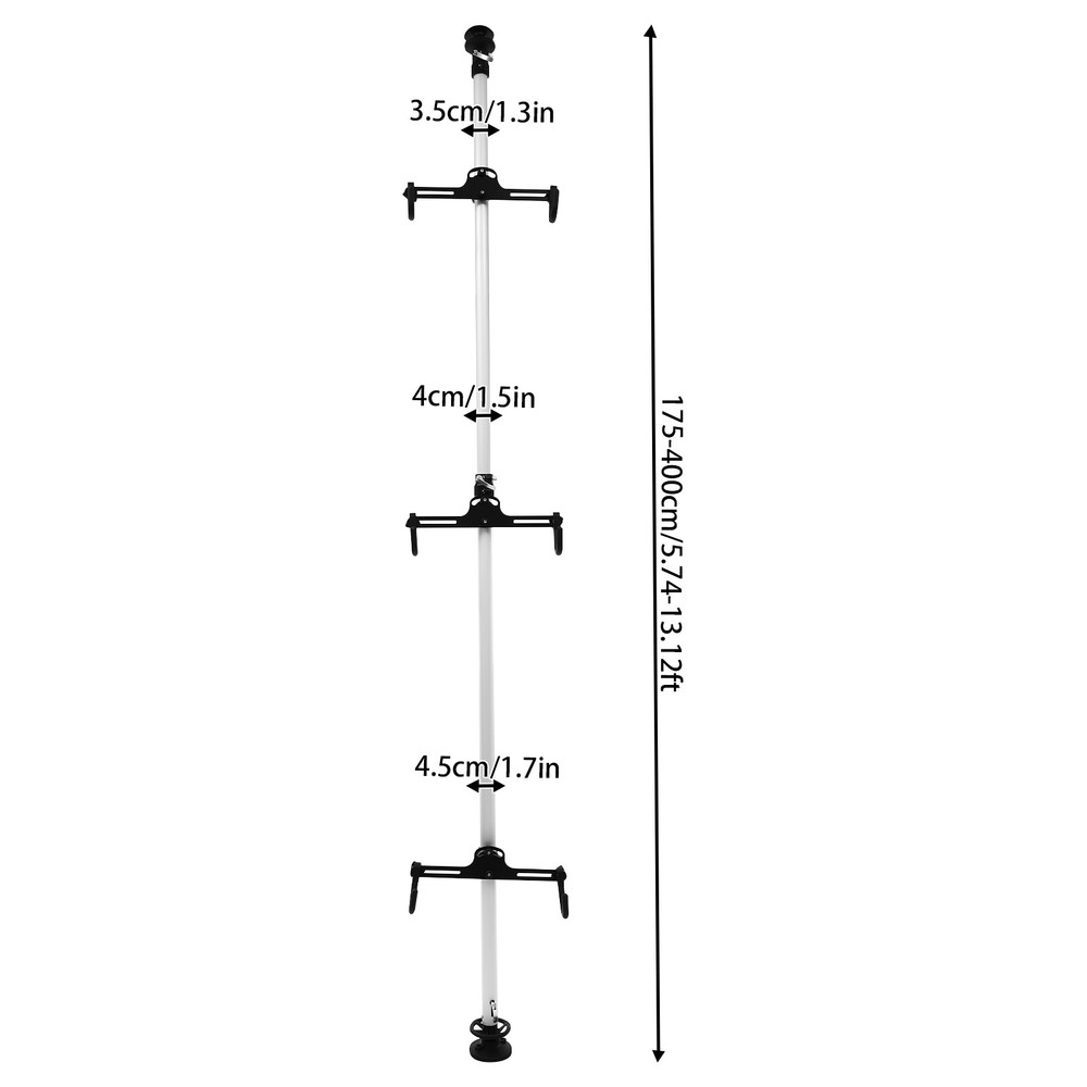Specifications Style: Modern Color: White, Black Material: Aluminum, Iron, Nylon Surface Treatment: Coating Mount Type: Floor Mount Assembly Required: Yes Indoor/Outdoor Usage: Indoor Number of Hooks: 3 Height Adjustment Range:1.75m-4m/5.74-13.12 ft Hook Adjustment Angle: 360° Hook Adjustment Distance: 18-39cm/ 7.09-15.35 in Each Hook Max. Load: 30kg/ 66.14 lbs Applicable Tire Diameter: ≤ 73.66cm/ 29 in Tube Diameter: 45mm/ 1.7 in, 40mm/ 1.5 in, 35mm/ 1.3 in Package Included 1* 3 Bike Storage Rack 3-Bike Storage Rack Stand Vertical Bike Rack Holds Up to 30kg Indoor Bike Hanger Key Features Sturdy and Durable: The product is made of high-quality aluminum, iron, and nylon, using coating technology, with high strength, wear resistance , excellent load-bearing capacity, and long service life. High Stability: High hardness aluminum alloy main tube, thickened tube diameters (1.77 inches, 1.57 inches, 1.38 inches), booster spring top base, and booster fastening knob make this product strong and sturdy, and each hook can hold up to 66.14 lbs, ensuring that the bikes on display are safe and secure. Screw holes in the base under the booster fastening knob allow you to double-fasten the hooks to further enhance stability. Space-saving: With a triple hook design and maximized use of vertical space, this product allows you to display or store more bikes in a limited space. Adjustable Design: The height of the product can be freely adjusted within 5.74-13.12 ft , the hooks can be adjusted 360°, and the distance between the hooks can be adjusted from 7.09-15.35 in ches, which can be flexibly adapted to the needs of different vehicles and displays to achieve the best display effect. Easy Installation: The retractable and quick-release design facilitates quick installation and removal, allowing you to easily install this product without drilling holes or breaking walls. Thoughtful Design: As the stretchable three-section pipe is pulled out to shorter lengths, the greater the load-bearing capacity. At the same time, the three sections of pipe are evenly stressed so you can use it with confidence. Easy to Clean: Its simple construction, smooth surface, and detachable design allow you to easily remove dust from the surface of the product with a towel. Customer Service: We stand behind all our guests and look forward to assisting you with your purchase. It is our pleasure to answer your confusion and questions. The end of the story between us is definitely not "we sell and you buy" Details Non-slip Mats: Rubber feet on the top and bottom help the product stand firm while avoiding damage to the ceiling and floor. Knob Type Hose Clamp: It can be rotated to tighten the pipe installation. Application This product is suitable for storing bicycles, road bikes, mountain bikes, children's bikes, hybrid bikes, etc. with a tire diameter up to 29 inches. It is widely used in home garages, bicycle specialty stores, repair stores, exhibitions, and so on. It can also be used to organize bike accessories, helmets, travel bags, and more. Specifications Style: Modern Color: White, Black Material: Aluminum, Iron, Nylon Surface Treatment: Coating Mount Type: Floor Mount Assembly Required: Yes Indoor/Outdoor Usage: Indoor Number of Hooks: 3 Height Adjustment Range:1.75m-4m/5.74-13.12 ft Hook Adjustment Angle: 360° Hook Adjustment Distance: 18-39cm/ 7.09-15.35 in Each Hook Max. Load: 30kg/ 66.14 lbs Applicable Tire Diameter: ≤ 73.66cm/ 29 in Tube Diameter: 45mm/ 1.7 in, 40mm/ 1.5 in, 35mm/ 1.3 in Gross Weight: 5.5kg/ 12.12 lbs Net Weight: 5kg/ 11.02 lbs Package Size: 180*13*14cm/ 70.87*5.12*5.51 in Package Included 1* 3 Bike Storage Rack Notes Please note that this product does not include a bicycle. Please make sure that all parts of the product are securely mounted when hanging the bike. Please note that we recommend that you leave space around the product to avoid disturbing your valuables. Please allow the slight color difference caused by the shooting light and 1-3cm error due to manual measurement, and make sure you do not mind before you order. Payment Delivery details Terms of sales About us Contact us Payment We accept ebay payment 。 Fees such as import duties, taxes are not included in the item price or shipping costs. These charges are the buyer's responsibility. Delivery details Shipping: 2-9 working days to: USA Terms of sales We maintain high standards of excellence and strive for hundred percent customer satisfaction. Feedback is very important to us. We hope that you contact us immediately before you give neutral or negative feedback, so that we can address your concerns. It is impossible to address issues if we do not know about them! About us Your satis faction is our ultimate goal. We work hard to earn your trust and future business. Our certified technicians have tested each item before shipping. The unit comes with 1 year limited warranty on all manufacturing defects. a) If you receive a defective item, you may return it or ask for a discount. Please contact us within 14 days after you receive the package. b) What you returned must be intact and in its original packaging as re? u. Customer is responsible for shipping costs of the returned item. c) We will cover the cost of shipping back t with the shipping rate indicated in the registration page. We will send you a new unit or refund the full payment you paid. Thank you. Contact us Business Hour Business Hour: Monday To Friday: 8:30 AM to 5:00 PM (Beijing China time) Due to time zones, our reply to your questions may not be immediately. But within above working time, we will reply your email within 24 hours. If it's non-workdays, please kindly be patient and wait till Monday. Please contact us with ebay message. Please feel free to contact us if you have any questions. Monday To Friday: 8:30 AM to 5:00 PM (Beijing China time) Due to time zones, our reply to your questions may not be immediately. But within above working time, we will reply your emai
