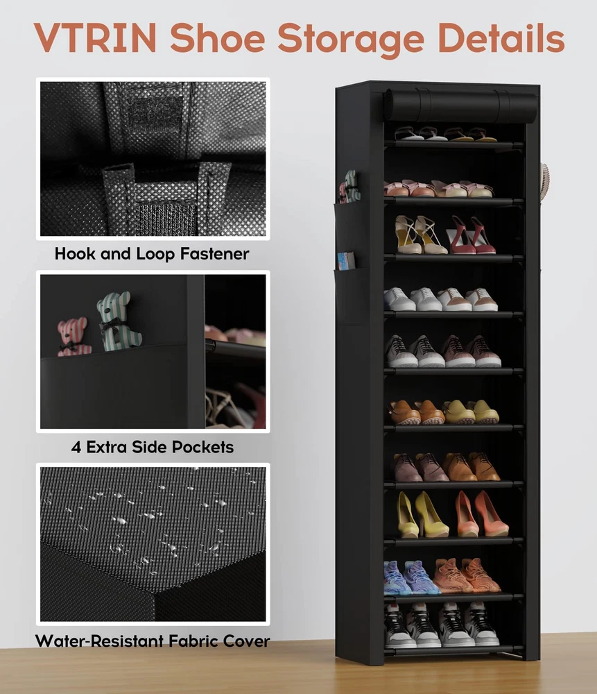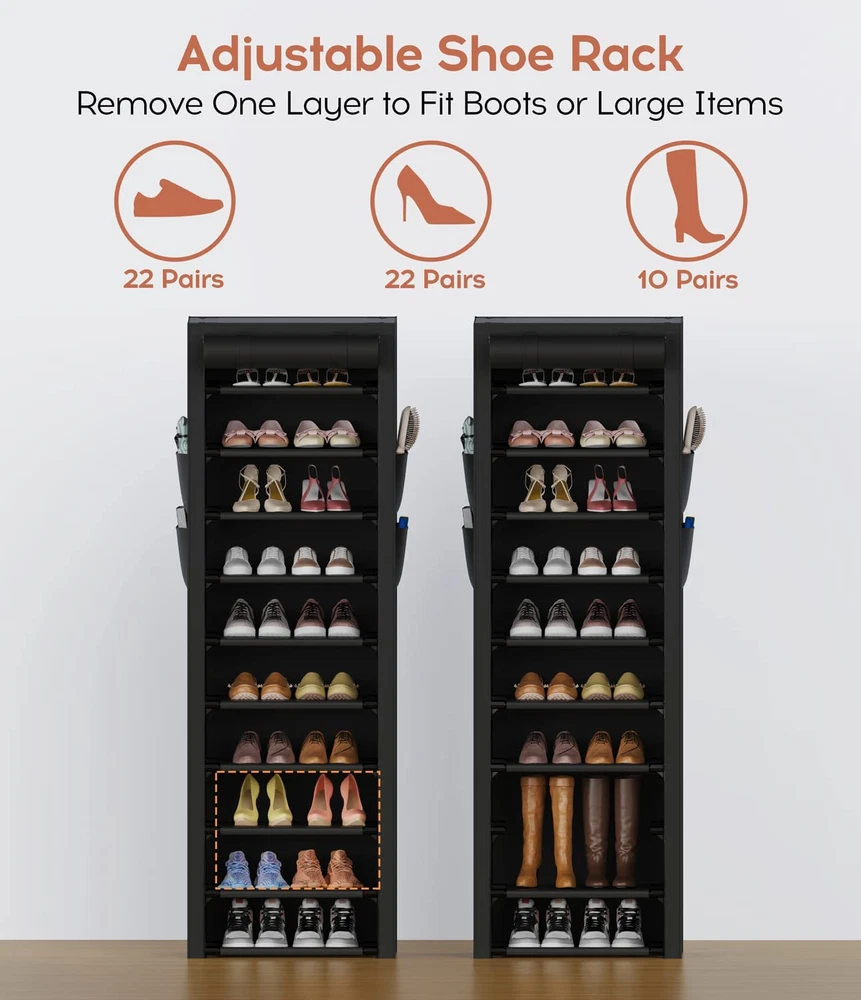 Specific Uses For Product: Toiletries, Clothes, Shoes, Plants, Books Assembly Required: Yes Item model number: XJ-110 Back Style: free standing shoe racks Unit Count: 1 Count Included Components: Hammer, Non-woven fabric, Cover, Instruction manul, Metal pole Product Dimensions: 11.8"D x 17.7"W x 68.9"H Special Feature: Portable, With Adjustable Shelves, Durable, With Weatherproof Non Material Non-Woven, Plastic, Metal: Mounting Type Floor Mount Room Type: Garage, Closet, Bedroom, Living Room, Hallway Style: Modern Weight capacity: Maximum weight: 100 Pounds Number of Items: 1 UPC: 7445012995952 Item Width: Does not apply Weight Limit: 100 Pounds Color: Black Item Weight: 4.4 pounds Model Name: XJ-110 Recommended Uses For Product: shoes,clothes,bags, toys, towels, sundries, books, plants, keys, Shelf Type Metal: Shape Vertical Type: Does not apply Brand: Does not apply Item Height: Does not apply Installation Type: Freestanding Item Length: Does not apply Furniture Finish: Black Finish Type: Lacquered Product Care Instructions: Wipe with Dry Cloth Country of Origin: China Min Required Door Width: 30 Centimeters Product Name: shoe rack, Narrow Shoe Rack, 10 Tiers Tall Shoe Rack, shoe rack w Number of Shelves: 10 gtin13: 7445012995952 Age Range (Description): Adult Size: 10 Tiers Shelf Thickness: 6.7 Inches