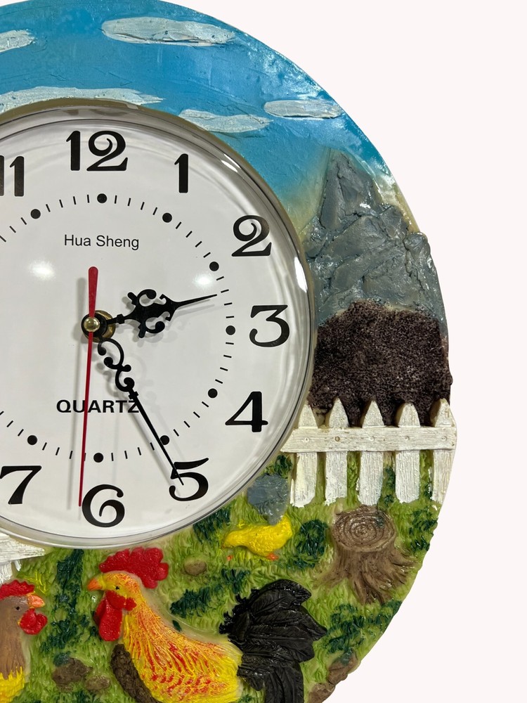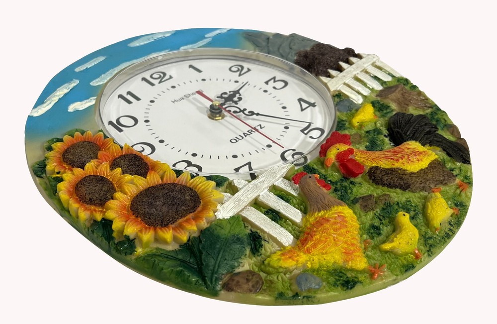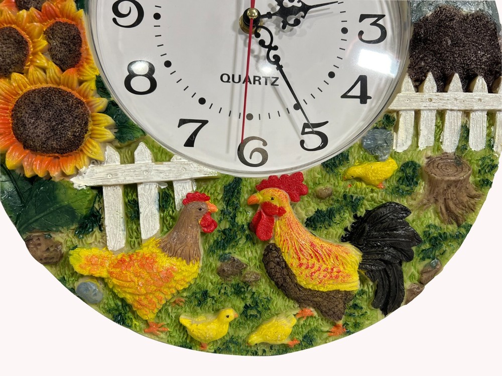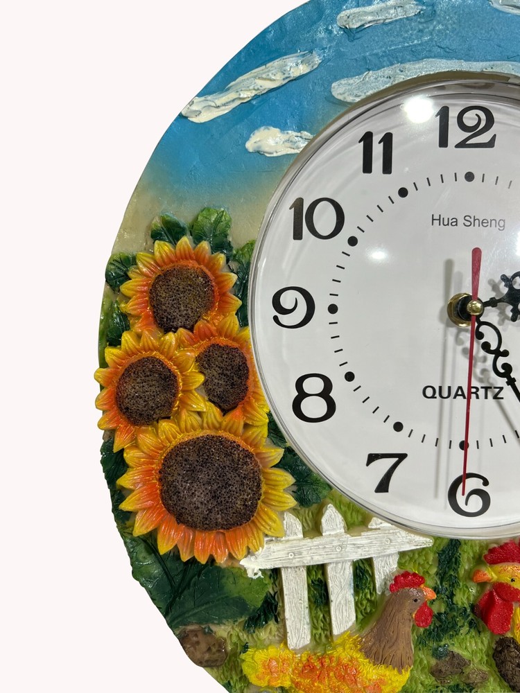 Brand Generic Color Multicolor Display Type Analog Style Kitchen Chef Theme Special Feature Non-ticking Product Dimensions 12"W x 12"H Power Source Battery Powered Age Range (Description) Adult Room Type Kitchen Shape Round About this item Unique Design: Handcrafted resin wall clock featuring a vibrant sunflower and rooster scene in the countryside. Precise Movement: Quartz analog movement ensures accurate timekeeping with a smooth, silent sweep. Sizable Timepiece: Measures 12 inches in diameter, perfect for kitchens, living rooms, or any space needing a decorative accent. Durable Construction: Crafted from high-quality resin material for long-lasting beauty and functionality. Easy to Install: Includes all necessary hardware for quick and straightforward wall mounting.