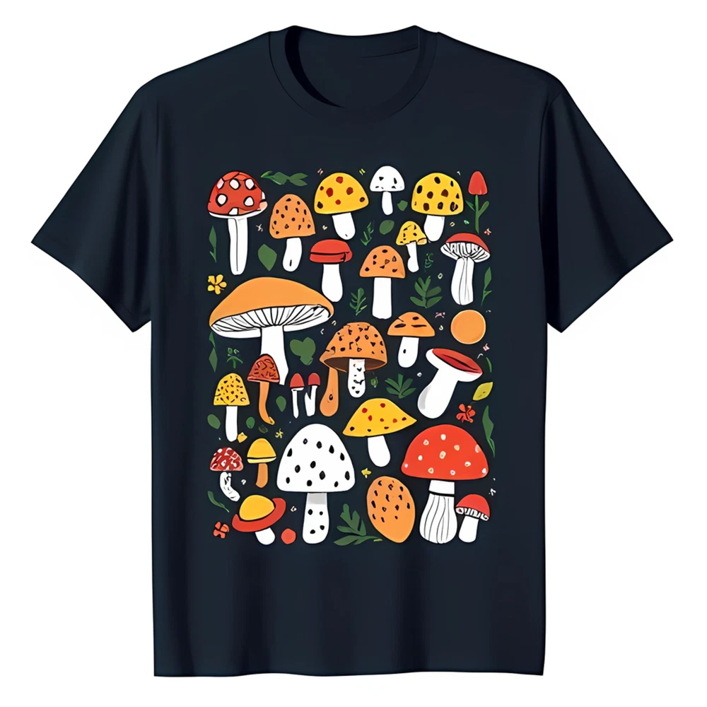 Vibrant Cartoon Mushroom Graphic on Black T-Shirt Whimsical Forest Design