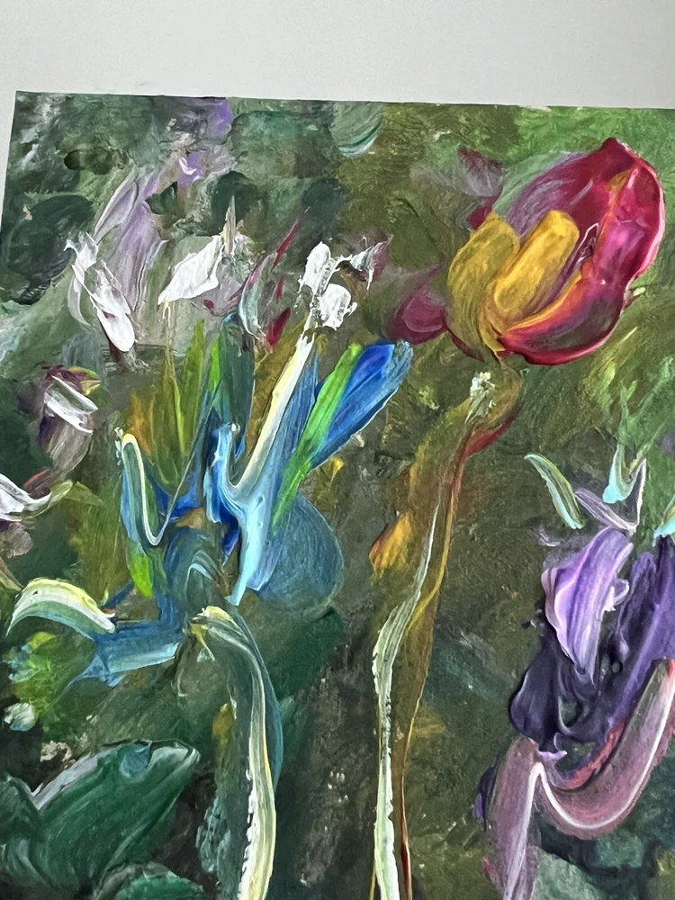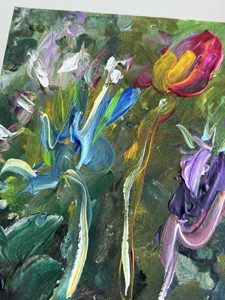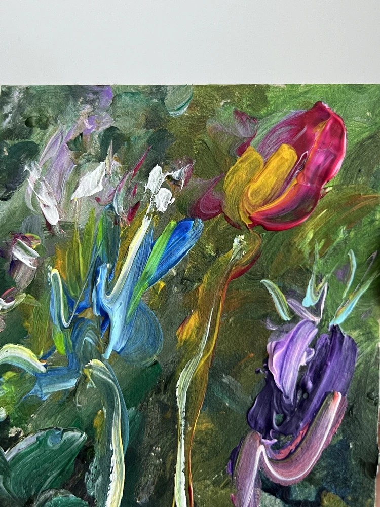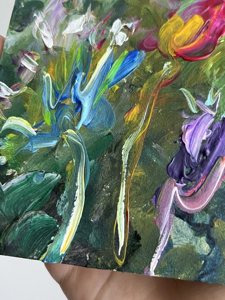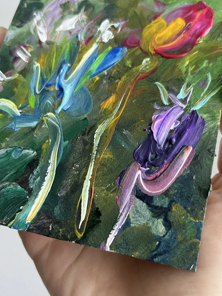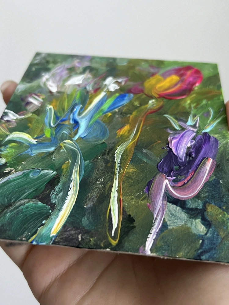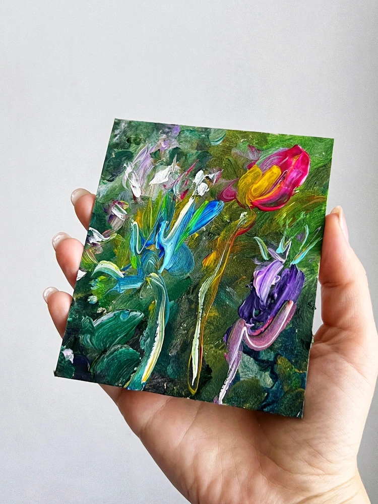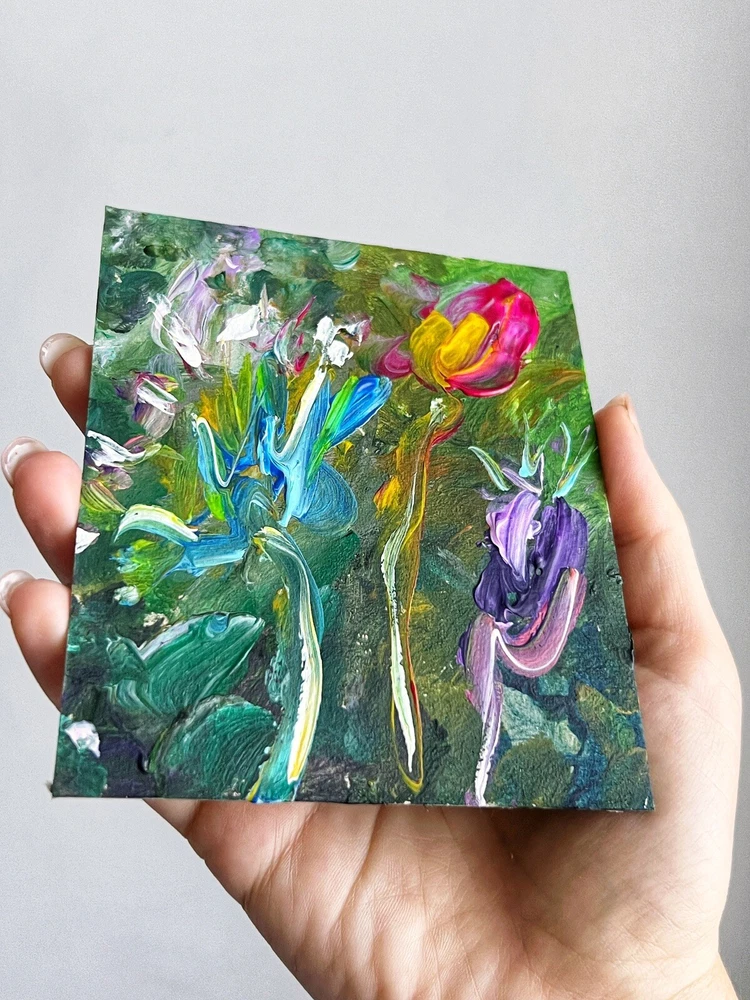 ๐ฟ Vibrant flowers acrylic painting. 100% hand painted Plein air impressionist wildflowers art. Small floral painting. Original flowers art decor. ๐ฟ Original author's acrylic painting on thick cardboard . Unframed. Need a decorative frame. ๐ฟ Size: about ~ 10x12 cm / ~ about 4x5 inches ๐ท Signed from the back by Kateryna Oliynyk . ๐ฟ Materials: professional acrylic paints, cardboard ,. Unframed . Need a decorative frame. Or you can use a small stand / miniature easel.