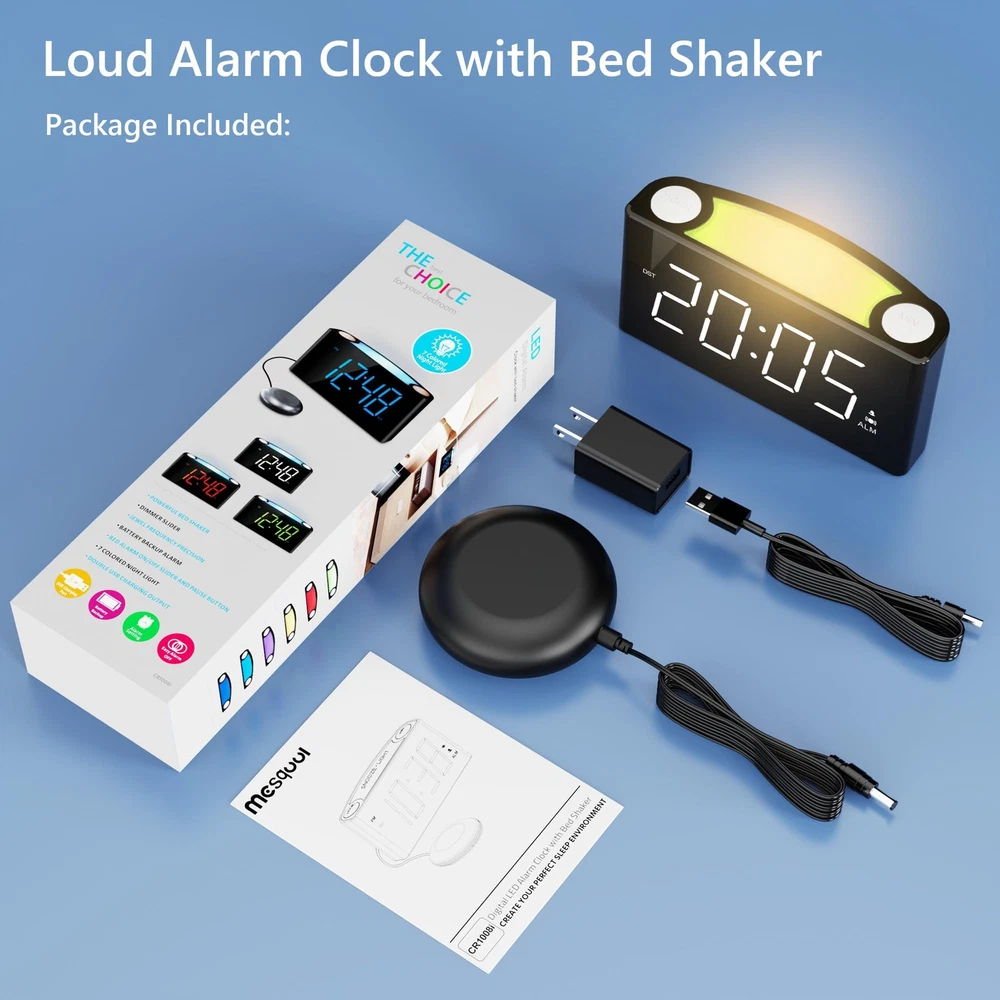 Heavy Sleeper Alarm Clock – Features bed shaker + buzzer with 3 wake-up modes (sound/vibration/both). Ideal for deep sleepers & hearing impaired. 7-Color Night Light & 7" LED – Customizable lighting + snooze function. Large display with adjustable brightness. Easy Setup & Smart Features – One-touch controls, 12/24H time, DST adjustment. Dual USB Charging + Battery Backup – Charge 2 devices. Works during outages (AAA batteries not included). 【Bed Shaker & Buzzer Wakeup】This alarm clock for heavy sleepers, hearing impaired seniors is designed with a vibrating bed shaker and the buzzer can wake people up in 3 ways to personal preference. You can choose the alarm to be a buzzer, a pillow vibrator without disturbing your family or both by sliding the switch left or right, or middle for both. It has 3 levels of volume control which are low, medium and high, meeting different demands. 【7 Color Night Light & Large 7'' LED Screen with Full Range Dimmer】The bedroom LED digital alarm clock for adults and kids has 7 color night lights which allows you to choose your favorite one, definitely a great gift choice. The night light button also works as SNOOZE to get an extra 9 min when clock rings. Easy to read across the room with the large 7'' LED display and full range brightness dimmer for poor eyesight or people used to the dark sleeping environment. 【Super Easy Operation,12/24H Time Format & DST】The Digital Alarm Clock with simple & intuitive buttons and easily set without annoying hold or repeat press.1-minute finish setting, your boys girls and parents can operate it easily. Press and hold the Hour button to change the 12H or 24H time format. DST function is essential to the electric alarm clock. Hold and press SET TIME to easily activate or deactivate the Daylight Saving Time function and add or minus 1 hour on your display. 【Dual USB Chargers】The vibrating alarm clock for deaf with dual 5V/1A USB charging ports on the back enables you to charge 2 devices at the same time. This function helps when no more outlet for devices on your nightstand and saves your time. 【Battery Backup】This alarm clock with bed shaker can put into 2pcs AAA batteries (not included) to back up your time setting and ensure the alarm keeps working in case of power failure(battery doesn't support time display but can trigger the alarm)