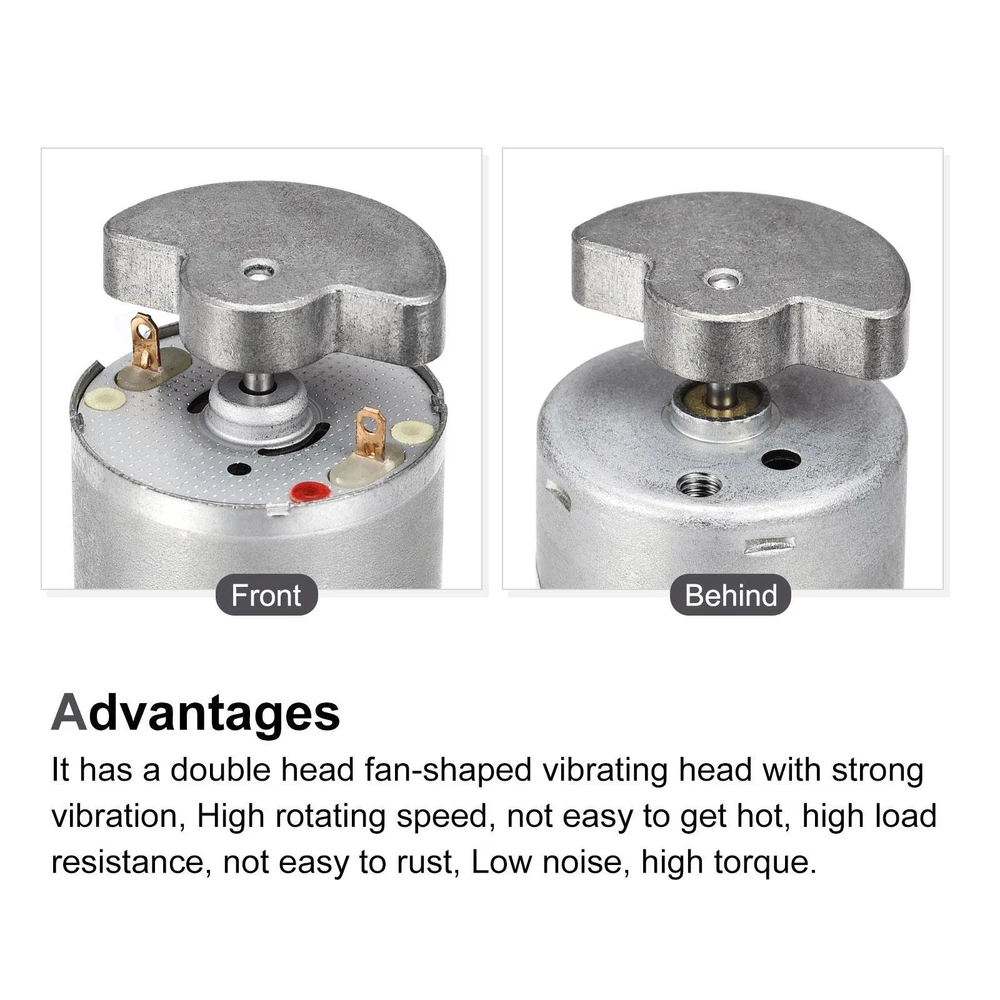 Document What is this?This DC 12V 8500RPM vibration motor has double shaft strong vibrating, widely used in DIY Massager,such as Beauty massager, foot massager and other home massager machines.What will I get?The vibrating motor provides here is in voltage of :DC 12V; Rotating speed: 8500RPM; vibrating head Diameter: 24mm(0.94 inch); Motor Body Length: 30mm (1.18 inch);Motor Body Diameter:24mm(0.94 inch);Thread diameter:M3In the package of: 1pcs x vibration motorsIs there any advantages of the product?It has a double head fan-shaped vibrating head with strong vibration,High rotating speed, not easy to get hot, high load resistance, not easy to fade and rust , Low noise, high torque, long lifeHow to use it?Steps of intallation:1.disassemble the original motor;2.install the motor on the device;3.connect the wire on the motor.What should I notice?Before purchasing, please confirm the voltage and number of revolutions of the motor you need. After installation, please ensure the position of the product and the complete wiring before use the product. Mini Vibration Motors DC 3V 2500RPM Vibrating Motor 41x23.8mm 2Pcs USD 8.54 Micro Double Shaft Vibration Motors DC 1.5V 70mA Vibrating Motor 15x4.3mm 5Pcs USD 7.41 Micro Double Shaft Vibration Motors DC 1.5V 70mA Vibrating Motor 15x4.3mm 10Pcs USD 10.13 Vibration Motor DC 6V 5000RPM Brass Double Shaft Strong Vibrating Motor 2pcs USD 22.02 Vibration Motor DC 24V 5000RPM Brass Double Shaft Strong Vibrating Motor USD 11.39 Double Shaft Vibration Motors DC 12V 3000RPM Dual Head Vibrating Motor 51x24.2mm USD 10.81 Vibration Motor DC 12V 8500RPM Double Shaft Strong Vibrating Motor What is this? This DC 12V 8500RPM vibration motor has double shaft strong vibrating, widely used in DIY Massager,such as Beauty massager, foot massager and other home massager machines. What will I get? The vibrating motor provides here is in voltage of :DC 12V; Rotating speed: 8500RPM; vibrating head Diameter: 24mm(0.94 inch); Motor Body Length: 30mm (1.18 inch);Motor Body Diameter:24mm(0.94 inch);Thread diameter:M3 In the package of: 1pcs x vibration motors Is there any advantages of the product? It has a double head fan-shaped vibrating head with strong vibration, High rotating speed, not easy to get hot, high load resistance, not easy to fade and rust , Low noise, high torque, long life How to use it? Steps of intallation:1.disassemble the original motor;2.install the motor on the device;3.connect the wire on the motor. What should I notice? Before purchasing, please confirm the voltage and number of revolutions of the motor you need. After installation, please ensure the position of the product and the complete wiring before use the product. Hot Item Synchronous Gear Motor AC 24V 10-12RPM 50-60Hz Electric Motor CCW/CW 4W USD 13.19 Synchronous Motor AC 12V 2.5-3RPM 50-60Hz CCW/CW 4W Reduction Gear Motor USD 12.05 Metal Gear Synchronous Synchron Motor AC 100-127V 1.3-1.5RPM 50-60Hz CCW/CW 4W USD 14.21 Vibration Motor DC 6V 5000RPM Double Shaft Strong Vibrating Motor USD 13.66 Double Shaft Vibration Motors DC 6V 6000RPM Vibrating Motor 54x24.2mm 2Pcs USD 15.05 Payment We accept eBay payment. Please do not email us to ask for other payment option. We appreciate prompt payment and look forward to your business in the future. Unpaid item will be filed without receiving payment in 7 days from listing ended. Shipping Usually we ship your order out within 24 hours in business day. For shipping and handling charges (S&H) for specific item, please refer to the item listing page for more details. Please make sure your shipping address is correct. We are not responsible for any loss in transit if a wrong address is provided. Return Policy Returns for exchange are permitted and must be initiated by the buyer within 30 days upon receipt. If you would like to return your product(s) for repair / replacement / refund, please kindly contact our customer service representatives via email for an authorized RMA number. Your returned product(s) will not be processed without a completed RMA. About Us We are continually expanding our product selection to better serve your need. We look forward to providing the best sevice to you - our dear customers, so take a look around our store and find the product that you want. You can put your trust in us! If you need any help or have any suggestions, please don't hesititate to contact us anytime , we will reply you within 24 hours and try the best to help you. Description Policy Vibration Motor DC 12V 8500RPM Double Shaft Strong Vibrating Motor What is this? This DC 12V 8500RPM vibration motor has double shaft strong vibrating, widely used in DIY Massager,such as Beauty massager, foot massager and other home massager machines. What will I get? The vibrating motor provides here is in voltage of :DC 12V; Rotating speed: 8500RPM; vibrating head Diameter: 24mm(0.94 inch); Motor Body Length: 30mm (1.18 inch);Motor Body Diameter:24mm(0.94 inch);Thread diameter:M3 In the package of: 1pcs x vibration motors Is there any advantages of the product? It has a double head fan-shaped vibrating head with strong vibration, High rotating speed, not easy to get hot, high load resistance, not easy to fade and rust , Low noise, high torque, long life How to use it? Steps of intallation:1.disassemble the original motor;2.install the motor on the device;3.connect the wire on the motor. What should I notice? Before purchasing, please confirm the voltage and number of revolutions of the motor you need. After installation, please ensure the position of the product and the complete wiring before use the product. Mini Vibration Motors DC 3V 2500RPM Vibrating Motor 41x23.8mm 2Pcs USD 8.54 Micro Double Shaft Vibration Motors DC 1.5V 70mA Vibrating Motor 15x4.3mm 5Pcs USD 7.41 Micro Double Shaft Vibration Motors DC 1.5V 70mA Vibrating Motor 15x4.3mm 10Pcs USD 10.13 Vibration Motor DC 6V 5000RPM Brass Double Shaft Strong Vibrating Motor 2pcs USD 22.02 Vibration Motor DC 24V 5000RPM Bra
