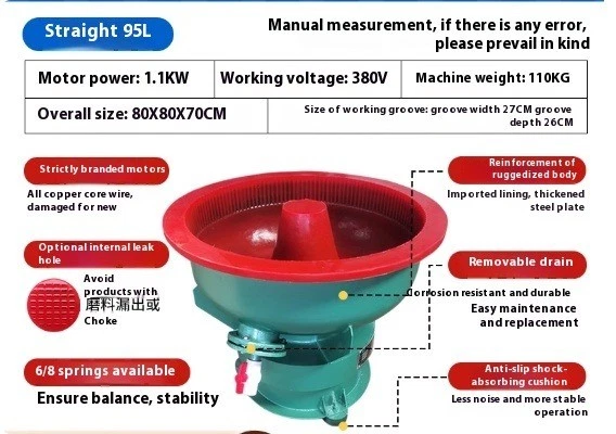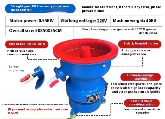 Vibration Polishing Machine Grinder Spiral Finishing Machine Vibrating 220V Utilizing advanced spiral three-dimensional vibration technology, the vibratory finishing machine is suitable for surface polishing, chamfering, deburring, grinding, and brightening of workpieces of various sizes. The process preserves the original dimensional accuracy of the product while eliminating internal stresses, enhancing surface finish and precision. This provides an excellent foundation for subsequent surface treatments such as electroplating, spraying, and blackening.