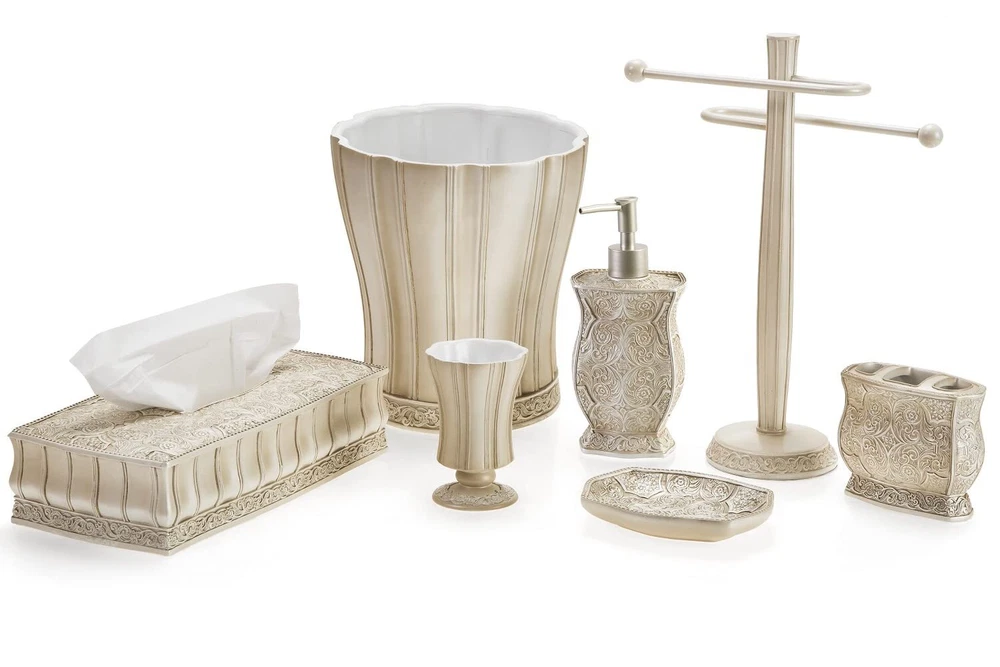 Textured Finishing; The Victoria Bathroom Sets Scroll Pattern And Swirling Floral Motifs Provides A Finish With A Textured Feel That Not Only Looks Classy; But Also Makes For Non-slip Grip. Handling Your Bathroom Decor Sets Accessories Is Much More Comfortable Even With Slippery Or Wet Hands. Durable: All Pieces Of This Bathroom Soap Dispenser Set Are Made Using High-quality Heavy Resin Material Which Never Rusts For Enhanced Durability & Functionally. Dual Purpose; While The Bathroom Sets Accessories Brings Functional Convenience To Your Bathroom, It Is Also A Great Addition To Its Interior Décor; Easily Turn The Tumbler Into A Holder Of Lovely Seasonal Flowers. Bathroom Accessories Sets Complete: Includes Everything You Need For Personal Grooming In The Bathroom. Includes 7.75” X 4.25”x 4.25” Lotion/soap Dispenser Fitted With A High Quality Pump, A 4.25” X 4” X 2.25” Toothbrush Holder That Can Also Hold Toothpaste, 4.5” X 3” X 3” Tumbler And A 1” X 5.75” X 3.75” Soap Dish. Amazing Gift Idea: Bundle This 4 Piece Bathroom Decor Set With Other Items Of The Victoria Bathroom Accessories Collection To Create A Unique Housewarming Or Hostess Gift That Leaves A Lasting Impression. Click 'add To Cart’ Now!