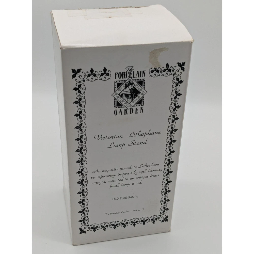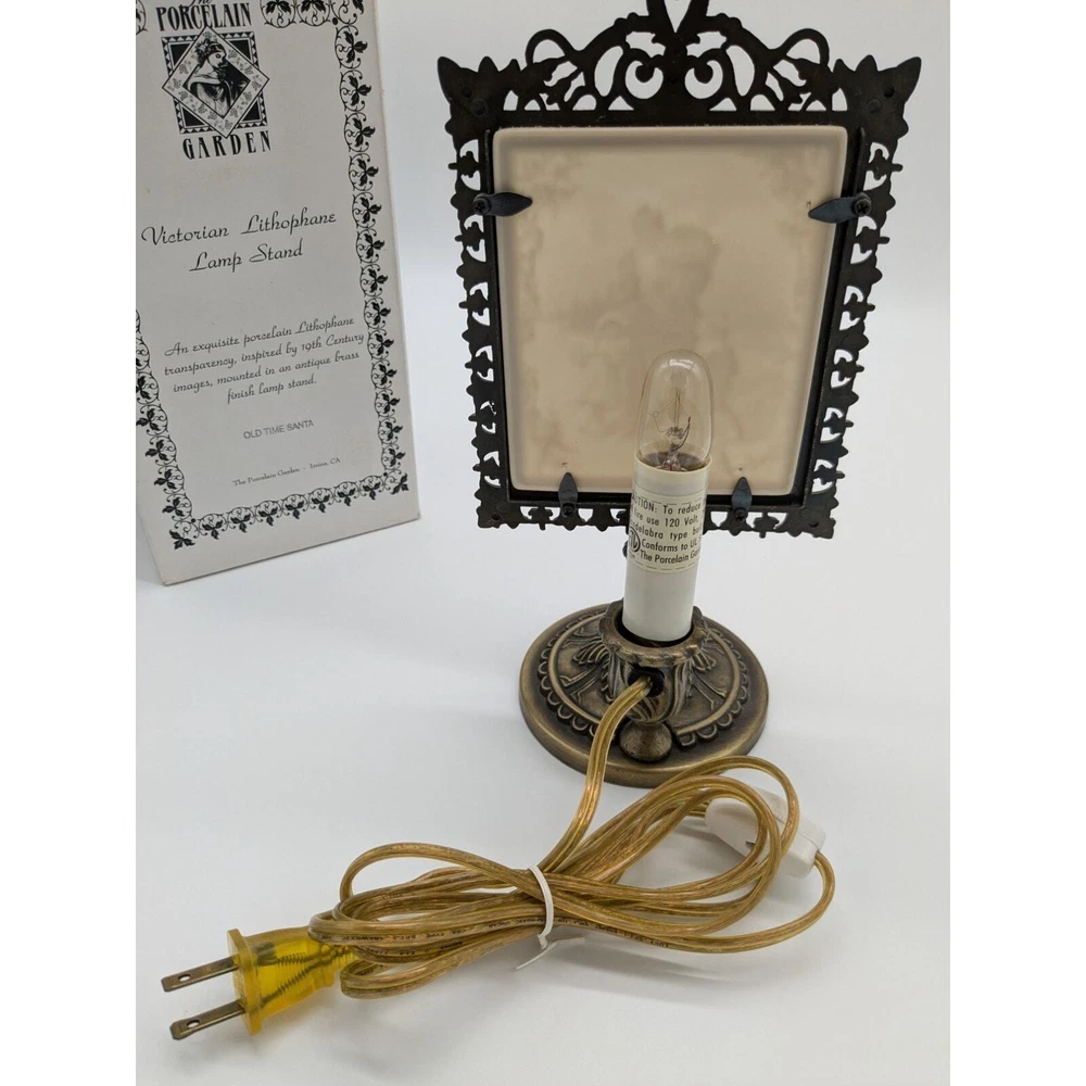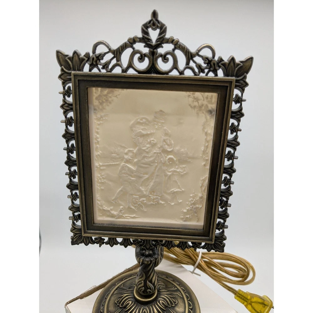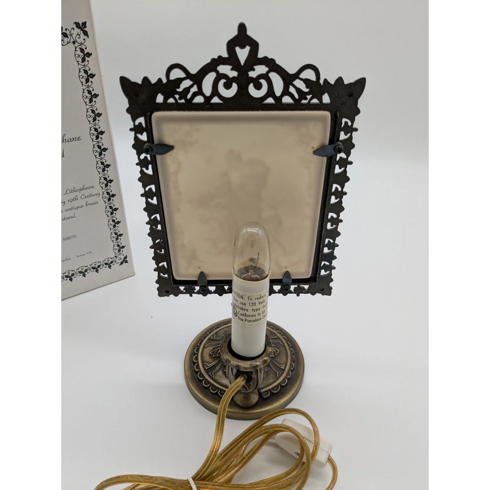 This lovely lamp is based on the original candle lit frames that were used to display Lithophanes in the 19th Century. It makes a great accent piece on a night stand, dresser, shelf, mantle, or bookshelf. This solid cast metal light stands 9 ¼“ tall, 4 3/4" wide, the base is 3 3/4" in diameter, and is finished in antique brass. A "candle cup" in back holds the raised light bulb socket, so the bulb is centered perfectly behind the porcelain panel. Comes complete with 6ft. cord, a bright 25 watt bulb, and an in-line rotary switch on the cord. Nicely boxed with a brief history of Lithophanes right on the box. This is a "lithophane" Victorian Accent Lamp; featuring a thin translucent porcelain panel, made using a lost art from the 1800's. When lit from behind, the light shining through the different thicknesses of the porcelain causes a highly detailed image to appear in front, almost magically. Lithophanes were invented in France in 1827. Good Condition.