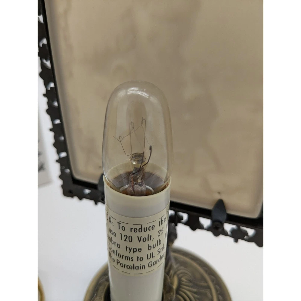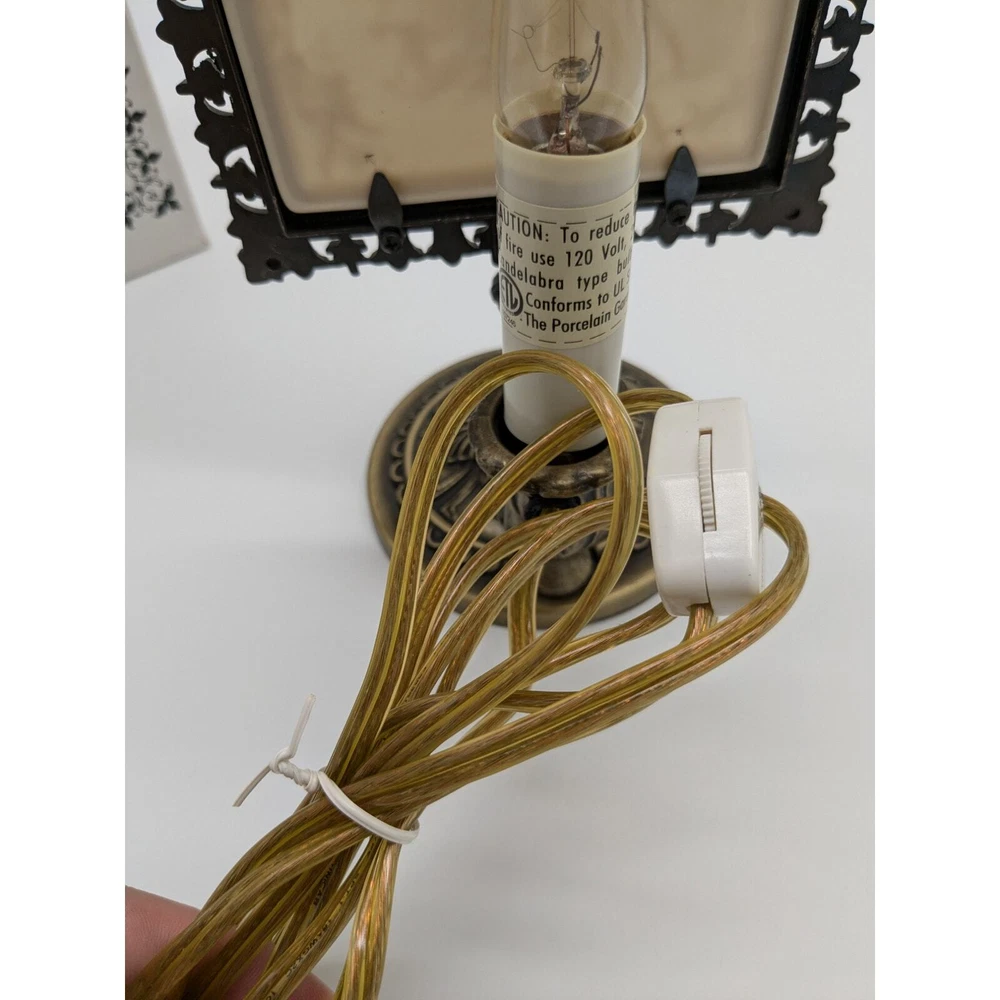 This lovely lamp is based on the original candle lit frames that were used to display Lithophanes in the 19th Century. It makes a great accent piece on a night stand, dresser, shelf, mantle, or bookshelf. This solid cast metal light stands 9 ¼“ tall, 4 3/4" wide, the base is 3 3/4" in diameter, and is finished in antique brass. A "candle cup" in back holds the raised light bulb socket, so the bulb is centered perfectly behind the porcelain panel. Comes complete with 6ft. cord, a bright 25 watt bulb, and an in-line rotary switch on the cord. Nicely boxed with a brief history of Lithophanes right on the box. This is a "lithophane" Victorian Accent Lamp; featuring a thin translucent porcelain panel, made using a lost art from the 1800's. When lit from behind, the light shining through the different thicknesses of the porcelain causes a highly detailed image to appear in front, almost magically. Lithophanes were invented in France in 1827. Good Condition.