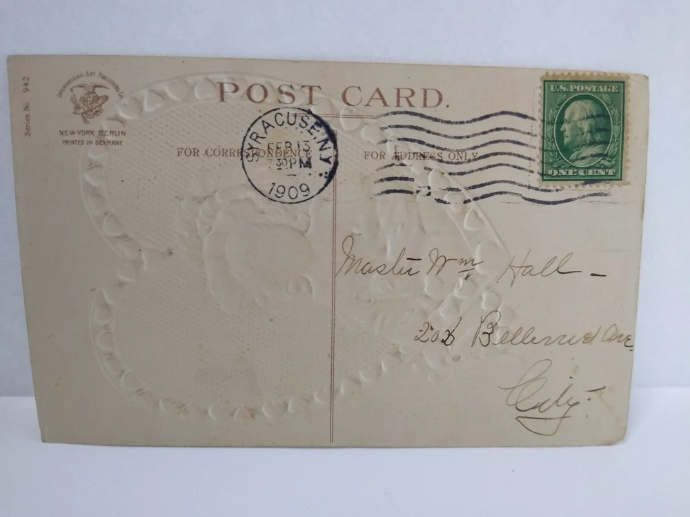 Victorian Love Greeting Valentine Postcard Ellen Clapsaddle 942 Syracuse NY 1909 Ellen Clapsaddle postcard signed on front. Series No.942 on back. Has tiny edge nibble, corner creases, and age wear. Posted with 1909 Syracuse, New York cancel and stamp. Stock #ny30. Additional vintage Halloween, Santa, Christmas, holiday postcards, are in our store. SHIPPING Bundle and save by using cart and making single payment. International buyers are responsible for any import fees/taxes. ABOUT US Seller of vintage ephemera, collectibles, retro gifts, advertising, artwork, vinyl records, pinball and arcade game flyers and parts, Mad magazines, antique Halloween & holiday postcards, Christmas items, super hero memorabilia, horror themed art, fun stuff. Combine to save by using the cart!