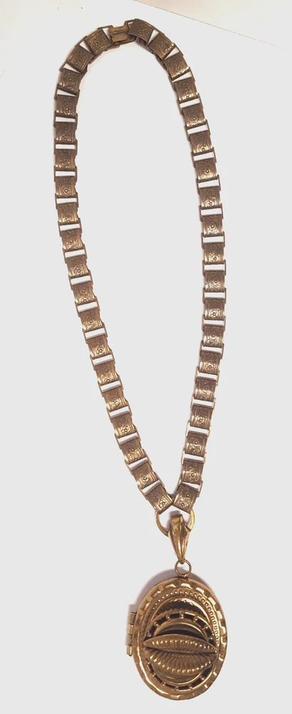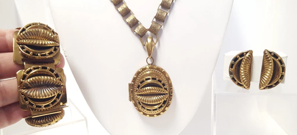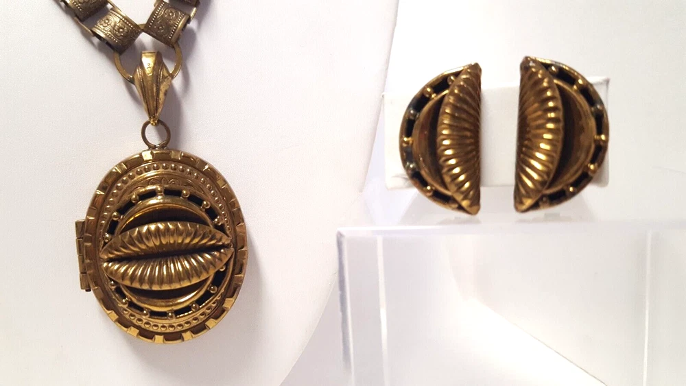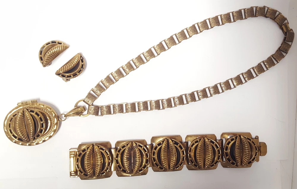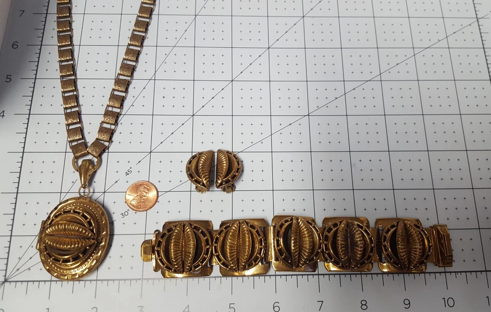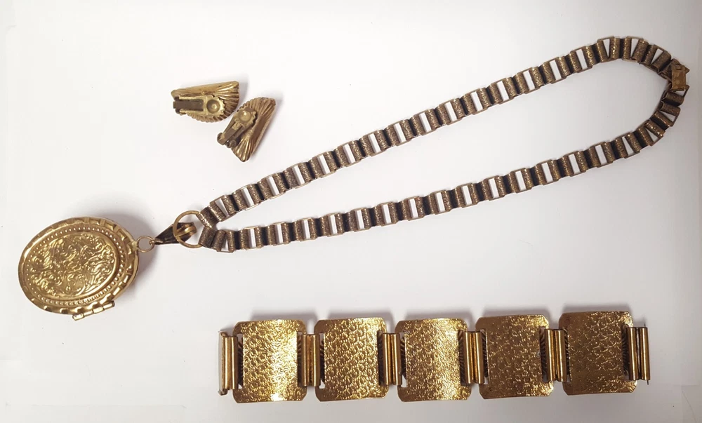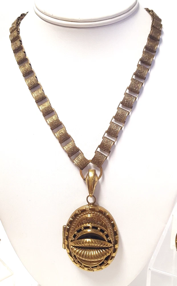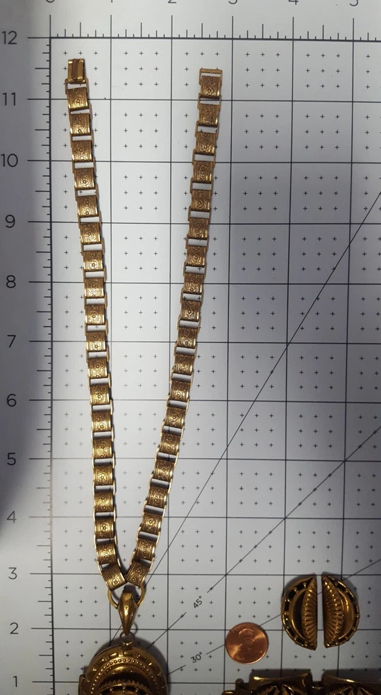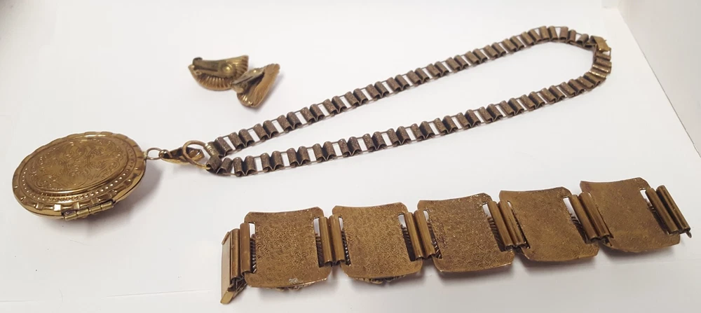 Victorian Revival Book Chain Locket Necklace Bracelet Earrings Vintage Set -pre-owned vintage or antique matched set- locket necklace / bracelet / earrings -possibly signed on the bracelet clasp, CCCO ? -book chain necklace with a photo locket pendant, the inner keeper frames and plastic are in locket -possibly a Pinchbeck style, metal is brassy or bronzy tone gold color closures are - necklace has a fold over bar, bracelet has a box or tab and slot clasp, and earrings are clip-ons - m easures approximately - necklace chain 18" length, pendant including bail- 2-3/4" long -bracelet is 7" long x 1-1/4" wide - earrings are 1-1/8" tall each -shown on a 1" grid mat with a Penny coin and in my hand for size illustration - vintage good condition- minor wear from age and use- bracelet has a discoloration shown in photos -shipped by USPS Ground Advantage Mail, Delivery Confirmation included -buyer pays shipping for returns