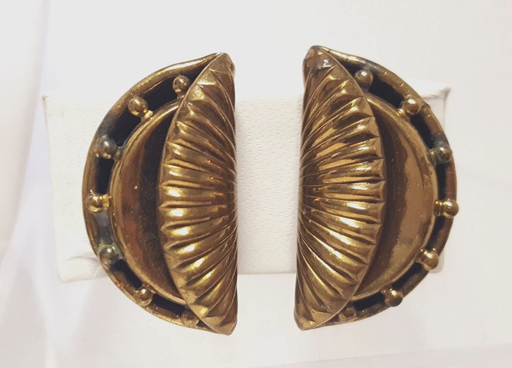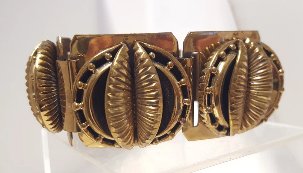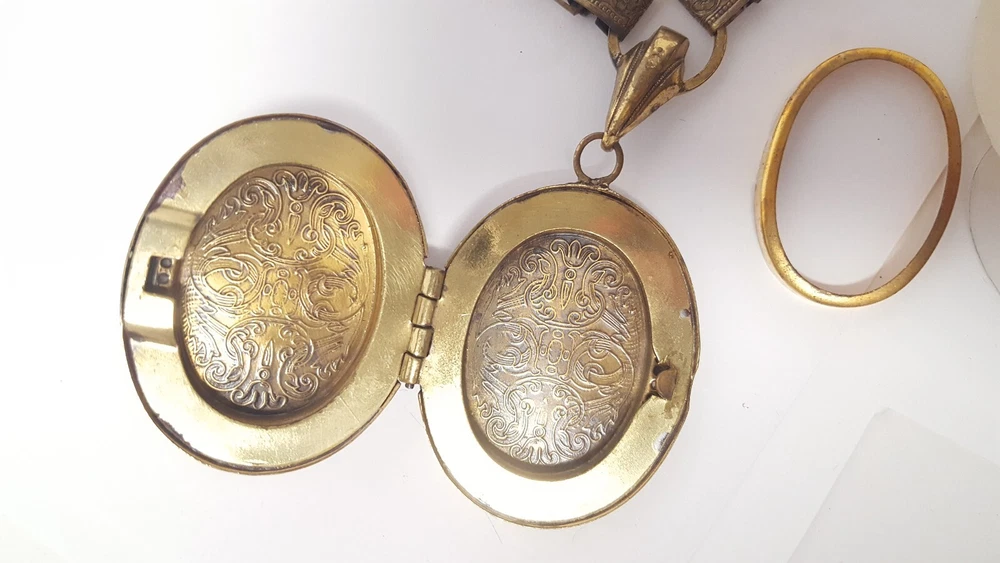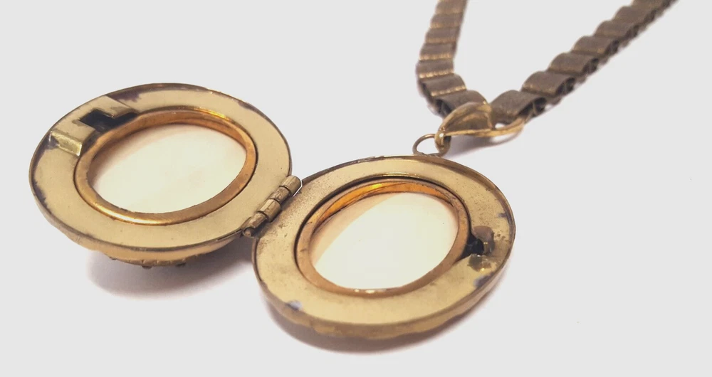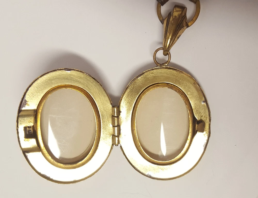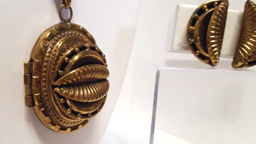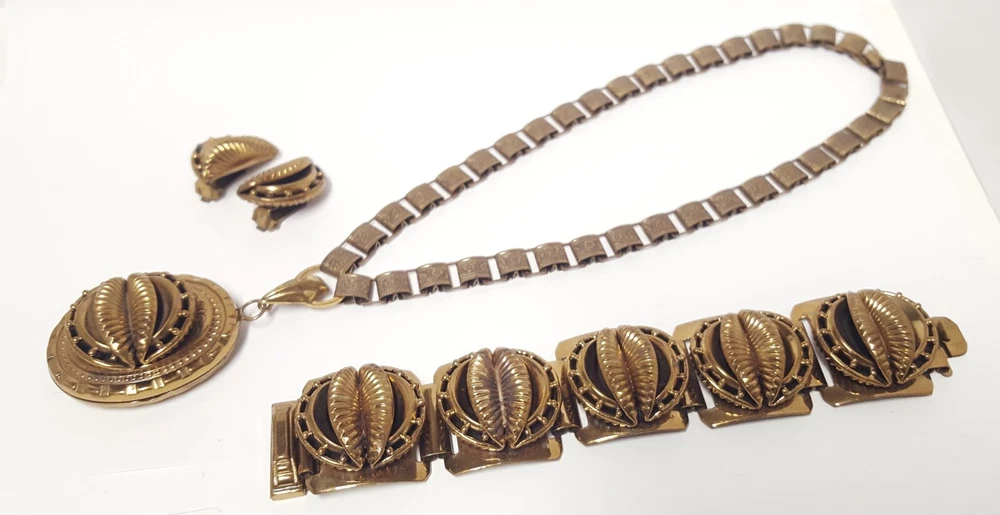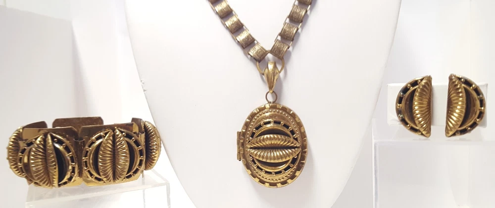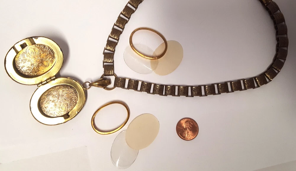 Victorian Revival Book Chain Locket Necklace Bracelet Earrings Vintage Set -pre-owned vintage or antique matched set- locket necklace / bracelet / earrings -possibly signed on the bracelet clasp, CCCO ? -book chain necklace with a photo locket pendant, the inner keeper frames and plastic are in locket -possibly a Pinchbeck style, metal is brassy or bronzy tone gold color closures are - necklace has a fold over bar, bracelet has a box or tab and slot clasp, and earrings are clip-ons - m easures approximately - necklace chain 18" length, pendant including bail- 2-3/4" long -bracelet is 7" long x 1-1/4" wide - earrings are 1-1/8" tall each -shown on a 1" grid mat with a Penny coin and in my hand for size illustration - vintage good condition- minor wear from age and use- bracelet has a discoloration shown in photos -shipped by USPS Ground Advantage Mail, Delivery Confirmation included -buyer pays shipping for returns