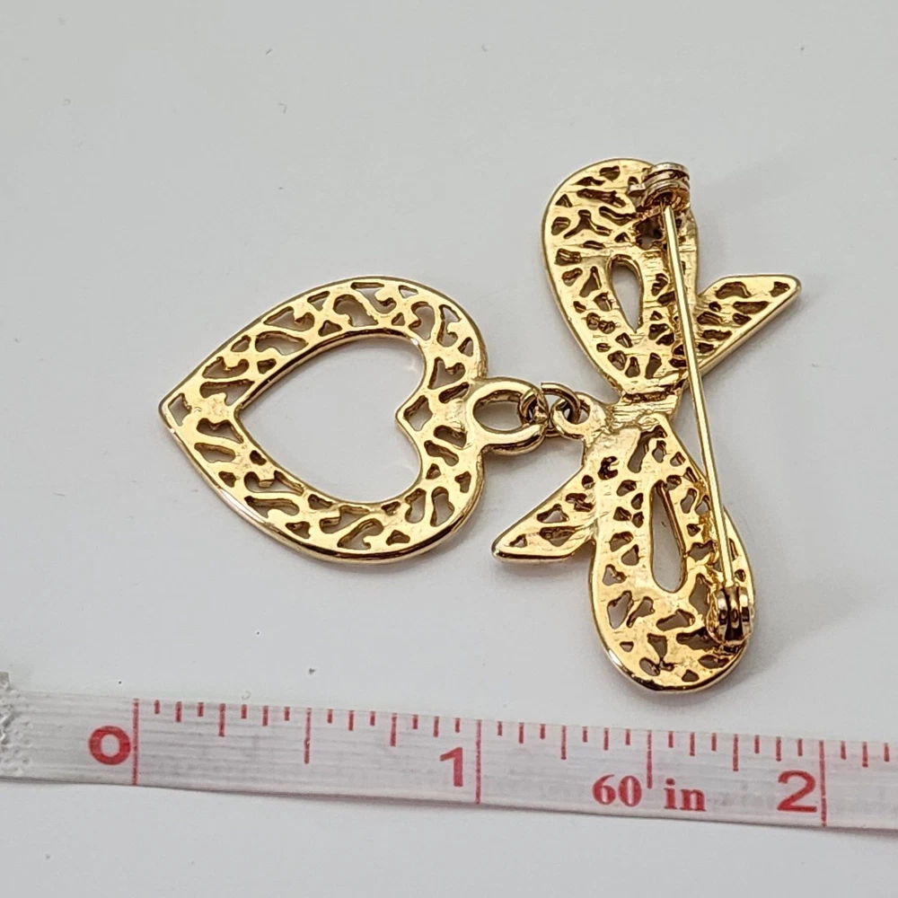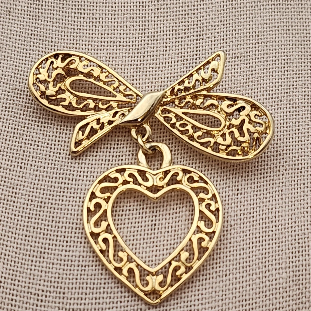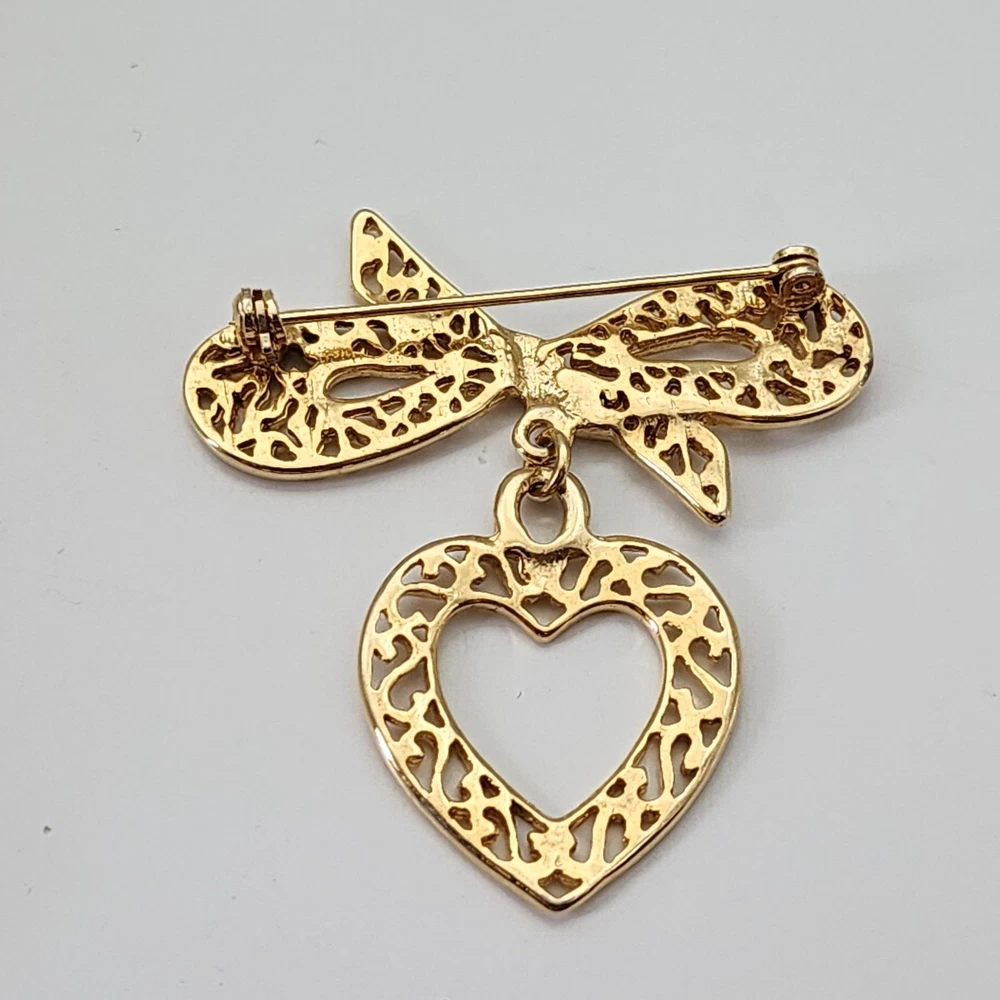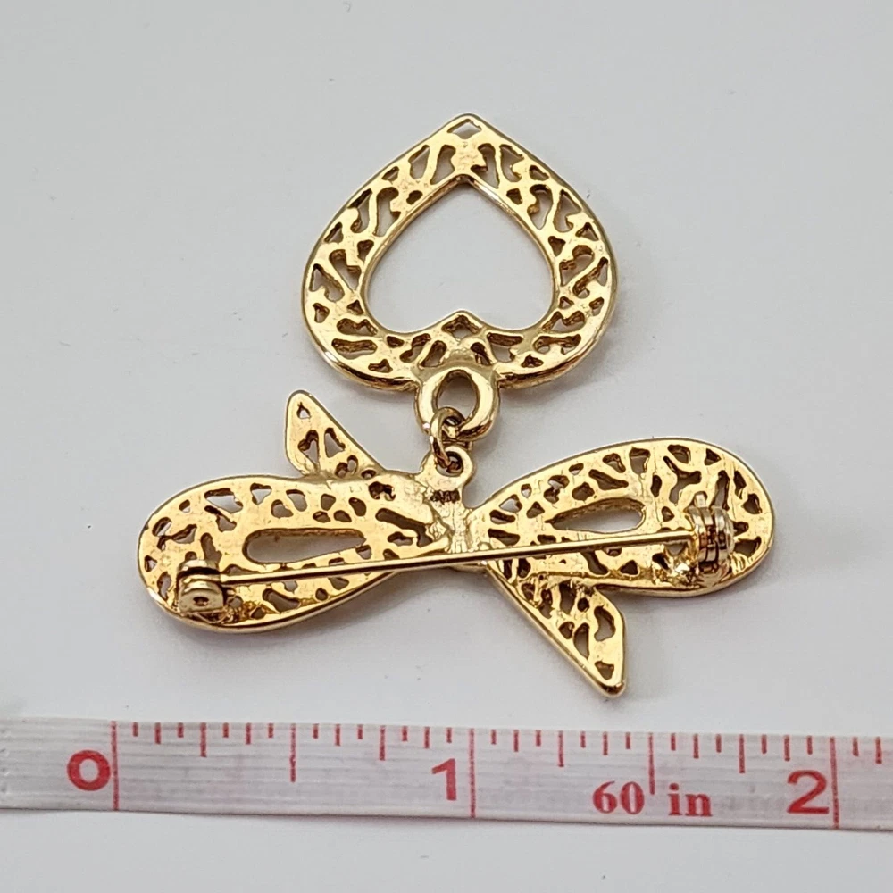 Victorian Style Filigree Bow Open Heart Dangle Yellow Gold Tone Brooch Pin