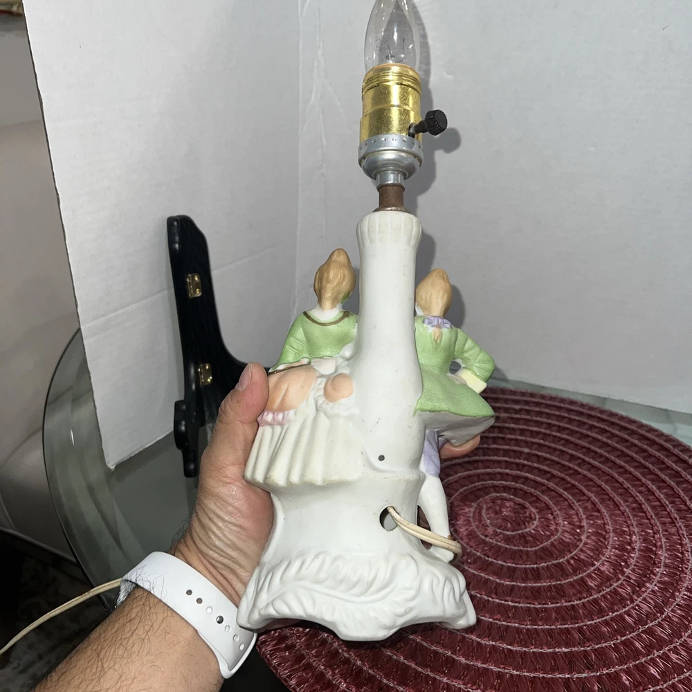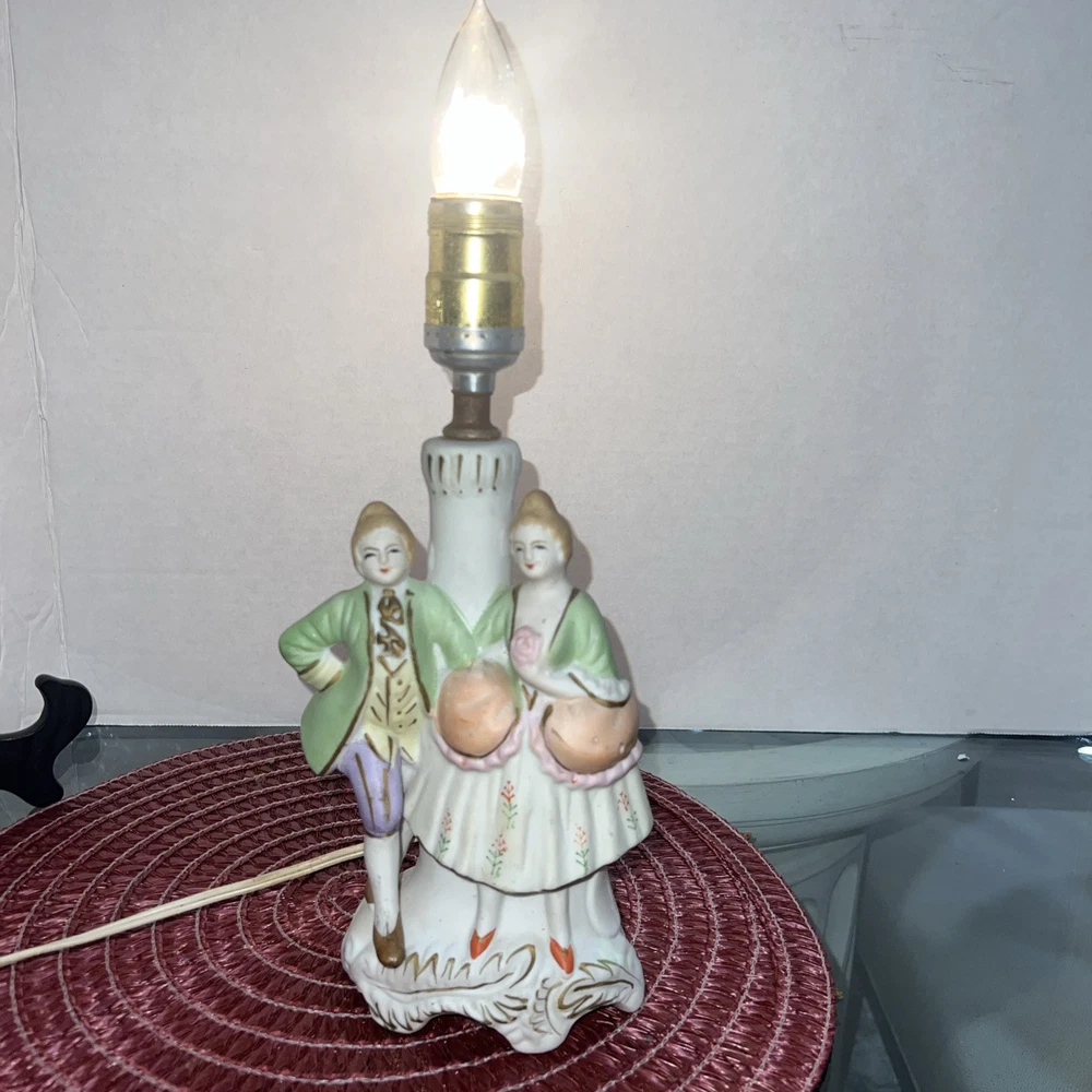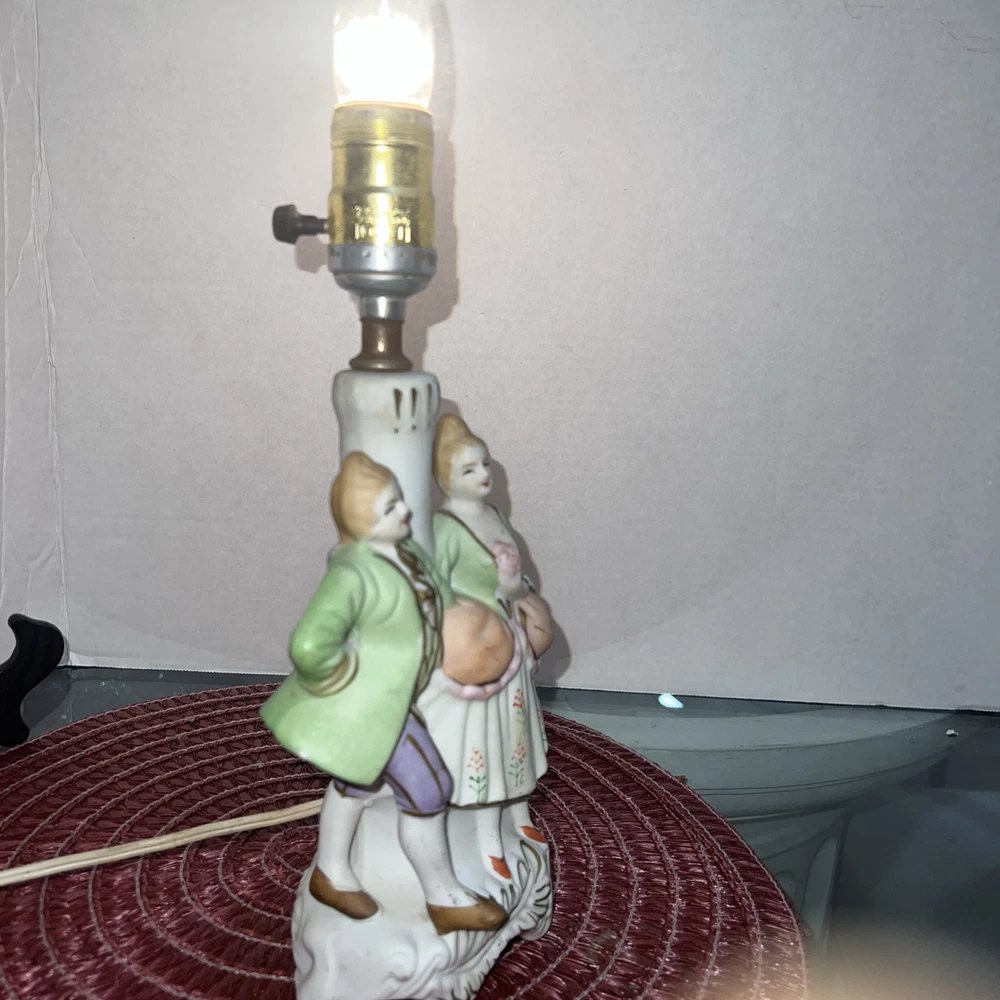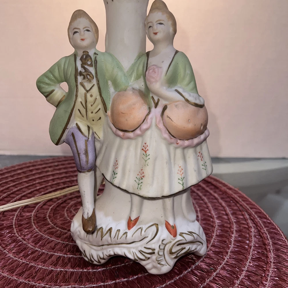 This Victorian table lamp features a courting couple design, making it ideal for a bedroom boudoir. The lamp is of vintage style, made of ceramic & porcelain with a multicolor finish. It is a medium-sized electric lamp with a white cord. Perfect for adding a touch of Victorian charm to your bedroom decor. Tested and working great Look at the pictures and ask questions before making your purchase