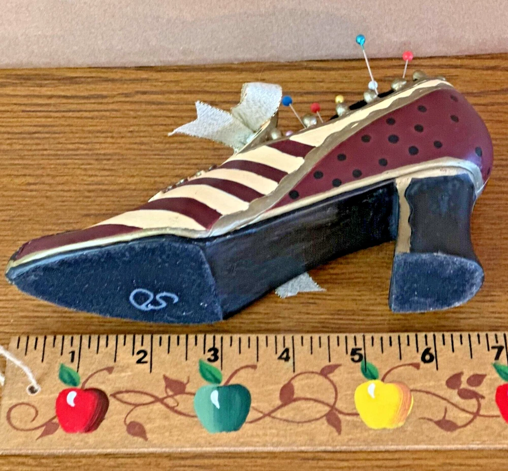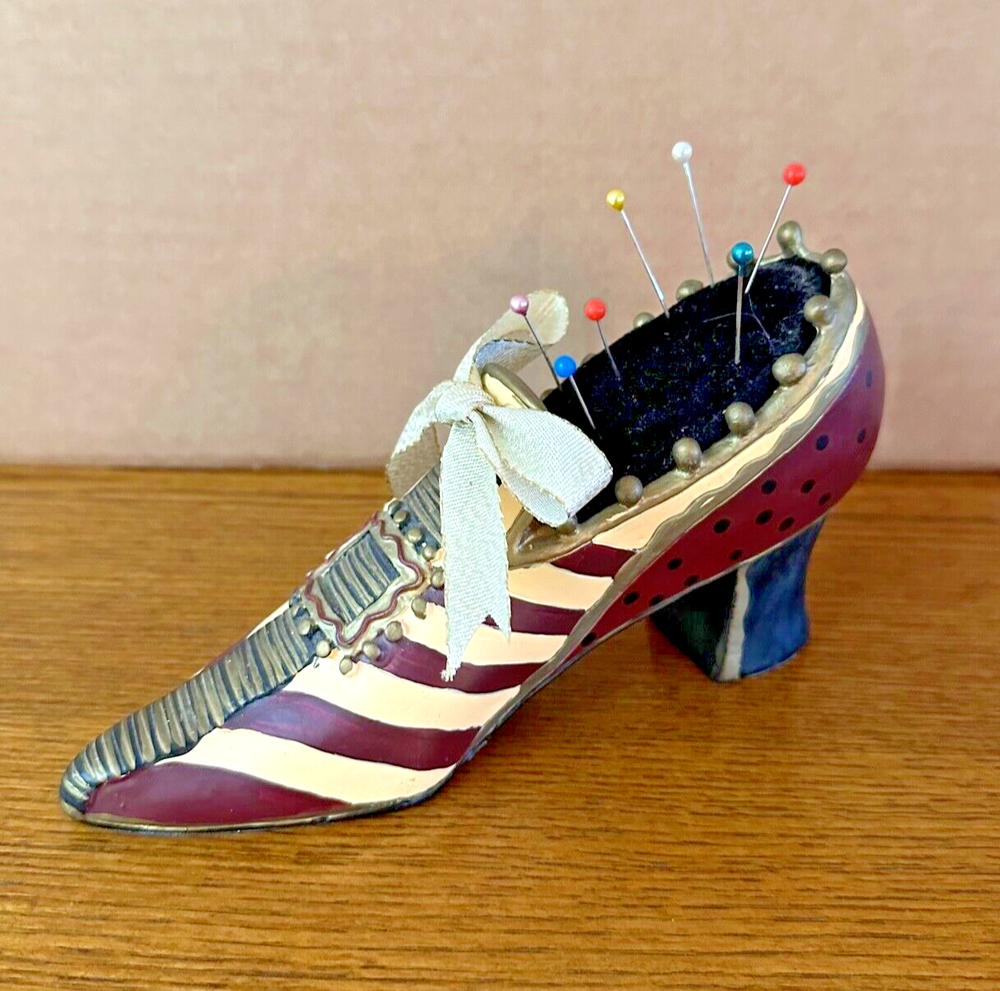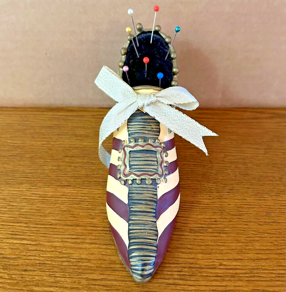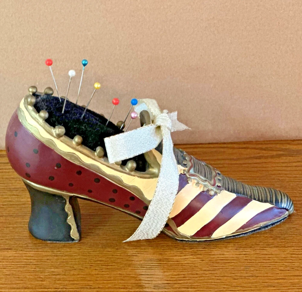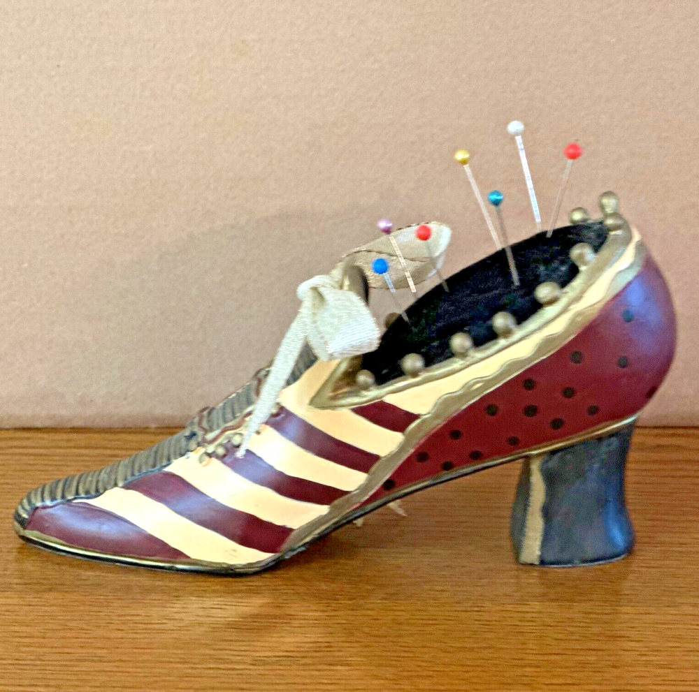 This vintage pincushion is absolutely charming! The hand-painted ceramic shoe has beautiful details in tan, maroon, gold, and black with a delicate ribbon bow. The felt sole adds a nice touch, and the colors are still vibrant with no chips—perfect condition! It's both a functional and decorative piece that adds a lovely Victorian flair to any sewing space. Shipping was quick and secure—very happy with this unique find!