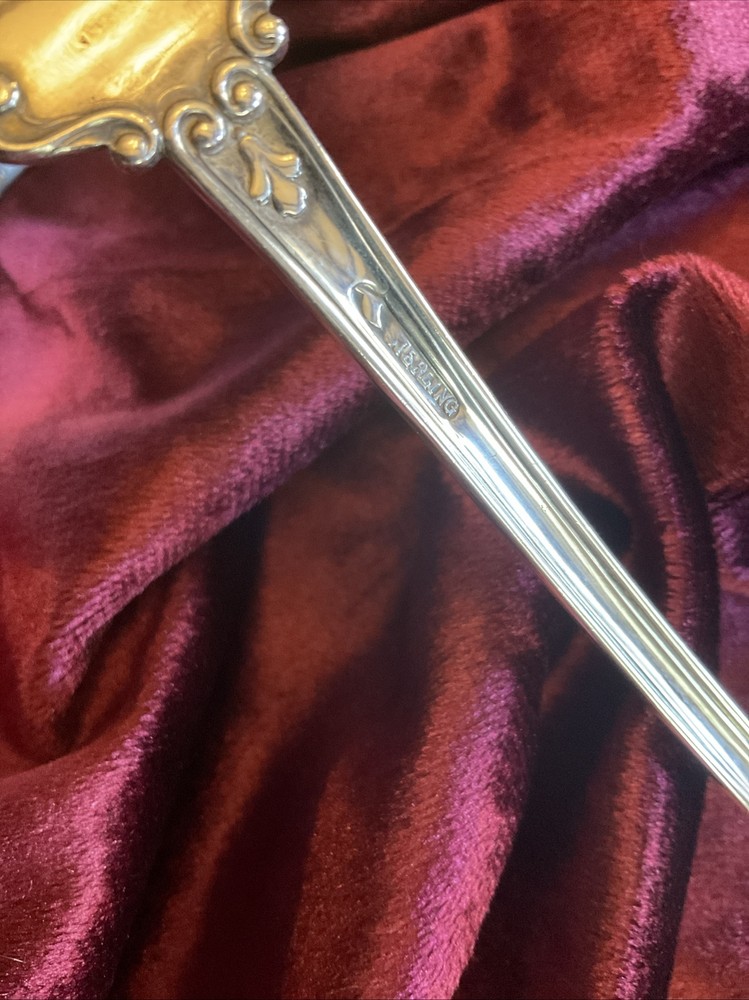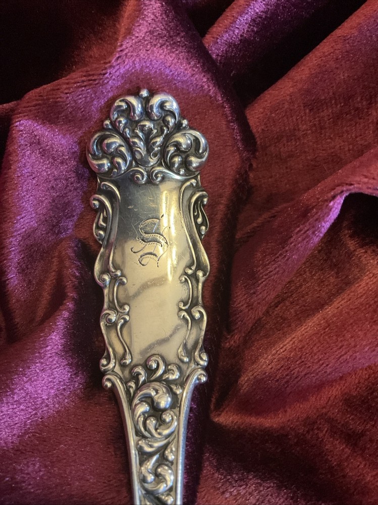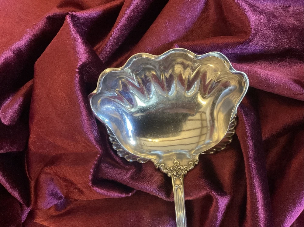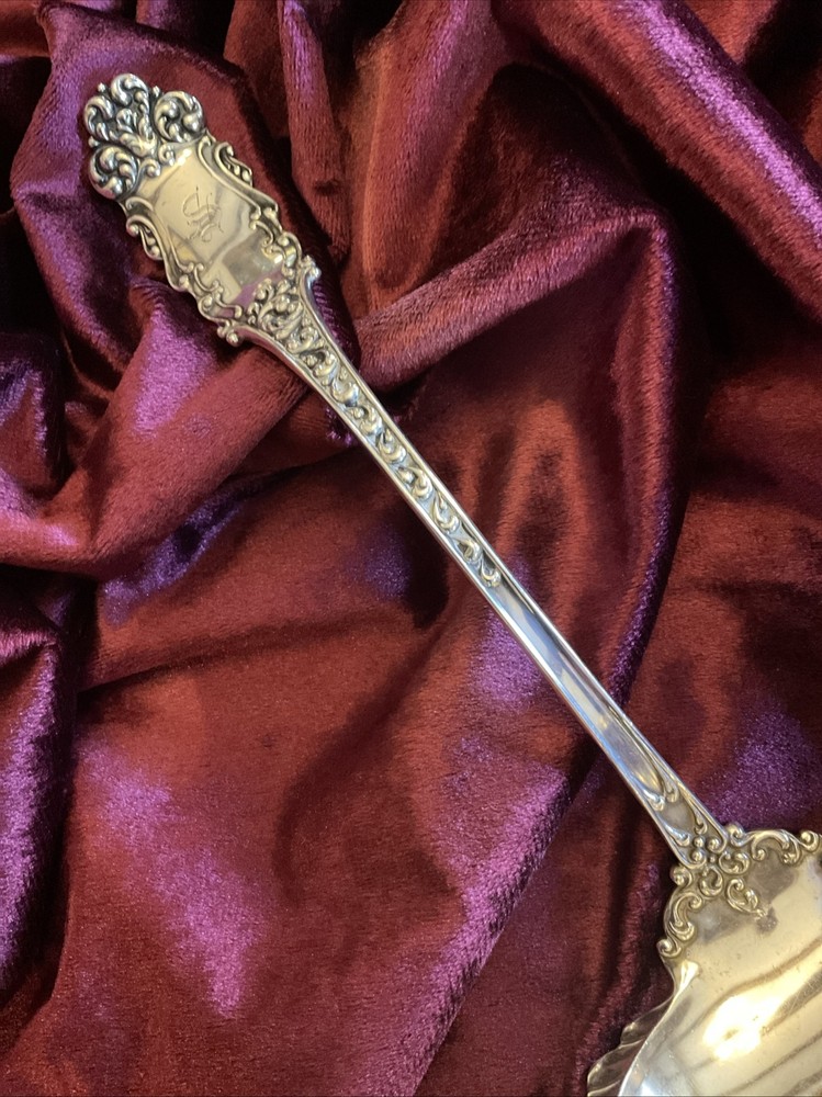 VICTORIA (old) by Watson Silver. First made in 1890 and long discontinued. Heavy, at 167 grams, 10” soup ladle with a 4 ounce crenellated bowl. Monogram of gothic “S” As there is little on the market like this so I am going to start high and see what happens.