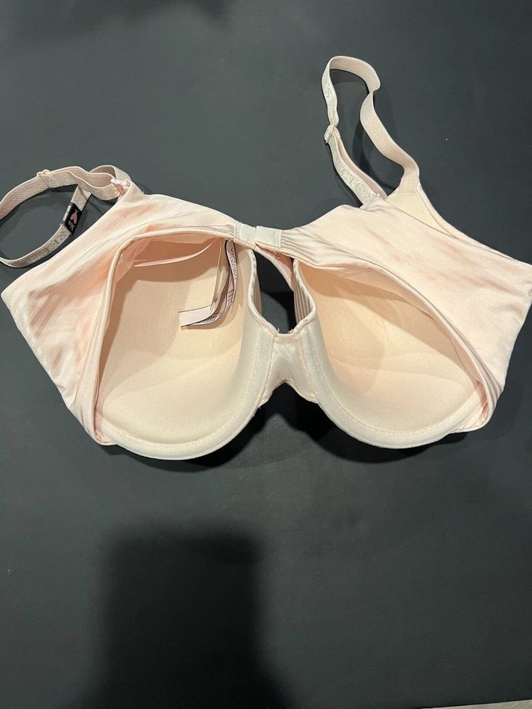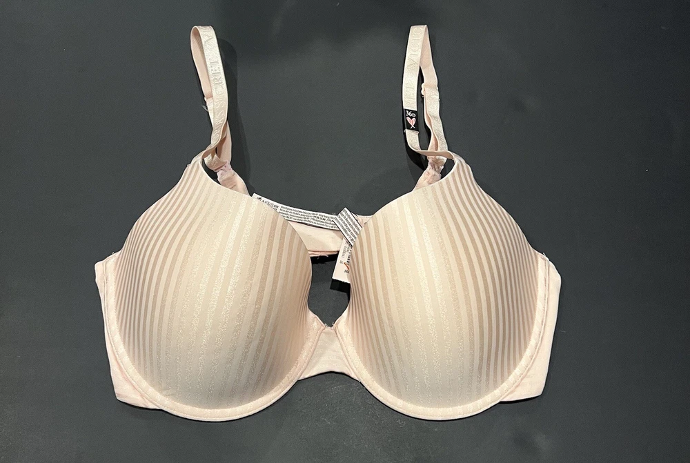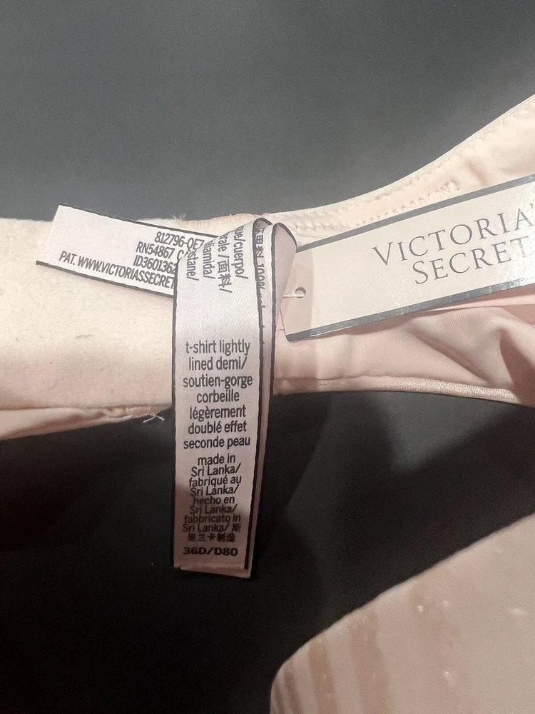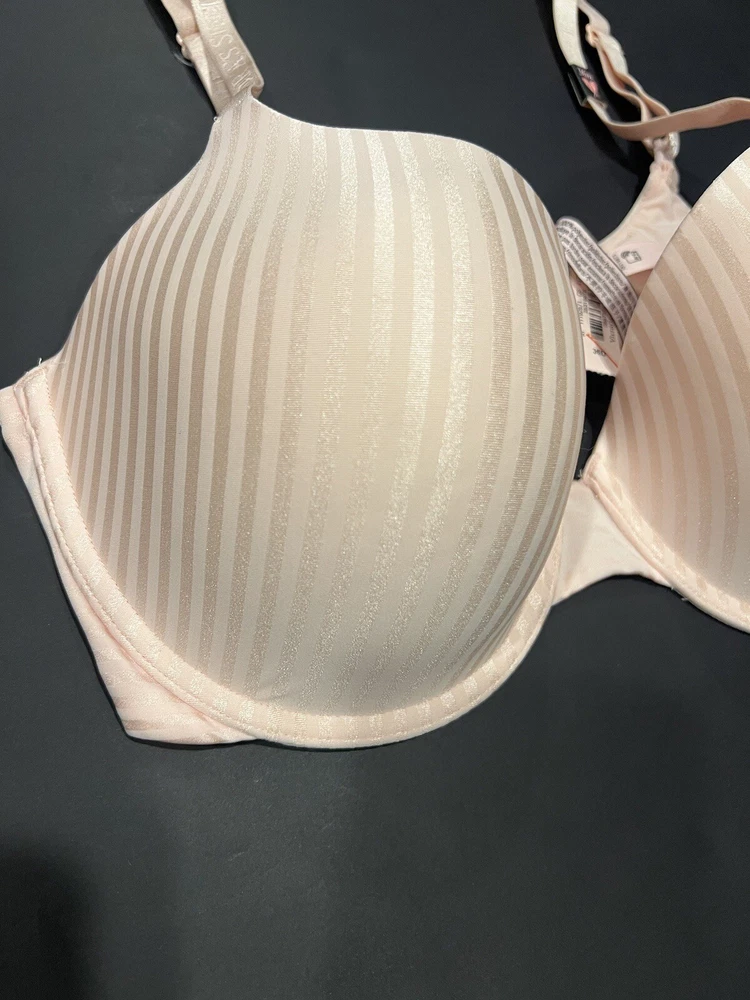 This Victoria's Secret bra is a T-shirt style in size 36D, featuring a pink striped design with lightly lined cups for a comfortable fit. It has a bra strap closure with underwired support, made from a polyamide blend fabric for a soft feel against the skin. The demi style offers a classic and timeless look, perfect for everyday wear. This new-with-tags bra is part of the Victoria's Secret Body By Victoria collection, designed for women seeking both style and comfort in their undergarments.