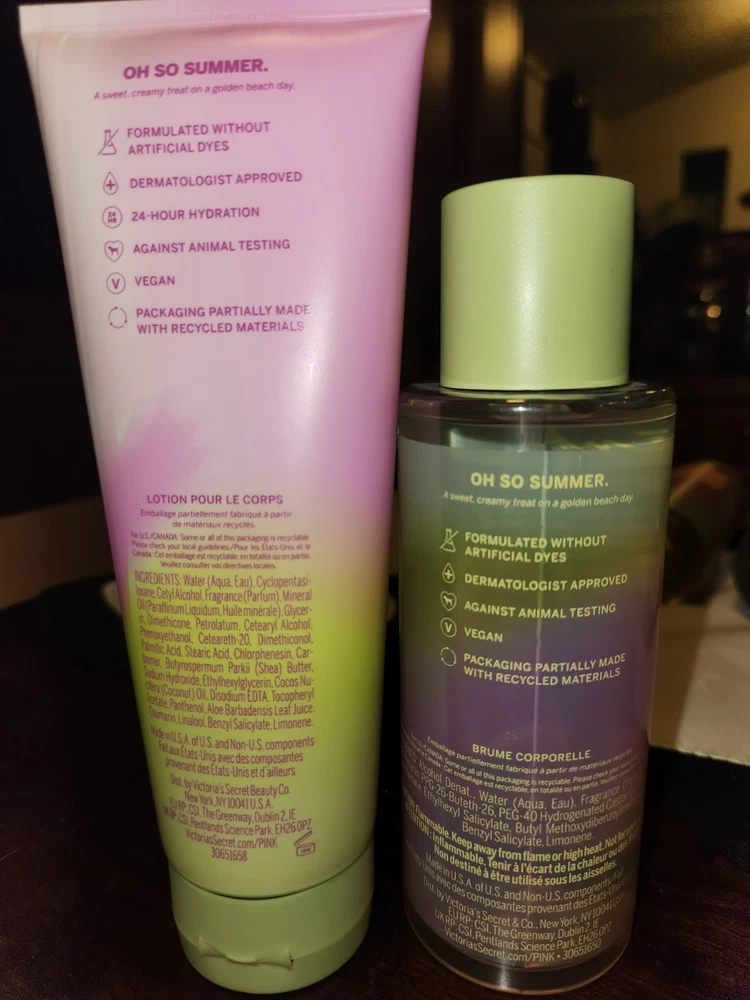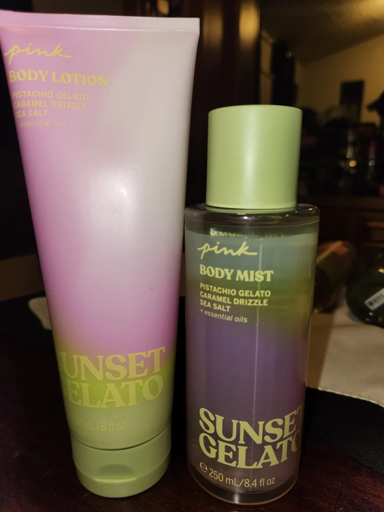 Lot of 10, Victoria's Secret & Victoria's Secret Pink items. All items are new, and discontinued. Lot includes: Victoria's Secret: Daring body mist, Pistachio Creme mist, Darling Vanilla Jasmine mist, Sweet Sugared Violet mist, Victoria's Secret Pink: Comforting Body Milk, Vanilla, Sunset Gelato mist and sealed Sunset Gelato body lotion, Bubbly Light & Happy, & Two Brown Sugar body lotions sealed.