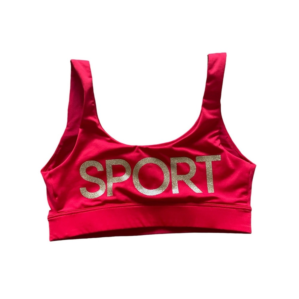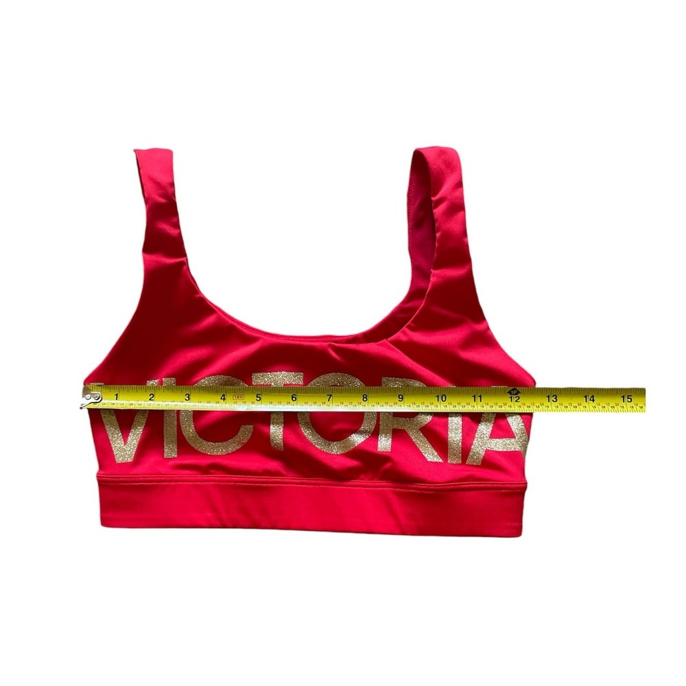 Victoria’s Secret Sports Bra with Gold Glitter Lettering Womens Size XS/S Size tag cut out Pay close attention to measurements NWOT no flaws Keywords: Victoria Secret, VS, Sports Bra, Red and Gold, Loungewear, Casual, Streetwear