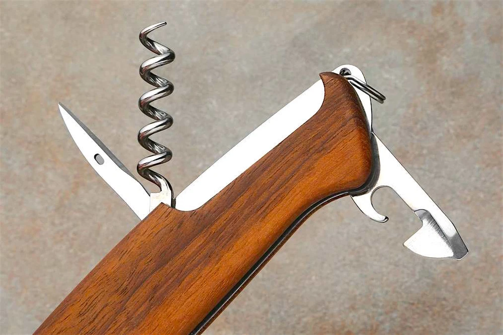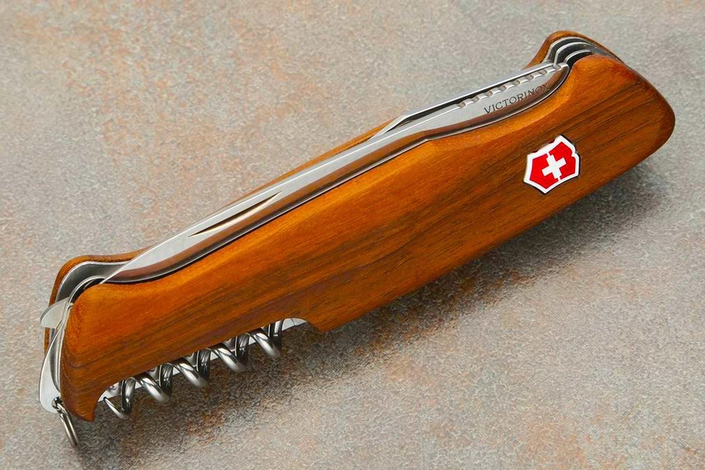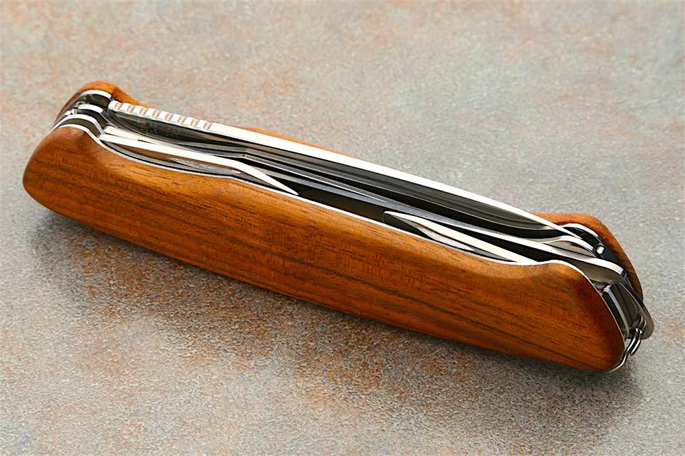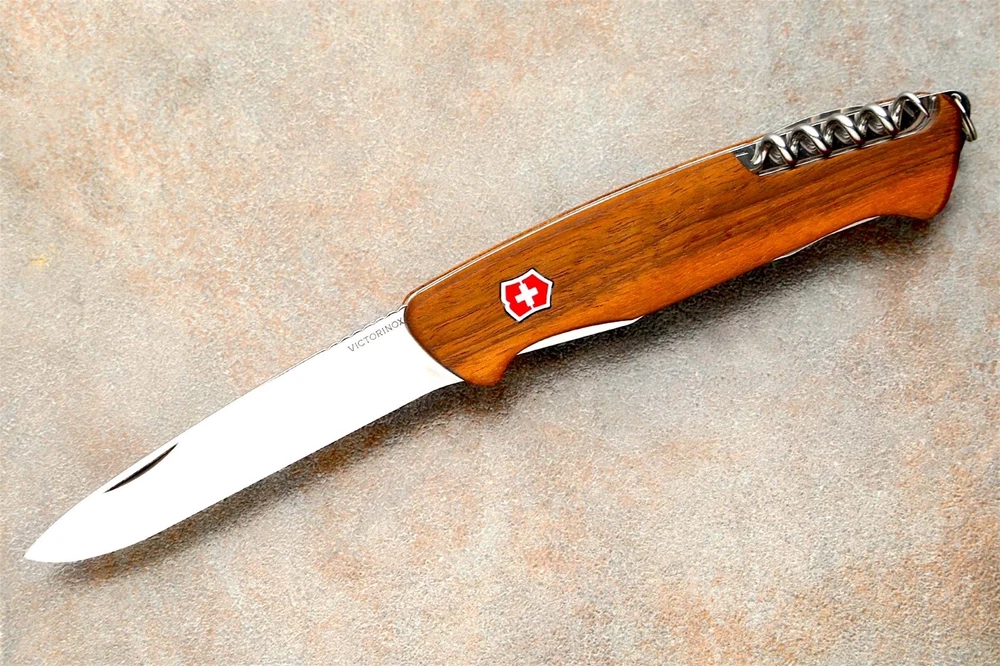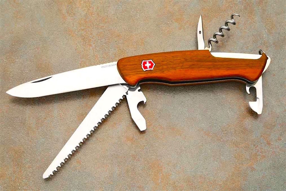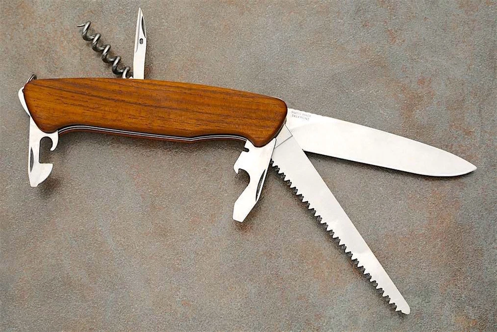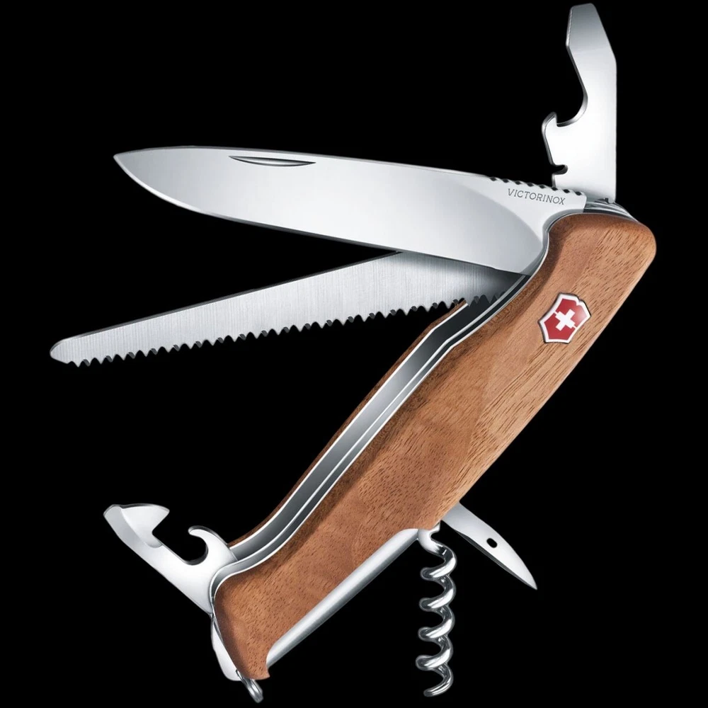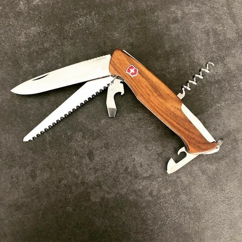 ….................... Victorinox Rangerwood 55 Multitool Kit Made In SWITZERLAND From the makers of the original Swiss Army Knife comes the Red Dot Award-winning Victorinox Rangerwood 55. Constructed with a natural walnut handle that’s smooth to the touch, this handy tool feels as good in the hand as it looks. Packed into the handle are 10 different functions for different situations. It features a nearly 4-inch long blade, a wood saw, two screwdrivers, a bottle opener, and more to help you tackle a wide range of tasks. The blade locks in place with a liner lock and can be closed by pressing on the unique signature Victorinox logo shield release. The RangerWood 55 features: • 3.9" Locking Blade W/ Safety Lock (pushbutton release) • 4.2" Double-Cut Wood Saw • Can opener • Reamer • Corkscrew • Key ring • Genuine top quality natural walnut handle grips A Very Well Made Attractive And Useful Pocket Knife !! Makes A great Gift !! .....................