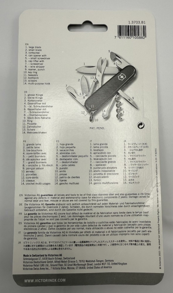 NEW IN BLISTER PACK The Victorinox Swiss Army Knife Climber in red is a versatile and compact pocketknife with stainless steel blades. It features a manual opening mechanism and comes with a variety of tools such as a key ring, punch, toothpick, corkscrew, screwdriver, scissors, tweezers, bottle opener, multipurpose hook, and can opener. The knife has a drop point blade type, plain blade edge, and a plastic handle for durability and comfort. Ideal for outdoor enthusiasts and collectors, this Victorinox knife is a practical and reliable tool for everyday use.