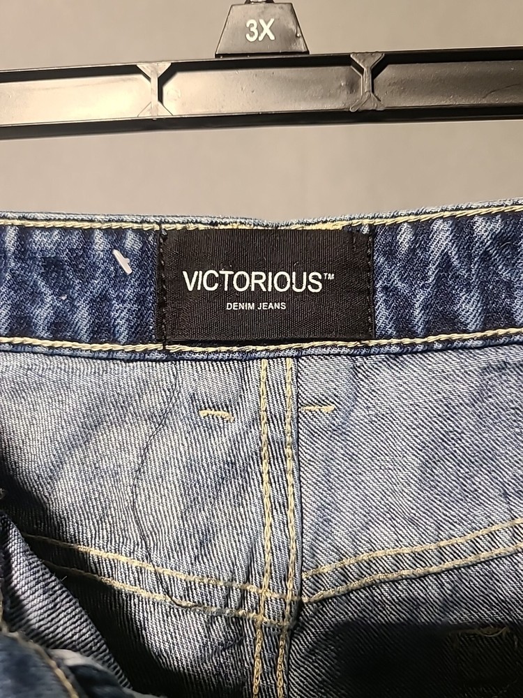 Elevate your style with these baggy jeans from VICTORIOUS. These relaxed fit jeans are perfect for skaters and hip hop enthusiasts. Made from durable denim, these jeans feature a wide-leg style, a high rise, and a 5-pocket design. The distressed patches add a unique touch to the vintage look, making them perfect for any season. These medium wash jeans are machine washable and have a waist size of 34 inches with a 30-inch inseam. Excellent pre-owned condition. Stored in AC pet smoke free facility. Thanks for shopping by. Packed and ready to ship!