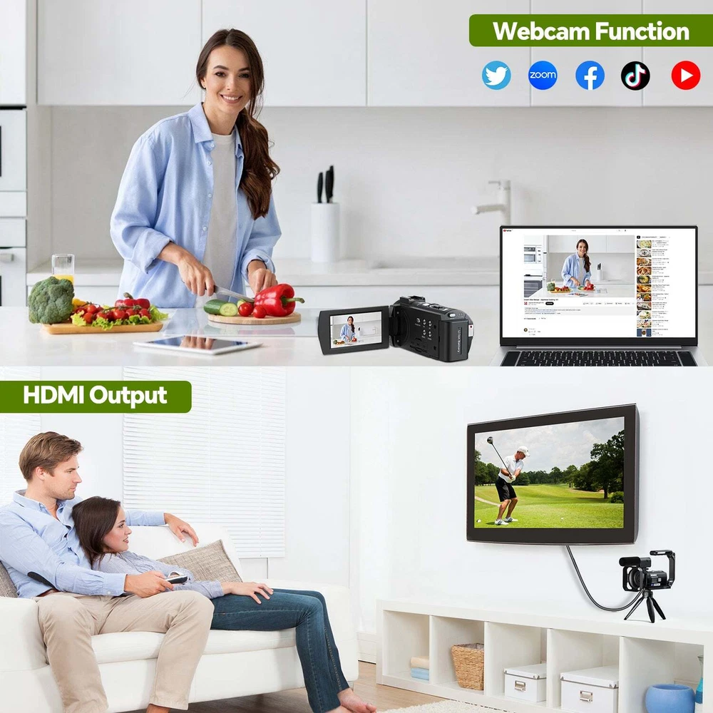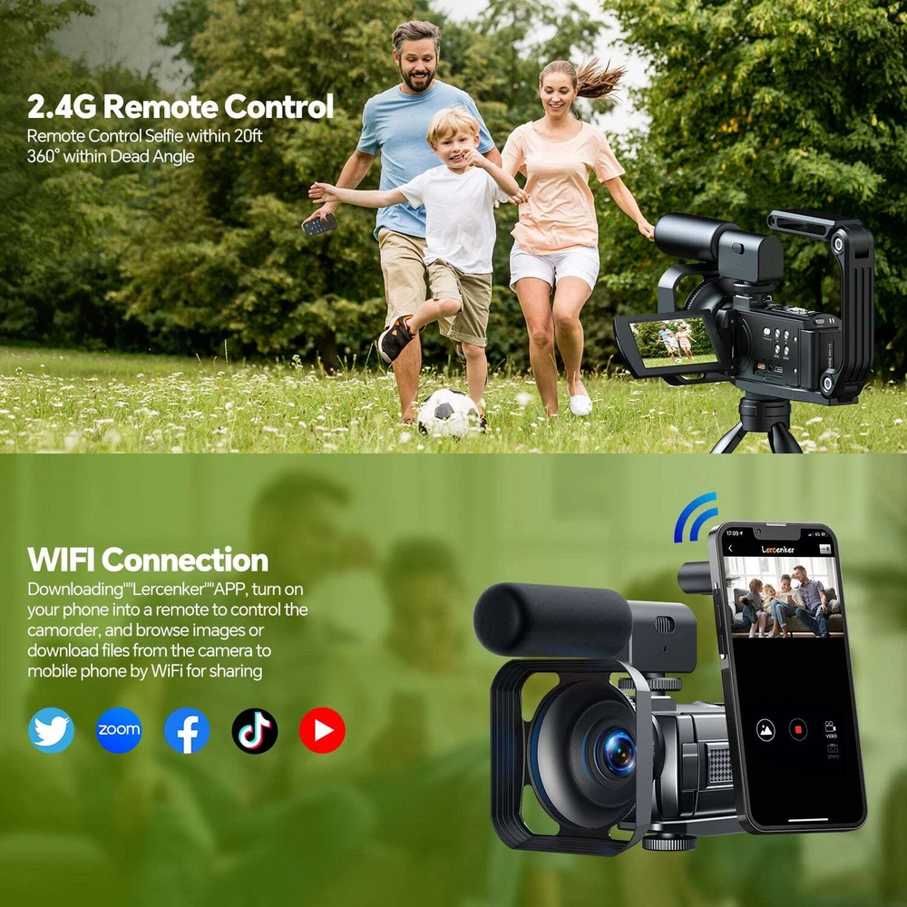 【2024 New upgrade】 US STOCK! Fast delivery, Fast received!!! CAMPARK 5K 56MP Video Camera Camcorder IR Night Vision YouTube Vlogging Podcast Camera 5K 56MP Camcorder Video Camera WiFi 3'' 270° Rotatable Touchscreen Vlogging Camera Youtube Camera Podcast Recorder Video Camera with 64GB SD Card, Remote Control, 2 Batteries, Hood, Microphone, Tripod 【5K & 56MP Video Camera with 64G Card】 The video camera delivers UHD 5K video and 56MP photos, giving you a stunning visual experience. Paired with a 3.0 inch 270°rotation touchscreen, you can shoot at any angle. The digital camera supports 16x digital zoom, making it easy to capture distant scenery. Comes with a 64G SD card to plug and play.This handycam is an ideal camera for meeting,wedding, parties, travel. 【IR Night Vision & WiFi Function】 The vlogging camera with IR night vision technology that can helps illuminate dark environments,take clear white/black photos or videos in the dark.The vlog camcorder supports WiFi function and comes with two large-capacity rechargeable batteries, which can recording while charging, extending the shooting time, suitable for beginners, teenagers, youtubers. 【Webcam Function & 2.4G Remote Control】 This 5K YouTube camera can be used as a webcam or a live streaming camera.You can also use the included HDMI cable Connect this vlog camera to your TV to share pictures and videos with family and friends,equipped with a 2.4G remote control, which can control the camera from multiple angles, allowing you to place it on the included tripod for control. 【Handheld Stabilizer & Lens Hood】 This 5K video recorder comes with a foldable handheld stabilization stand to keep the camera stable while recording, easily record sports moments. Lens hook blocks excess light for clear footage and protects your camera lens from accidental damage. External microphone can reduce noise, improve audio and video quality, make video sound clear and stable. 【Multi-Function & After-sales service】 The blogging camera support pause function, anti-shake, Selfie, time-lapse shooting, slow motion, loop recording, recording while charging, webcam, HDMI output, which will meet your different needs. Supports external tripods and LED fill lights. If you encounter any problems, please contact us in time. We will support 1-year After-sales service. Package include: 1×Video Camera Camcorder 1×USB Cable, 1×HDMI Cable,2×Batteries 1×Camcorder Bag, 1×Handheld Stabilizer 1×Microphone, 1×Tripod, 1×Remote Control 1×User Manual 1x64GB SD Card Warm Tips: 1.The 5K camera video Supports U3 speed 64 GB SDHC Card(included). 2.Do not insert or remove the memory card during as this will damage the memory card lose date. 3.Before using the remote control, please remove the battery protection sheet of the remote control. PIease aim the remote control at the remote control receiver, and do not block it. 4.If choose "PC camera", you need to do download the corresponding software. 5.Once EIS is turned on, 5K/25fps resolution cannot be chosen. Once EIS is turned on, the "W/T" zoom function cannot used. 6.Once loop recording is turned on, new videos will overwrite old videos. Please save important files in time. 7.Loop Reording, Slow Motion and Time-lapse Record cannot work at the same time. After turning on the special recording mode, you need to press"REC" to make the camera work in the specified mode. 8.When Slow Motion or Time-lapse is enabled, the Reord Audio is turned off by default and this setting does not work. 9.The camera WiFi can only be connected to a mobile and cannot access the internet. 10.The digital video camera with night vision has a 16x digital zoom function, but it does not support the focus function. You should therefore keep the recording distance more than 0.6 m. 11.The 5K camcorders is design for the amateurs,not for the Professional users.(Auto focus is not supported, optical zoom is not supported) Webcam Function & HDMI Output The 5K vlogging camera for Youtbe can be used as a webcam to conduct video and audio conversations and communications on the network through the podcast camera. You can also connect the vlog camera to the TV with an HDMI cable, and you can playback videos or photos with your family or friends. 5K 25FPS & 56MP &16X Digital Zoom Video Resolution: MP4, 5K 25fps; 4K 30fps; 2.7K30fps; 1080p60fps; 1080p30fps; 720p60fps; 720p30fps Photo Resolution :JPG, 5M; 8M; 12M; 16M; 20M; 24M; 36M; 48M; 56M The Youtube camera support 4x,8x,16x digital zoom 3 Inch 270° Rotation IPS Touch Screen The video camera camcorder 5K has a 3.0” LCD 270° rotatable Touch Screen which you can swivel for selfies and see exactly what you're filming. Handheld Stabilizer The foldable handheld stabilizer saves space and easy to install.Suits for recording moving objects, reducing filming camera shake and shooting clearer pictures and videos. Video Camera with Microphone There is a hot shoe mount on the top of video camera for filming, and an external microphone is installed to eliminate surrounding noise during use, and the sound quality is clearer. WiFi Connection Downloading "Lercenker" APP, easy to connect the camcorders night vision with Android/iOS smartphones and tablets. 5K WiFi camcorder enable remote view, image capture and video shooting. Adjustable Camera Tripod The digital camcorder tripod can be rotated 360° to keep the 5K camcorder video camera for youtube stable at different shooting angles.