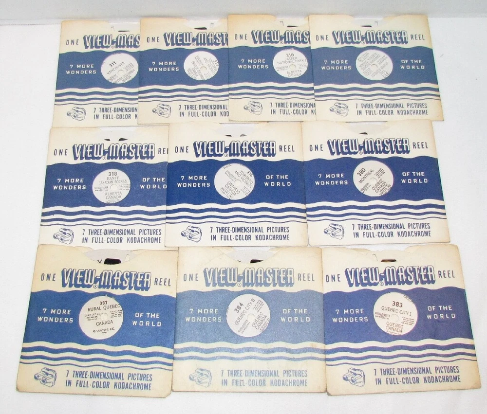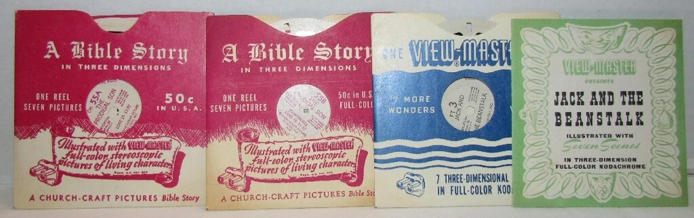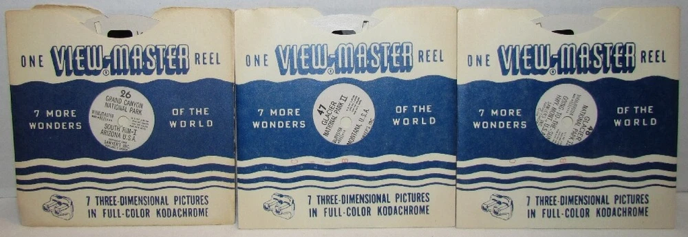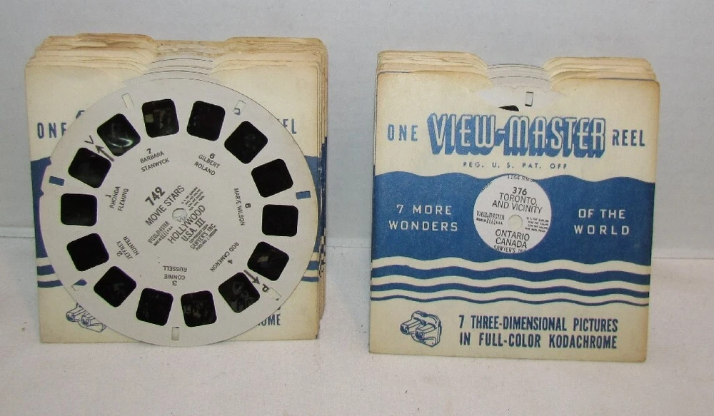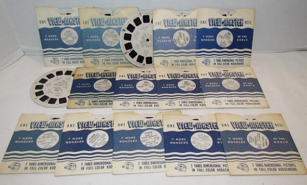 V iew-Master Single Reels & Booklets Your Choice $1-2.50 Each. Shipping $4.25 plus 10 cents each additional reel. Pick from drop down menu. Reels marked with an asterisk "*" have some light bubbling to the cardboard. They still play fine REELS 58 Golden Gate International Exposition 1940 76 Mount Vernon Virginia Home of George Washington 77 Interior of Washington's Home Mount Vernon 81 Niagara Falls New York 86 Franklin D Roosevelt's Home Hyde Park 129 Yellowstone Park 136 Washington DC Government Buildings 137 Washington CD Points of Interest 154 Atlantic City 195 Beautiful Caverns of Luray II 258 Cannon Mt Aerial Tramway Franconia Notch 260 Franconia Notch Lost River White Mountains New Hampshire 265 White Mountains New Hampshire 266 Mount Washington and Cog Road NH 298 Abe Lincoln's Salem & Springfield IL 307 Ketchikan and Vicinity Alaska 375 Niagara Falls Ontario Canada 383 Quebec City I Canada 510 Paricutin Volcano Mexico 821 Woody Woodpecker 822 Andy Panda 823 Chilly Willy The Penguin 914 Wild Animals of South America in Captivity 950 Gene Autry and his Wonder Horse Champion 972B Little John Joins The Merry Men 972C The Shooting Match at Nottingham 1200 Robert Burns Country Scotland 1402 Paris II 3301 Cairo Egypt 4000 Jerusalem The Holy City 4013 Acre Palestine 4810 Hong Kong Colony 1552 Passion Play Oberammergau Germany Part II with booklet *3113 The Matapos A 1202 Hawaii State Tour Series Reel 2 A 2753 Olympic National Park Washington *A 4153 Fort Worth Texas Reel 3 *A 2753 Olympic National Park Washington Reel 3 *A 651 Your United Nations Reels 1 & 2 *A 416 Gulf Coast Texas Reels 2, 3 B 1562 England Reel 2 *B 4841 The Man from Uncle Reel 1 *B 496 The City Beneath the Sea Reels 1,2 & 3 *B 7903 The War Between the States Reel 3 B 5152 Creature From the Beanstalk Reel Two *B 554 Fat Albert & the Cosby Kids B 6551 Vanguard Launching B 6562 Moon Rockets & Guided Missiles Reel Two B 6551 Vanguard Launching at Cape Canaveral *B 4761 Toby Tyler DR-44 Stereo Showcase of V-M Pictures FT-1 Little Red Riding Hood with booklet FT-2 Hanse and Gretel FT-3 Jack and the Beanstalk with booklet FT-7 The Three Little Pigs FT-8 Little Black Sambo with booklet FT-11 The Pied Piper of Hamelin RP-B 3619 The Wizard of Oz Reel 2 SP-9018 Ausable Chasm New York