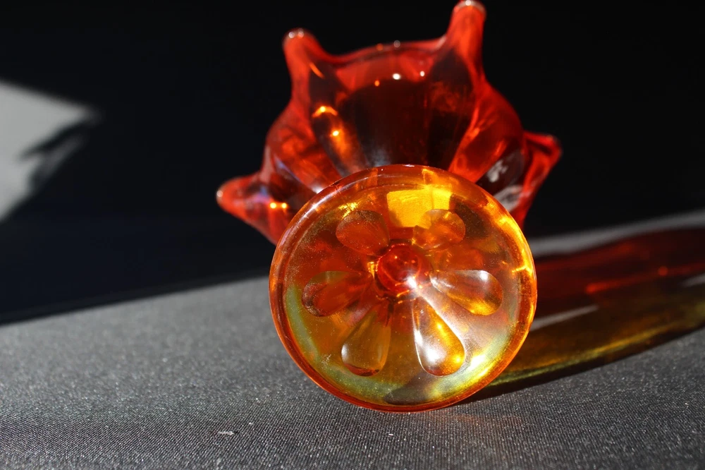 The Viking Epic Amberina Swung Glass Handkerchief Vase is a stunning piece of Mid-Century Modern art glass. Standing at 7.5 inches tall, this vase features a unique 6 petal pedestal design in a vibrant orange color, typical of the Amberina glass style. Hand-blown in the United States during the 1960s, this abstract art piece by Epic is a beautiful representation of the era's artistic style and craftsmanship. Perfect for collectors of vintage glassware or those looking to add a touch of retro beauty to their home decor.