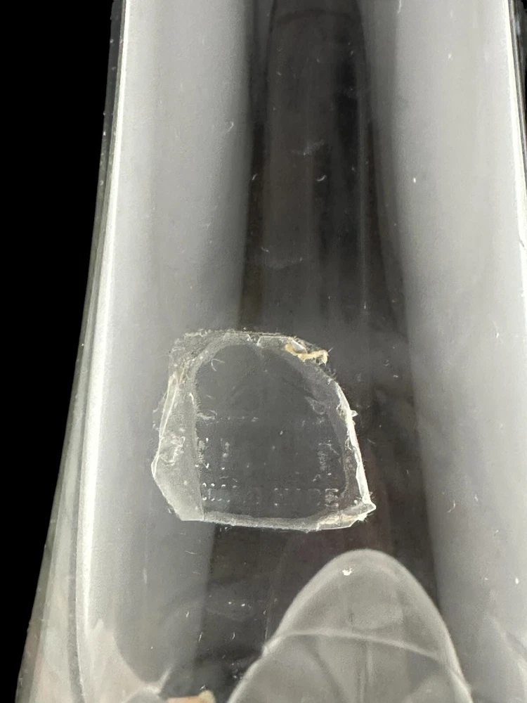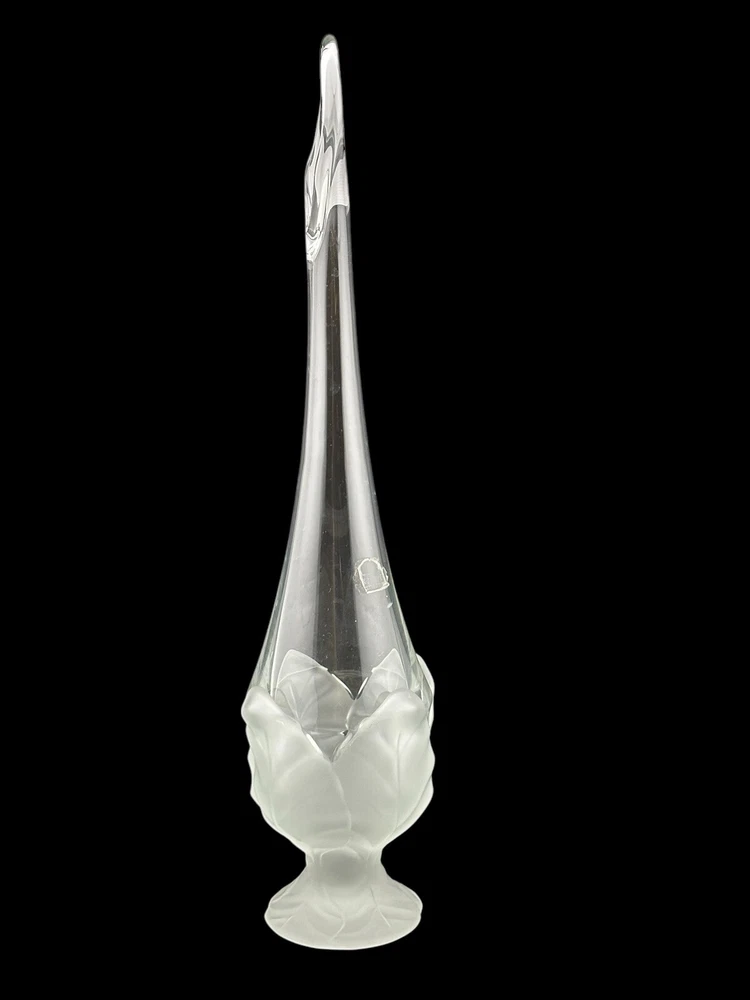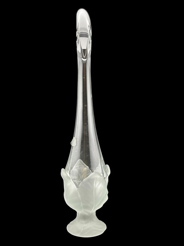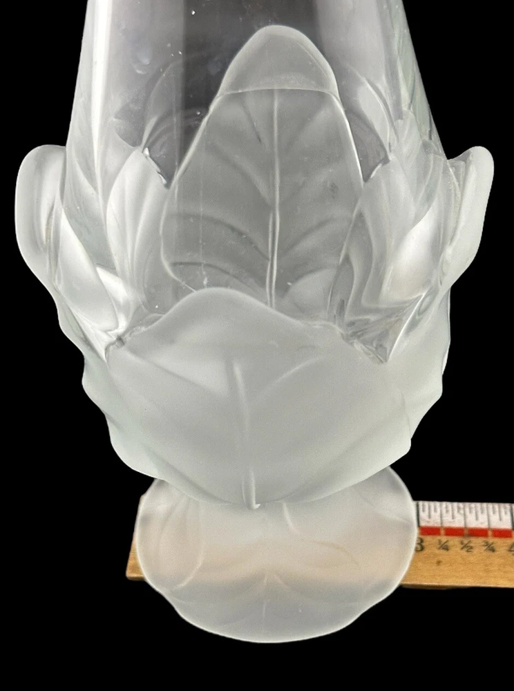 Viking Epic Leaf Cabbage Swung Vase Clear Satin Glass Stretch 15 3/4” Tall Vtg The original sticker has rolled edges. There are water spots on the inside. If you have the right cleaning products and equipment that lets you get inside the vase, you should be able to get them cleared out. Approximate Dimensions: 15 3/4” tall