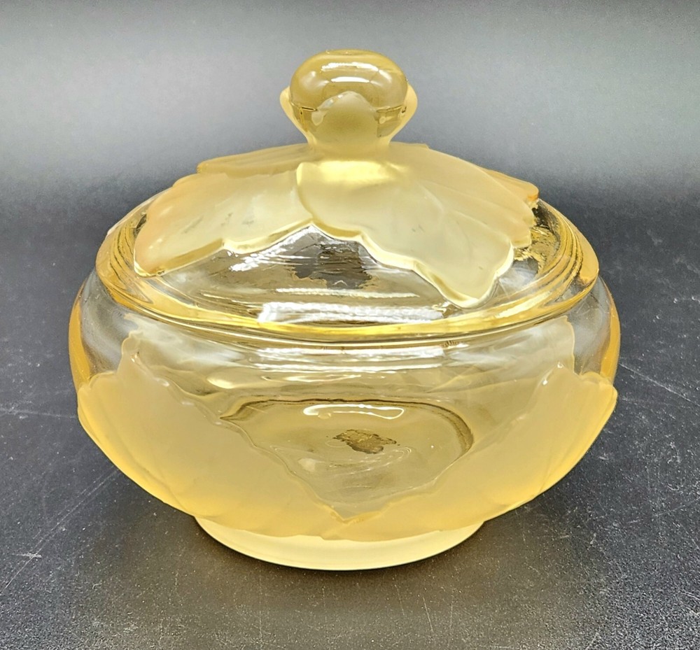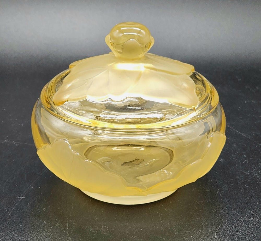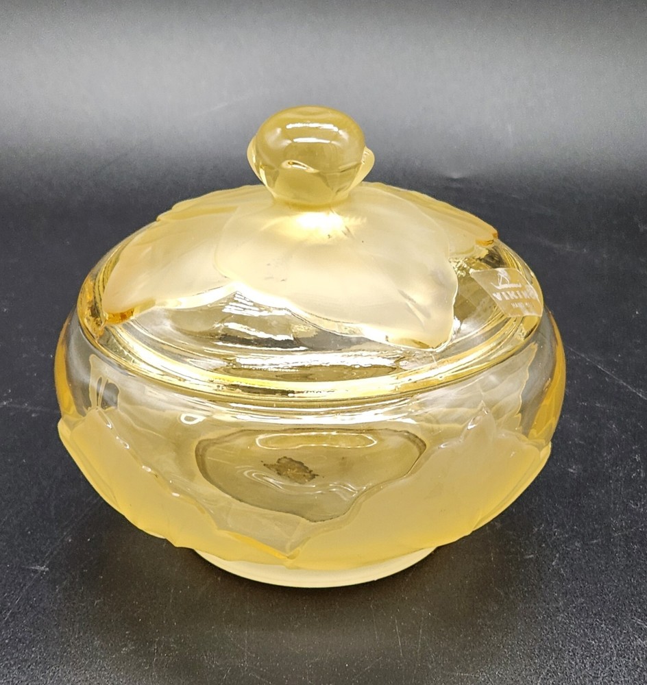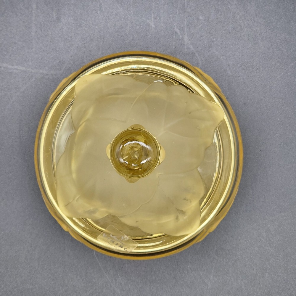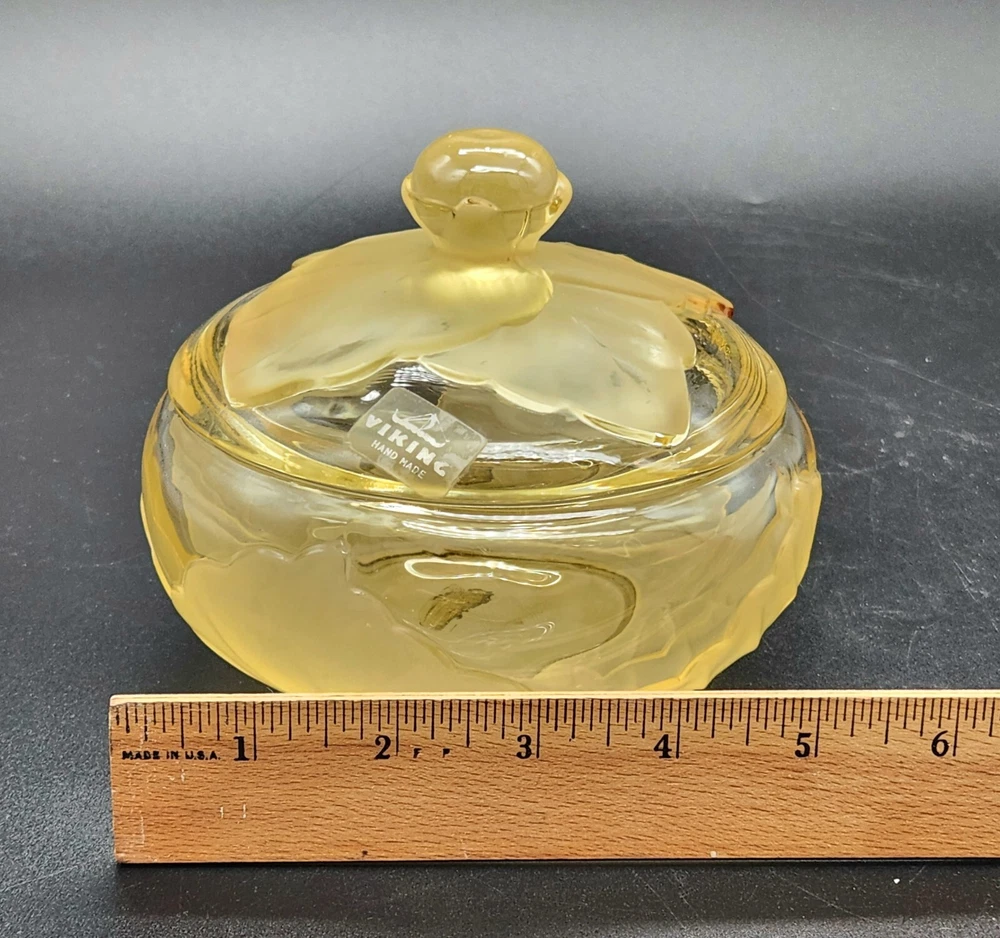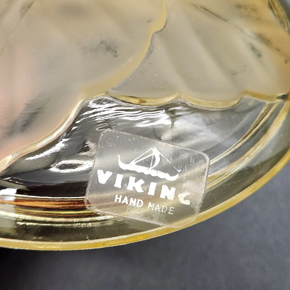 This dish isn't just a vessel—it's a nature-inspired masterpiece, crafted by real Vikings-well, Viking employees. Who knew cabbage leaves could be so classy? Store your plunder or hide your candy stash; either way, it's a keeper. • Hand made glass dish • Cabbage leaf design with lid • Vibrant yellow hue • Intricate detailing Used and in good condition. A fleabite chip on the inside rim of the lid. A few worn areas on the satin finish and some spots in the glass from the blowing process. See photos for details.