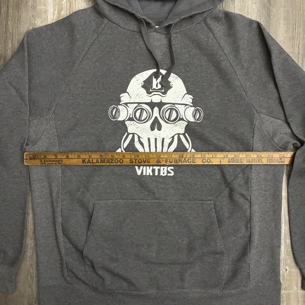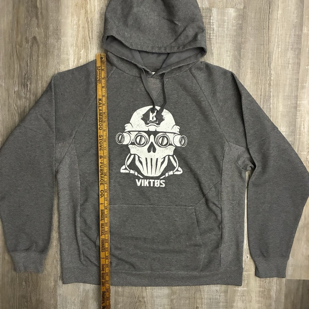The Viktos Fallback Foureyes Hoodie Sweatshirt in Mens size Large features a solid gray color with a logo accent, making it a versatile option for various outdoor activities such as hunting, yoga, and running. Made of breathable cotton knit fabric, this hoodie is suitable for all seasons and offers a regular fit for comfort. With a drawstring closure and long sleeves, it provides a classic and sporty look while being machine washable for easy care.