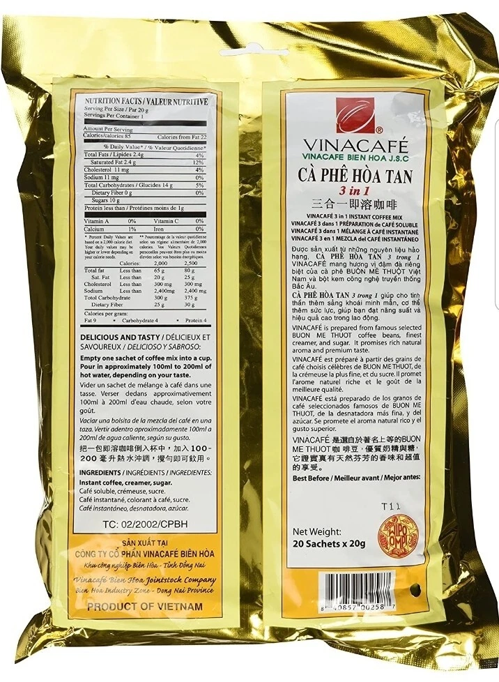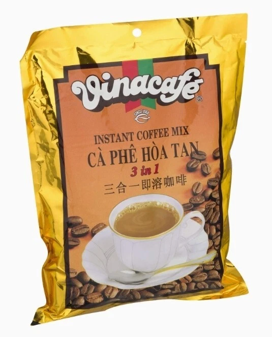 1 Bag - Vinacafe Instant Coffee Mix 3 in 1 Vinacafe Original Gold 3 in 1 Vietnam Instant Coffee Vinacafe Original 3 in 1 vinacafe is the instant coffee made from the best eight kinds of Vietnamese coffee beans . This coffee company has a long history in Vietnam since 1968. Made in Vietnam by vinacafe Ingredients: Instant coffee (14%), sugar, cream powder without milk, maltodextrin, caramel sugar, salt, natural coffee flavor, natural milk flavor.