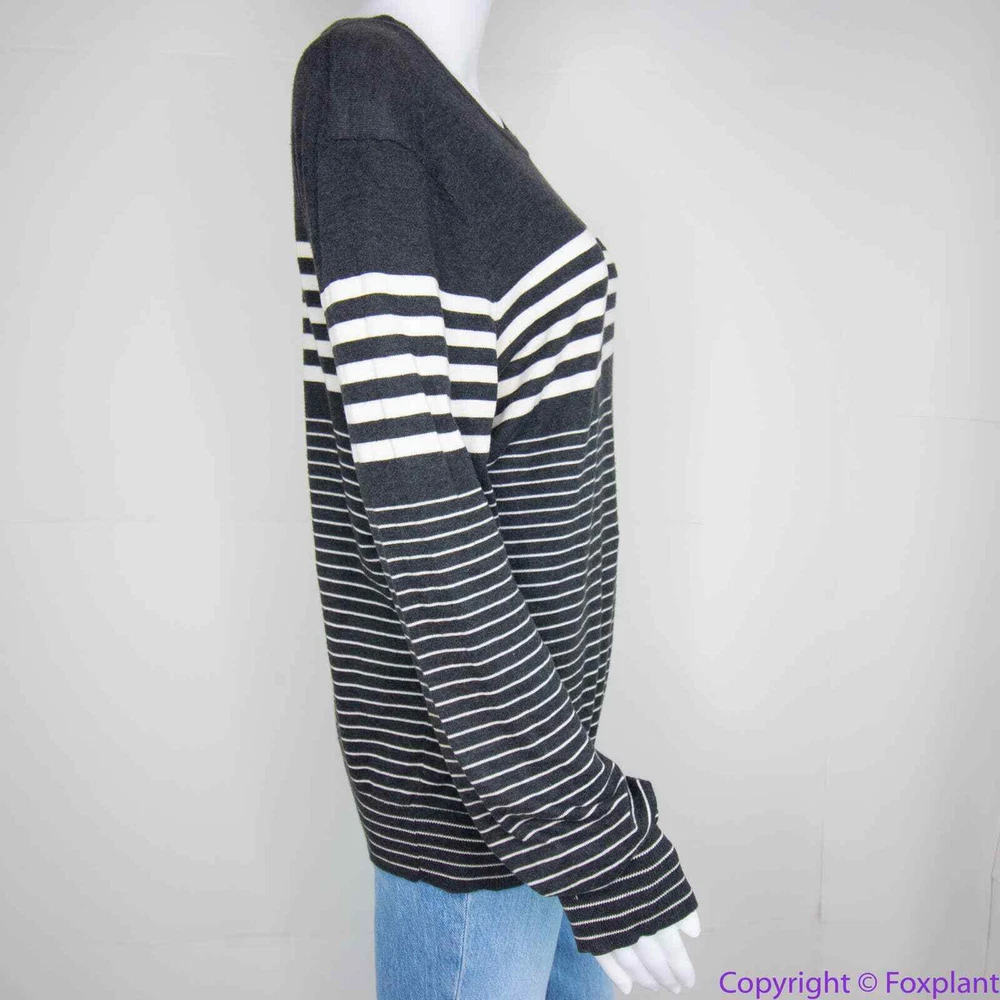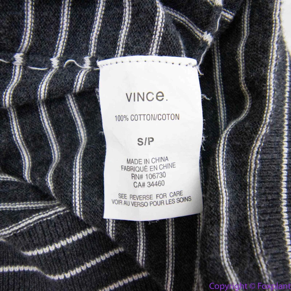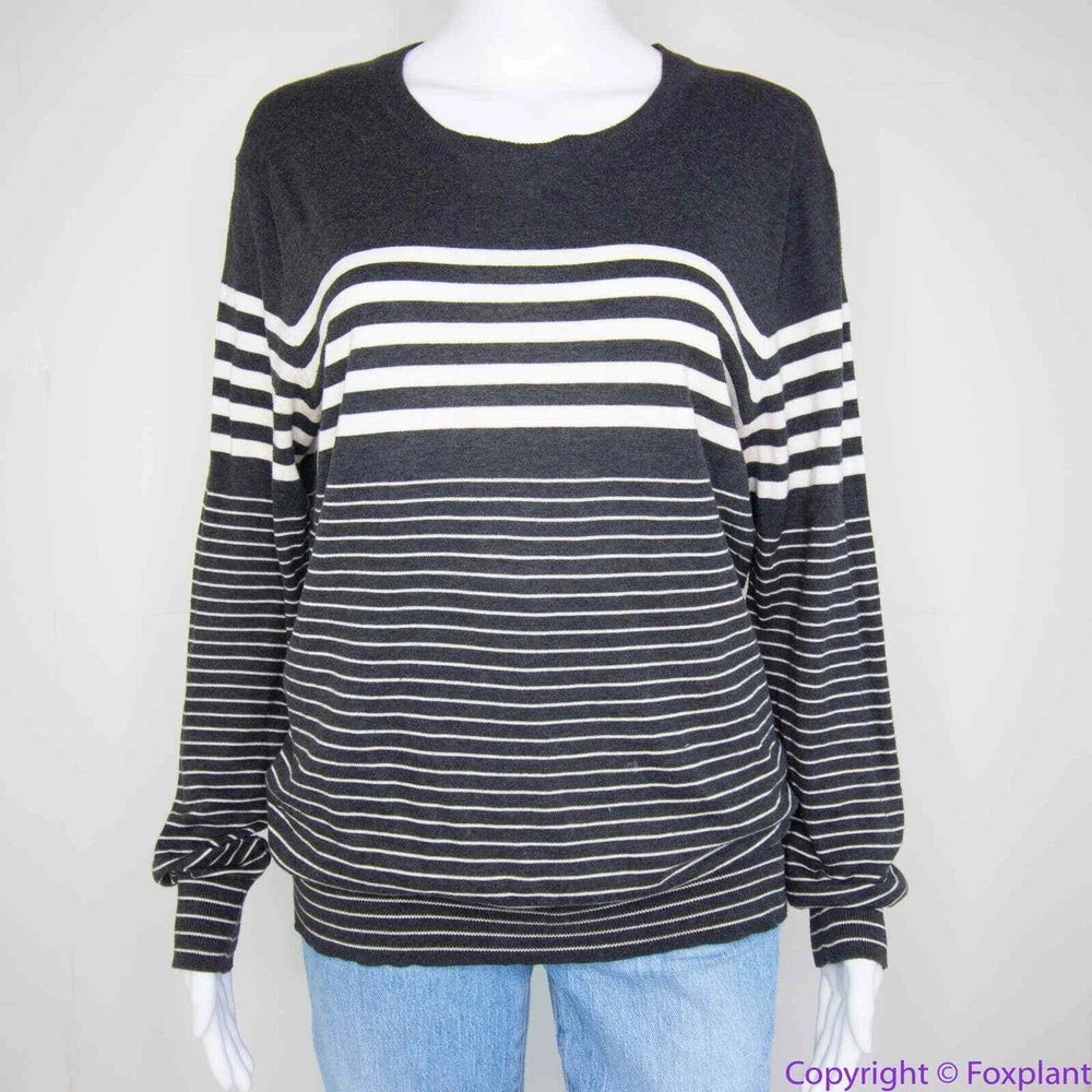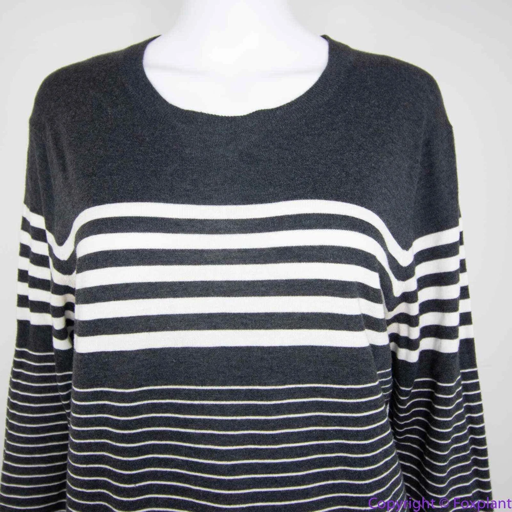 Vince 100% cotton grey stripe crewneck sweater, L crewneck stripes long sleeve ribbed cuff Color: gray, white Size L, please check laid flat measurements. Shoulder(seam to seam): 17 3/4 '' Bust(armpit to armpit): 20 1/2'' Length (from high point of shoulder down): 26 1/2'' Sleeve(shoulder seam to hem): 25 1/2'' Measurements are approximate and provided as a courtesy, not a guarantee of fit. Excellent condition. No noticeable flaws or stains or damages.
