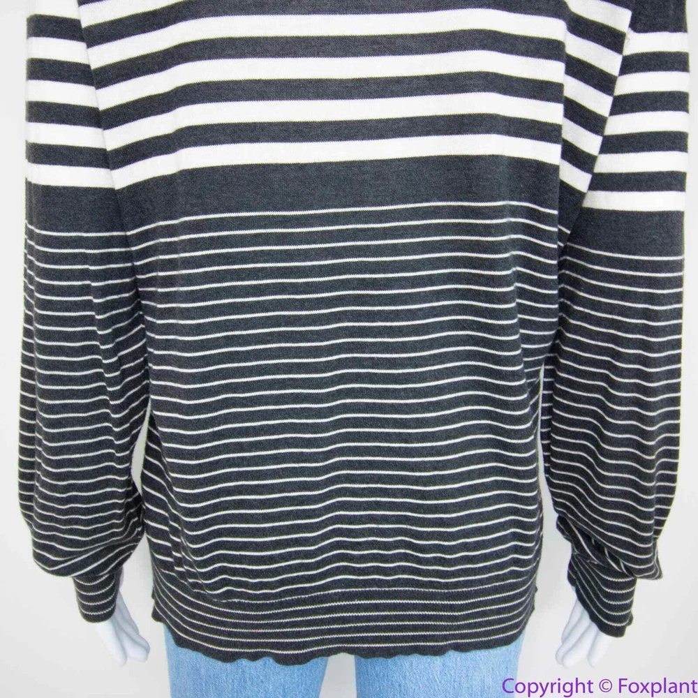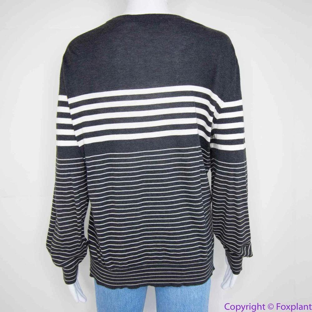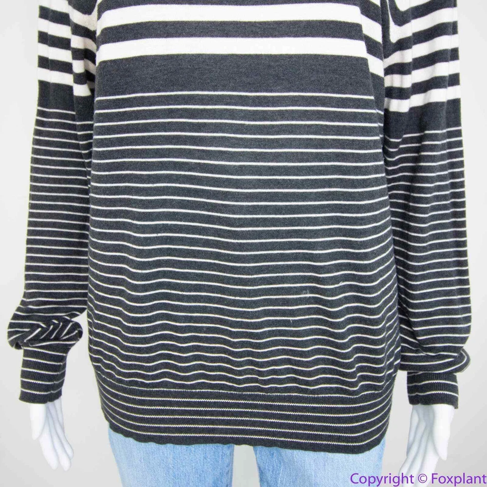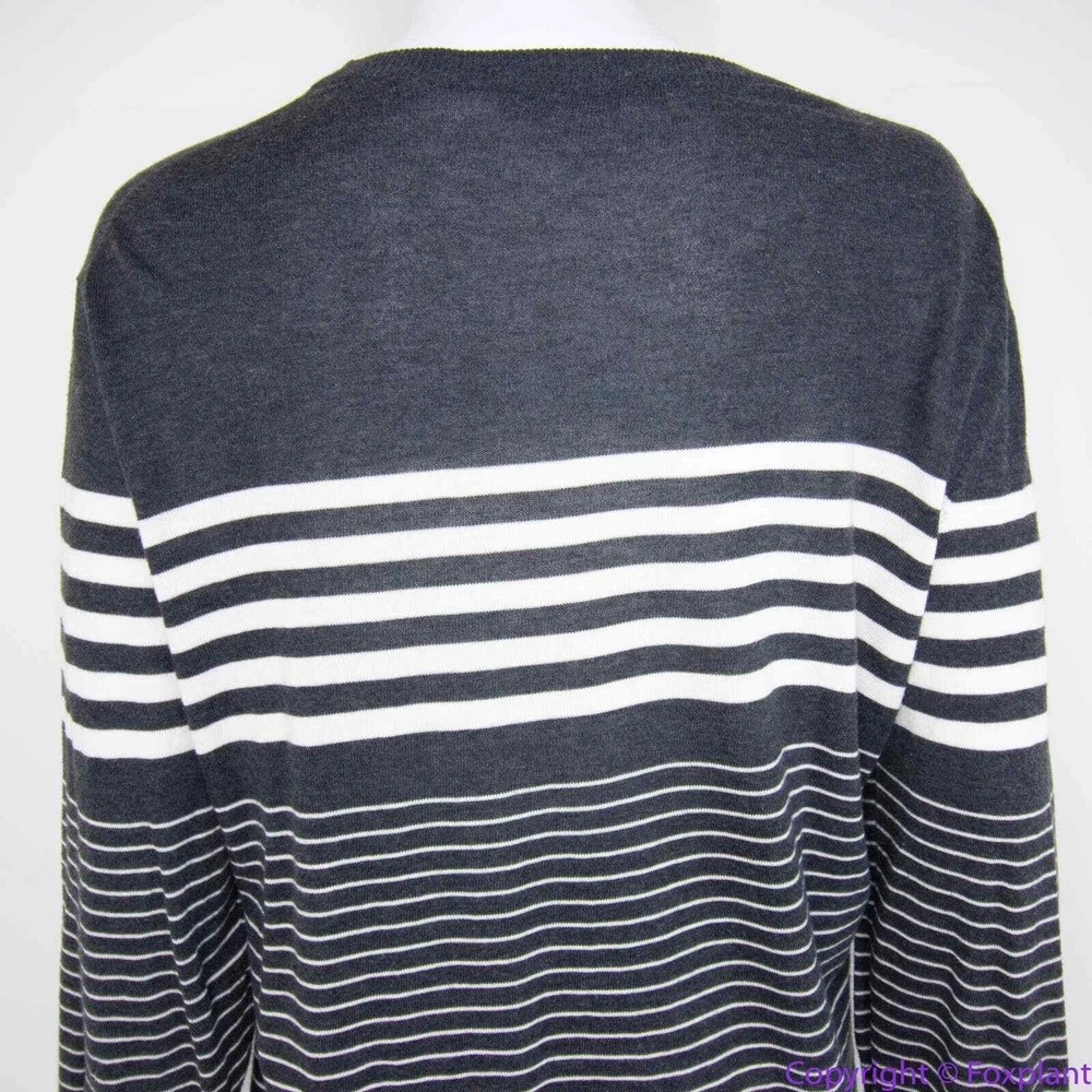 Vince 100% cotton grey stripe crewneck sweater, L crewneck stripes long sleeve ribbed cuff Color: gray, white Size L, please check laid flat measurements. Shoulder(seam to seam): 17 3/4 '' Bust(armpit to armpit): 20 1/2'' Length (from high point of shoulder down): 26 1/2'' Sleeve(shoulder seam to hem): 25 1/2'' Measurements are approximate and provided as a courtesy, not a guarantee of fit. Excellent condition. No noticeable flaws or stains or damages.