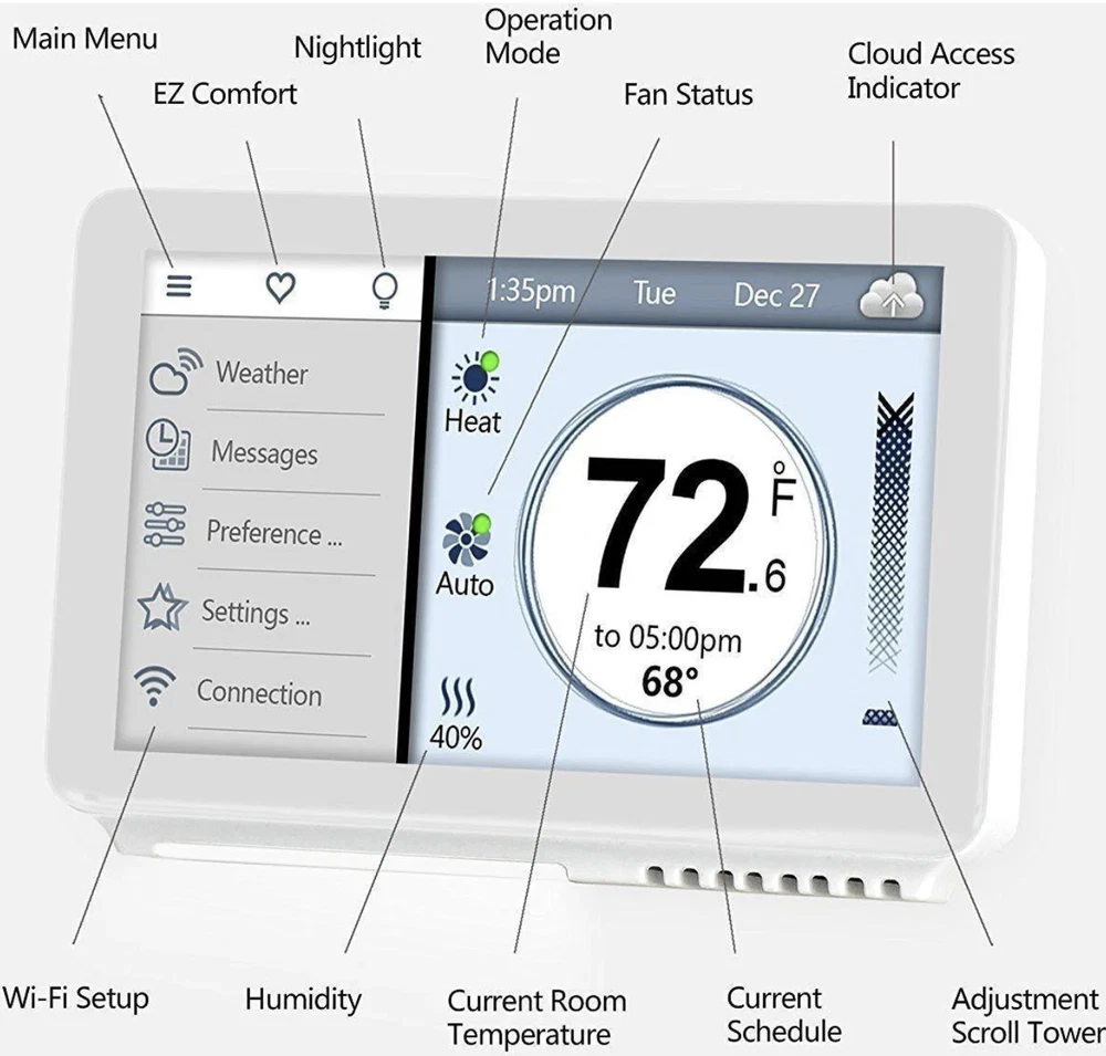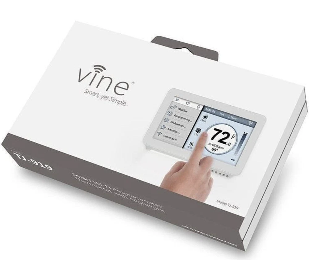 ABOUT THIS ITEM The Vine Model-919 thermostat is one of the best budget smart thermostats. With the Vine thermostat, you can get an up-to-date weather report and even view hourly or 5-day forecasts. Set up a daily program to optimize your home's temperature to meet your daily schedule and lifestyle needs. The thermostat can also act as a nightlight at night with its nightlight on the bottom that makes the thermostat easy to find at night. Additionally, with the free iOS or Android App, you can create advanced programs or control the home's temperature from anywhere at anytime. Plus, with Vine's premium cloud services, receive alerts for severe weather conditions and excessive temperatures, receive reminders to change your HVAC equipment filters, or to set up service calls as needed. Features: Nightlight on bottom of thermostat for easy access during the night 4.5" inch LCD Touch Screen 7-Day Programmable Mobile remote Accessibility (Android and iOS) Multiple Layers of Security Encryption No Batteries required In the Box: Vine Wi-fi Thermostat 2 x screws and anchors Flathead screwdriver Jumper wire SHIPPING We strive to ensure your package arrives quickly and efficiently. However, please be aware that factors like weather, increased postal volume, and carrier performance are beyond our control. We provide free shipping to the contiguous 48 states and typically dispatch orders within 2 business days of payment, often sooner. Unfortunately, we cannot deliver to P.O. Boxes—please provide a physical address. For international shipping, we utilize eBay's Global Shipping Program. Items are shipped to Kentucky (KY) and then forwarded to the final destination. International buyers are responsible for all applicable duties and taxes. To calculate shipping costs to your country, continue through eBay's checkout process. Please direct all inquiries regarding the Global Shipping Program to eBay directly. RETURNS We offer a 15-day return policy for unopened or unused items. Buyers are responsible for return shipping costs and a 15% restocking fee unless the item arrives defective. Returns are not accepted for items shipped outside the United States. CUSTOMER SATISFACTION Your satisfaction is our top priority! If you encounter any issues, please reach out to us directly. We’re here to assist and resolve any concerns. ABOUT US At Shopshomesupply , we specialize in smart thermostats and accessories designed to enhance comfort, energy efficiency, and home automation. We offer top-quality products from trusted brands at competitive prices. Our goal is to provide reliable solutions with excellent customer service, fast shipping, and expert support. Upgrade your home effortlessly with Shopshomesupply . The product manual is available for download on the website.