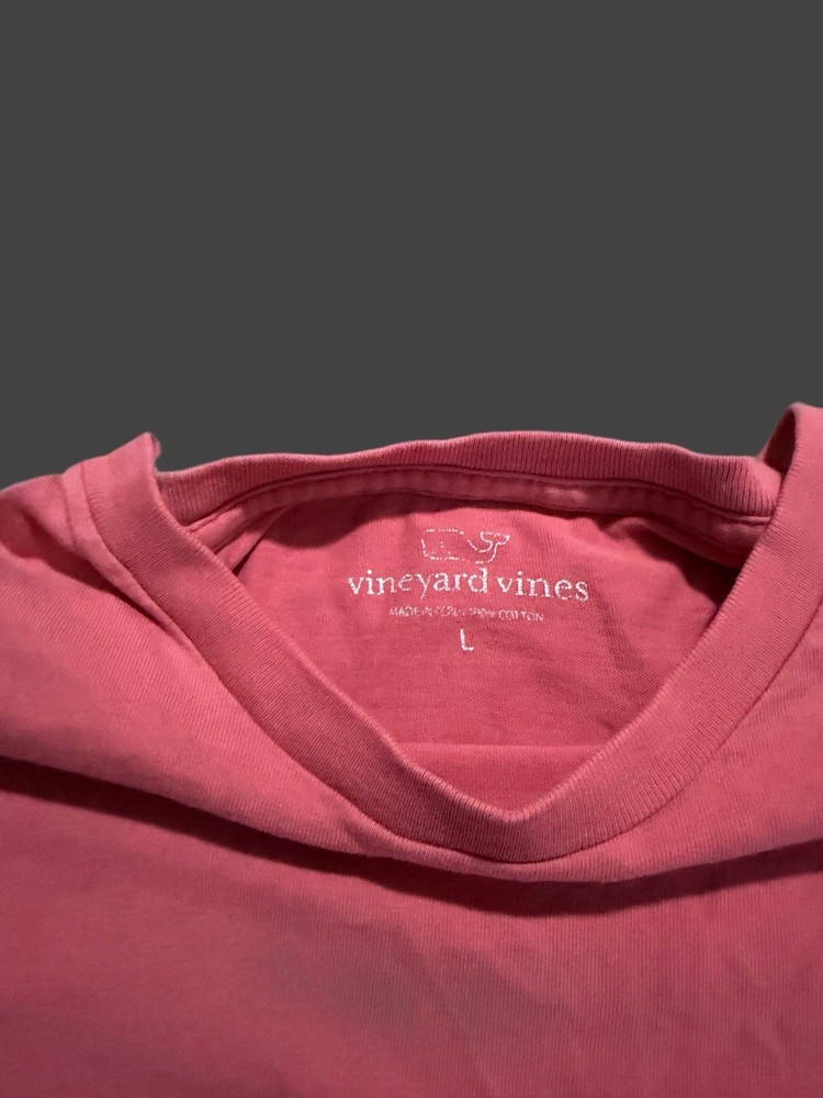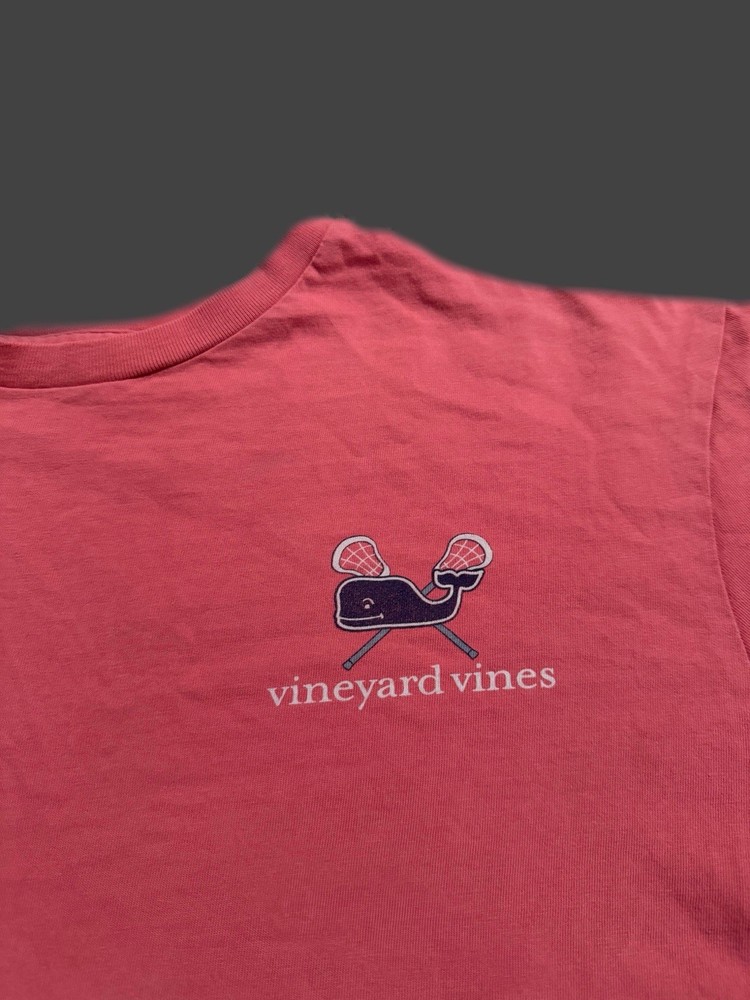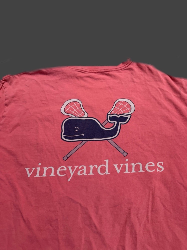 The Vineyard Vines Men's Pink Lacrosse Graphic Short Sleeve T Shirt in size L is a stylish and comfortable addition to any man's wardrobe. Made of cotton, this regular fit shirt features a solid pink color with a crew neckline and short sleeves. The shirt is machine washable and showcases the brand's signature fish and preppy theme, making it a versatile piece that can be worn casually or dressed up for a sporty look. Perfect for men who appreciate quality and style in their clothing choices.