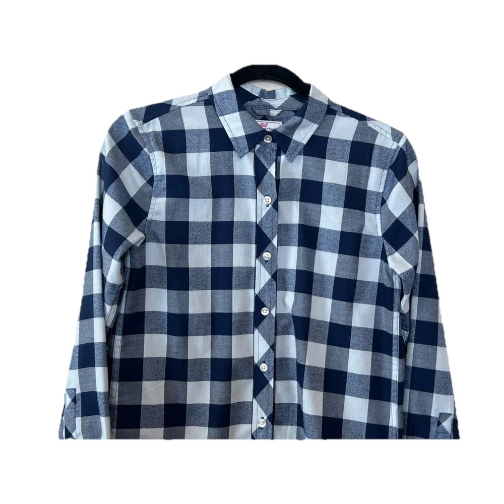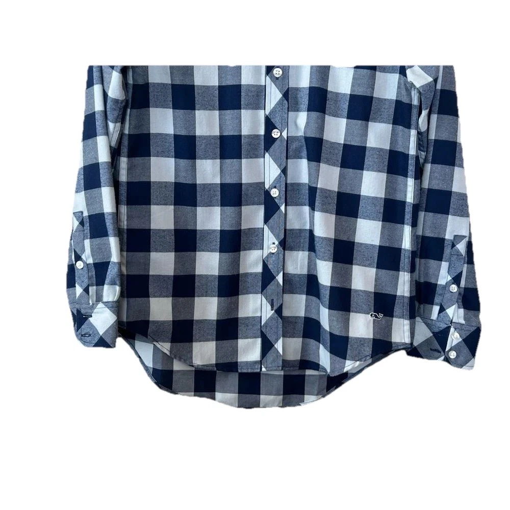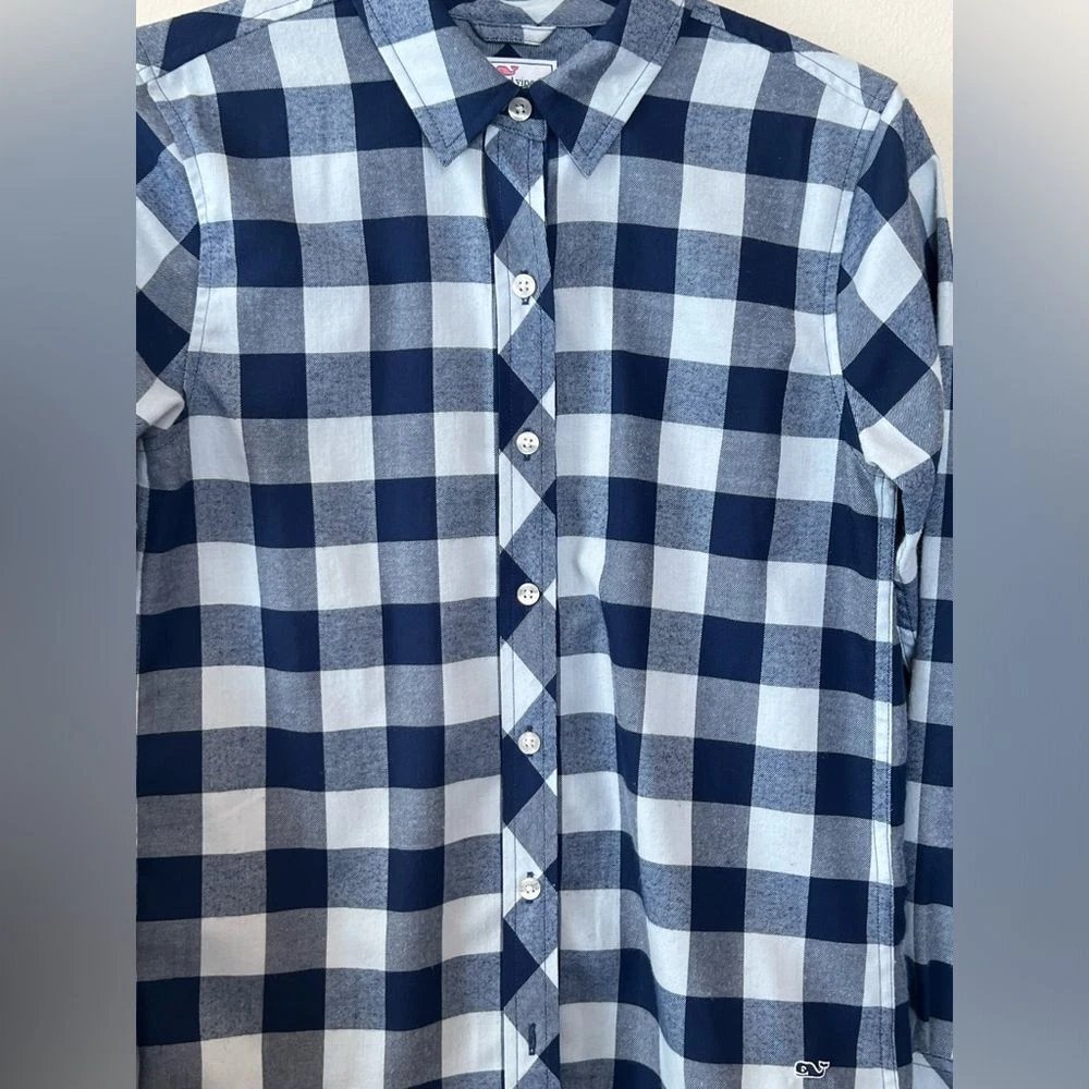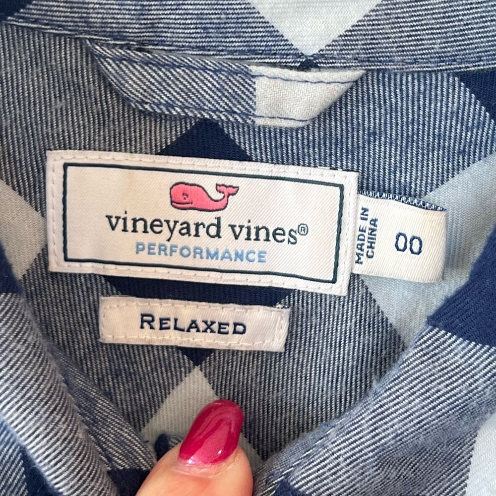 Vineyard Vines performance, relaxed fit button up plaid/flannel shirt.Rounded hem, soft to the touch, light weight, no stretch.Condition- EUC-Size-00 Color - shades of blue, white Measurements approximately: PTP- inches- -16 Overall length- inches- 25 Material Content- blend of: 100% polyester My items are primarily thrifted and I do my very best to note any imperfections/callouts. My items are stored in a pet/smoke free home All reasonable offers are always welcomed and considered. I answer questions ASAP. Thanks for stopping in and looking! Lisa