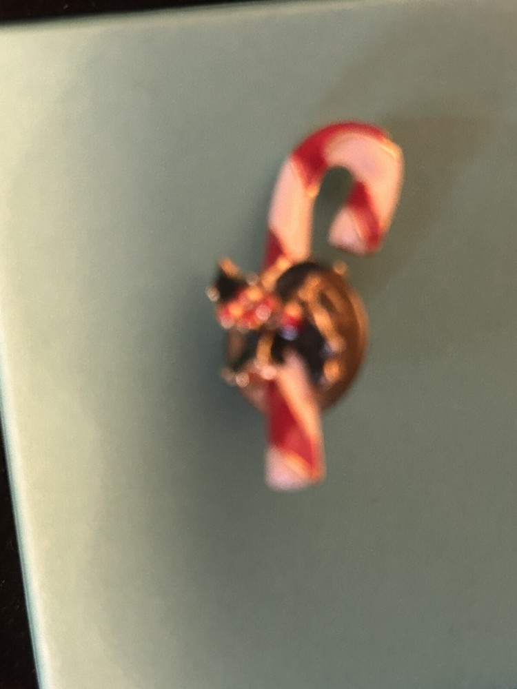 This vintage brooch pin features a festive design of a candy cane and holly, measuring 1 inch tall. It comes with a gift box for convenient gifting or storage. The brooch is a charming accessory that adds a touch of holiday spirit to any outfit, making it a perfect choice for those who appreciate vintage and antique jewelry pieces with a nostalgic flair. With its timeless design and thoughtful packaging, this brooch would make a lovely gift for someone special or a delightful addition to your own collection.