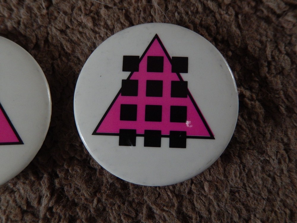 This vintage pink triangle LGBTQ+ pinback button, measuring 1.75" in diameter, is a collectible item that represents LGBTQ+ pride. Made in the United States, this pin showcases a bold design and vibrant color scheme. It would make a great addition to any pin collection or could be worn as a statement accessory to show support for LGBTQ+ rights and visibility. THESE 2 PINS ARE IN VERY NICE VINTAGE CONDITION. THEY MEASURE 1 3/4'' IN DIAMETER. MARKED ON THE SIDE OF PIN ''NATIONAL FLAG AND BANNER CO., 913 ARCH ST., PHILA. PA. ESTATE SALE FINDS. MESSAGE ANY OTHER QUESTIONS AND THANKS FOR LOOKING