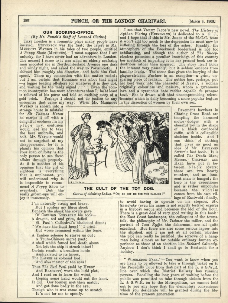 It is hard to escape the legacy of the Punch Magazine. From 1841 to 2002, the magazine cast a satirical eye on life in Britain. It charted the interests, concerns and frustrations of the country and today it stands as an invaluable resource not just as cartoon art and satire, but for social historians . THE CULT OF THE TOY DOG Chorus of Admiring Ladies "Oh, Do Le Me See the Darling!" Using a microscope for viewing small dog (Satire) Illustration by George Morrow Full size: 3 5/8 X 3 1/4 inches, excluding margins and lower text. Backside with unrelated text. Full page image in second scan, 8 x 10 1/2 inches. NOTE THIS IS A VERY SMALL CARTOON AND WILL BE MAILED FOLDED FIRST CLASS LETTER, WITHOUT AFFECTING THE CARTOON AND LEAVING 1/2 INCH BORDER UNAFFECTED IF FRAMING IS DESIRED. IF YOU DON'T WANT THIS, YOU CAN PAY FULL SHIPPING CHARGES (4.00) AND IT WILL BE MAILED IN AN ARCHIVAL SLEEVE FLAT. THE OPTION IS YOURS. Source: PUNCH Magazine , March 4, 1908 Condition: still bright paper, clean, unrelated text on verso. For framing. I have other hard-to-find original Punch cartoon illustrations for sale. Combine orders with no extra shipping fees. Punch , a magazine of humor and satire, ran from 1841-2002. A very British institution renowned internationally for its wit and irreverence, it helped to coin the term "cartoon" in its modern sense as a humorous illustration. ---------------------------------------------------------------------------------- Questions welcome. Extra images can be added by request. International shipping available. All orders are carefully packaged for safe delivery. Experienced full time professional bookseller since 1994; print, map and poster seller since 2000.