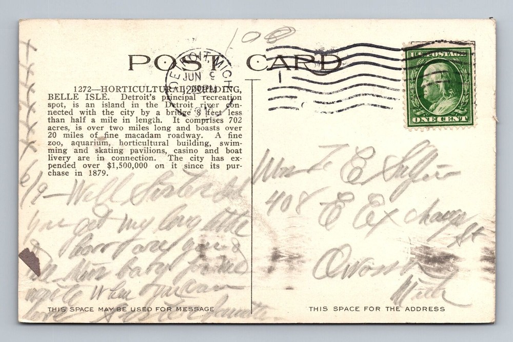 Vintage 1911 Detroit MI Horticultural Hall Belle Isle Postcard