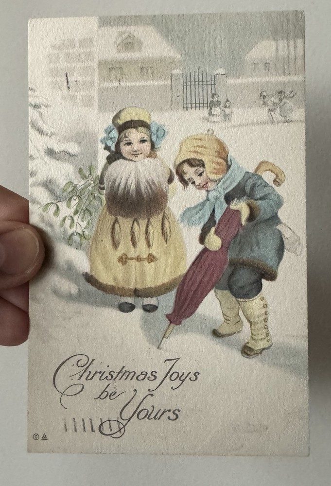 HomeVintage 1915 Christmas Postcard - Girls in Snow with Umbrella and Hand Muff
