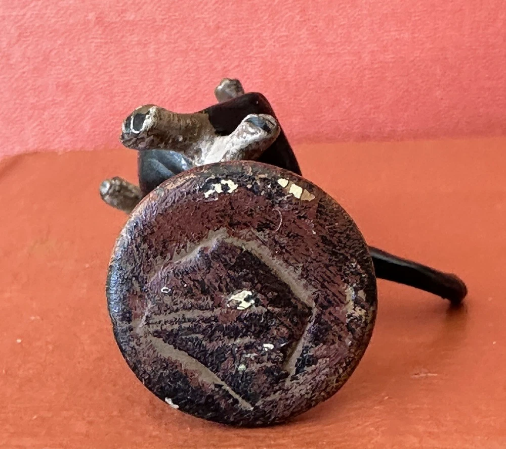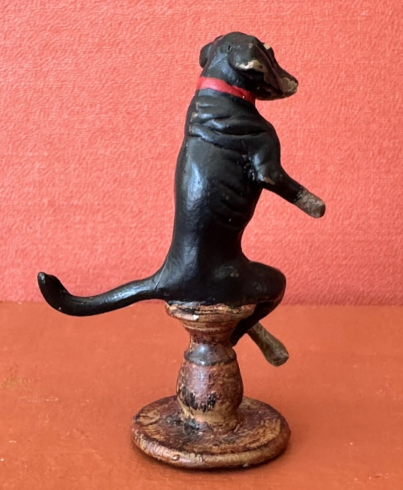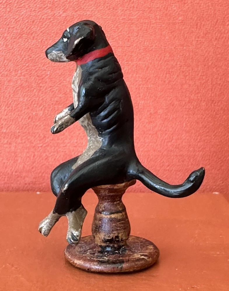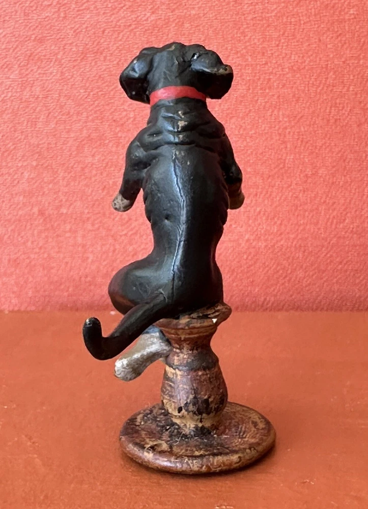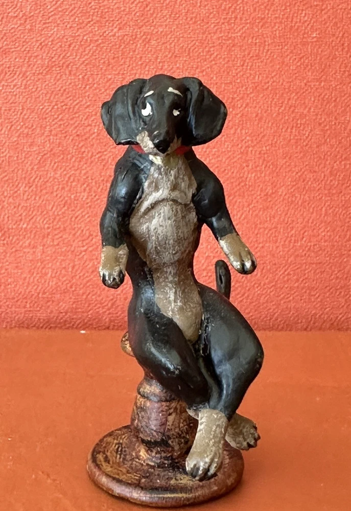 Charming, and fun, vintage 1930s Austrian, Bergmann style Dachound or Weiner dog bronze statue or figure. No markings. This cutie measures 1” 7/8 inches tall. The base measures 5/8 inches by 5/8 inches wide. c. 1930s. It’s in good condition. There is some paint loss on the bottom of its base on the back of the base as well as a few spots on the Dachound’s body and head. All shown in the photos. Add this cutie to your Austrian bronze collection today. Perfect for dog or Weiner dog fans and collectors. Offering free shipping, thanks for your interest!
