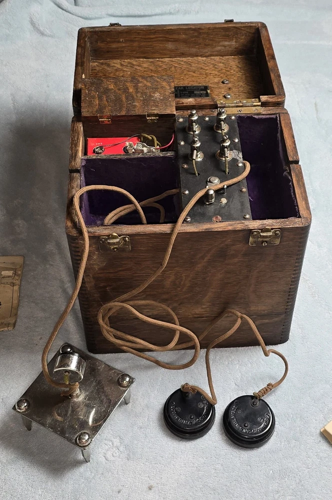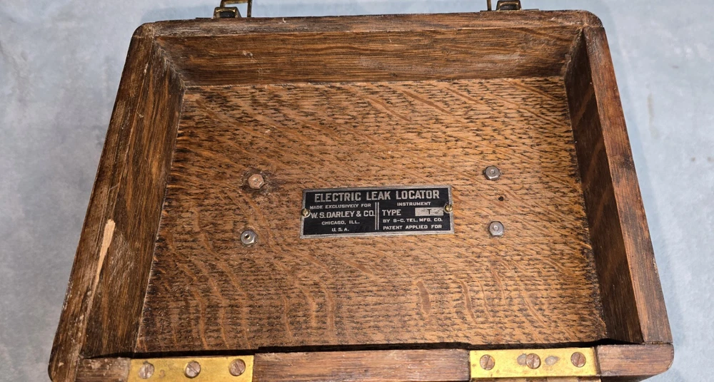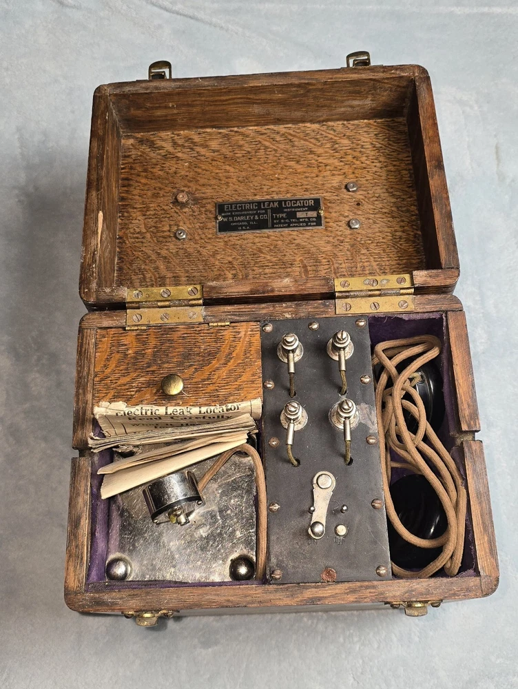 This vintage 1930s electric leak detector by WS Darley of Chicago is a must-have for any collector of unique tools. It features Stromberg Carlson receivers and is complete with instructions. Very rare. Sold as is. See pictures for details.